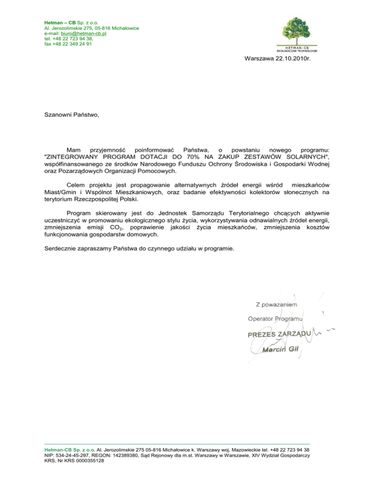 Hetman – CB Sp. z o.o. Al. Jerozolimskie 275, 05-816 Michałowice e-mail: [email protected] tel. +48 22 723 94 38, fax +48 22 349 24 91 Warszawa 22.10.2010r. Szanowni Państwo, Mam przyjemność poinformować Państwa, o powstaniu nowego programu: "ZINTEGROWANY PROGRAM DOTACJI DO 70% NA ZAKUP ZESTAWÓW SOLARNYCH", współfinansowanego ze środków Narodowego Funduszu Ochrony Środowiska i Gospodarki Wodnej oraz Pozarządowych Organizacji Pomocowych. Celem projektu jest propagowanie alternatywnych źródeł energii wśród mieszkańców Miast/Gmin i Wspólnot Mieszkaniowych, oraz badanie efektywności kolektorów słonecznych na terytorium Rzeczpospolitej Polski. Program skierowany jest do Jednostek Samorządu Terytorialnego chcących aktywnie uczestniczyć w promowaniu ekologicznego stylu życia, wykorzystywania odnawialnych źródeł energii, zmniejszenia emisji CO2, poprawienie jakości życia mieszkańców, zmniejszenia kosztów funkcjonowania gospodarstw domowych. Serdecznie zapraszamy Państwa do czynnego udziału w programie. Z poważaniem Operator Programu _______________________________________________________________________________________________ Hetman-CB Sp. z o.o. Al. Jerozolimskie 275 05-816 Michałowice k. Warszawy woj. Mazowieckie tel. +48 22 723 94 38 NIP: 534-24-45-297, REGON: 142389380, Sąd Rejonowy dla m.st. Warszawy w Warszawie, XIV Wydział Gospodarczy KRS, Nr KRS 0000355128 Zintegrowany Program Dotacji do 70% na zakup zestawów solarnych. Strona 1 z 5 §1 ZAŁOŻENIA PROGRAMOWE 1. Zintegrowany Program Dotacji do 70% na zakup zestawów solarnych, zwany dalej „Programem” realizowany jest przez operatora programu w porozumieniu z Fundacją Poszanowania Energii oraz przy współpracy organizacyjnej z Urzędem Miasta/Gminy. 2. Ilość środków przeznaczona na dotację do zakupu zestawów solarnych objętych Programem jest ograniczona. Decyduje kolejność zgłoszeń. 3. W ramach Programu operator wykonuje nieodpłatną wycenę instalacji u beneficjenta oraz sporządza nieodpłatnie projekt instalacji (nie dotyczy wspólnoty mieszkaniowej). 4. Operator przygotowuje dokumenty niezbędne do przedłożenia w banku celem uzyskania dotacji. 5. Samorząd Gminy wspiera Program poprzez szerokie informowanie mieszkańców o istnieniu Programu, organizowanie spotkań z mieszkańcami oraz zapisuje chętnych mieszkańców. – patrz załącznik nr 1. 6. Operatorem i koordynatorem Programu jest firma Hetman–CB Sp. z o.o. 7. Dostawcami zestawów solarnych są liderzy rynkowi produkujący zestawy solarne legitymujący się odpowiednimi certyfikatami. Lista producentów dostępna jest u operatora Programu. 8. Instalatorami zestawów solarnych są monterzy autoryzowani przez operatora. §2 CEL PROGRAMU 1. Program skierowany jest do beneficjentów, którzy dokonają zakupu zestawu solarnego certyfikowanego przez operatora, w ramach zintegrowanego Programu Dotacji do 70% na zakupu zestawów solarnych. 2. Dotacja do 70% jest dotacją dwufazową. • Pierwsza część dotacji do 45% udzielana jest na zasadach określonych w Programie NFOŚiGW dostępnego na stronie internetowej NFOŚiGW http://www.nfosigw.gov.pl/. ”Program określa m.in. budżet programu, wysokość dotacji, terminy składania wniosków oraz szczegółowe kryteria wyboru przedsięwzięć, a także wskazuje koszty kwalifikowane przedsięwzięcia, jakie mogą być objęte kredytem.” • Druga część dotacji do 25% udzielana jest przez operatora programu. Operator Programu dzięki porozumieniu z Fundacją Poszanowania Energii tworzy fundusz na dofinansowania instalacji solarnych dla uczestników Programu. Dotacja pokrywa maksymalnie do 25% kosztów zakupu zestawu solarnego i ma charakter umowy cywilno–prawnej, Strona 2 z 5 • Umowa dotyczy przeprowadzenia badań statystycznych o efektywności kolektorów słonecznych. • Beneficjent zobowiązuje się do dostarczenia wyników w/w badań na specjalnym druku do w/w umowy w terminie ujętym w umowie. 3. Wyplata dotacji do 25% następuje po podpisaniu i spełnieniu umowy cywilno–prawnej. 4. Dotacja do 25% sfinansowana zostanie przez operatora Programu. 5. Celem Programu jest uzyskanie przez beneficjenta dotacji do 70% na zakupu kompletnego zestawu solarnego oraz uzyskanie przez operatora informacji na temat efektywności kolektorów słonecznych na terytorium Polski 6. Beneficjentami Programu są: – Osoby fizyczne posiadające prawo do dysponowania jednorodzinnym lub wielorodzinnym budynkiem mieszkalnym, któremu służyć mają zakupione kolektory słoneczne lub – Wspólnoty mieszkaniowe instalujące kolektory słoneczne na własnych budynkach wielolokalowych (wielorodzinnych). §3 PRZEDMIOT PROGRAMU 1. Przedmiotem Programu jest dostarczenie, zainstalowanie i uruchomienie kompletnych zestawów solarnych do ogrzewania ciepłej wody użytkowej (c.w.u.) 2. Lista oraz skład i charakterystyki zestawów solarnych, objętych Programem dostępna jest u operatora Programu. 3. Wszystkie oferowane zestawy są fabrycznie nowe i spełniają warunki określone w Programie NFOŚiGW. 4. Gwarancje, płatności, terminy realizacji oraz wzajemne zobowiązania uczestników Programu, określają umowy zawierane pomiędzy operatorem a uczestnikiem Programu (beneficjentem) – patrz załączniki nr 3 i 4. 5. Urząd Miasta lub Gminy nie ponosi odpowiedzialności za działania operatora. Strona 3 z 5 §4 WARUNKI UCZESTNICTWA W PROGRAMIE 1. Do Programu może przystąpić każdy mieszkaniec Miasta/Gminy lub wspólnota mieszkaniowa instalująca kolektory słoneczne na własnych budynkach, spełniające warunki uczestnictwa określone, w programie NFOŚiGW oraz poniższe warunki określone przez operatora Programu: a) Beneficjent zadeklaruje udział w programie poprzez złożenie zgłoszenia o przystąpienie do Programu – patrz załącznik nr 5 a następnie, po wybraniu odpowiedniego zestawu, podpisze z operatorem umowy na zakup i montaż instalacji w celu skorzystania z Programu.