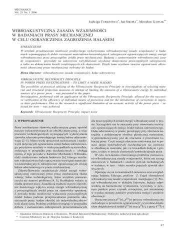MECHANICS Vol. 25 No. 1 2006 MECHANICS Vol. 25 No. 1 2006 Jadwiga TURKIEWICZ*, Jan SIKORA*, Miros³aw GAWLIK** WIBROAKUSTYCZNA ZASADA WZAJEMNOCI W BADANIACH PRASY MECHANICZNEJ W CELU OGRANICZENIA ZAGRO¯ENIA HA£ASEM STRESZCZENIE W artykule przedstawiono mo¿liwoæ praktycznego wykorzystania wibroakustycznej zasady wzajemnoci w badaniach wspomagaj¹cych dobór rozwi¹zañ materia³owo-konstrukcyjnych zabezpieczeñ ograniczaj¹cych emisjê energii wibroakustycznej przez poszczególne ród³a prasy mechanicznej. Badania z zastosowaniem wibroakustycznej zasady wzajemnoci pozwala³y na sukcesywne weryfikowanie uzyskanej skutecznoci poszczególnych zabezpieczeñ, a tak¿e na dokonywanie korekt zwiêkszaj¹cych ich skutecznoæ. Dziêki temu uzyskano znaczne ograniczenie aktywnoci akustycznej prasy mechanicznej wybranej do badañ. S³owa kluczowe: wibroakustyczna zasada wzajemnoci, ha³as uderzeniowy VIBROACOUSTIC RECIPROCITY PRINCIPLE IN POWER PRESS INVESTIGATIONS TO LIMIT A NOISE HAZARD The possibility of practical utilizing of the Vibroacoustic Reciprocity Principle in investigations of selecting material and structural protection measures in attempt of limiting the emission of a vibroacoustic energy by individual sources of a power press was presented in the paper. Investigations, performed with an application of the Vibroacoustic Reciprocity Principle, allowed for the successive verification of the efficiency of individual means of protection and for the introduction of corrections to improve their performance. Due to the research a significant limitation of an acoustic activity of the power press selected for tests was achieved. Keywords: Vibroacoustic Reciprocity Principle, impact noise 1. WPROWADZENIE Prasy mechaniczne stanowi¹ najliczniejsz¹ grupê sporód maszyn wykorzystywanych do obróbki plastycznej, a wiêc procesów technologicznych wymagaj¹cych wykorzystania zjawiska zderzenia powoduj¹cego emisjê ha³asu uderzeniowego [25]. Mimo wielu opracowañ technicznych i naukowych dotycz¹cych ograniczenia emisji ha³asu uderzeniowego, pozytywne rezultaty w wielu przypadkach s¹ niewielkie, zw³aszcza w przypadku pras mechanicznych z obs³ug¹ rêczn¹. Z tego powodu w Katedrze Mechaniki i Wibroakustyki zrealizowano zadanie badawcze [6], którego rezultatem wdro¿eniowym by³o opracowanie rozwi¹zañ materia³owo-konstrukcyjnych zabezpieczeñ ograniczaj¹cych emisjê ha³asu uderzeniowego w prasie mechanicznej. Zidentyfikowanie zasadniczych róde³ energii wibroakustycznej emitowanej przez prasê mechaniczn¹ (ha³as w³asny, ha³as technologiczny, ha³as urz¹dzeñ pomocniczych) nie stanowi problemu [4, 5]. Bezb³êdnie wska¿e te ród³a operator prasy. Zasadnicz¹ trudnoæ stanowi okrelenie ilociowego wp³ywu emisji energii wibroakustycznej z poszczególnych róde³ prasy na stanowisko operatora. Z powodu braku mo¿liwoci wy³¹czenia poszczególnych róde³ ha³asu podczas przeprowadzania pomiarów akustycznych prasy, trudno okreliæ ich indywidualn¹ aktywnoæ akustyczn¹. Podobny problem wystêpuje w przypadku doboru i zastosowania zabezpieczeñ przeciwha³asowych * ** dla poszczególnych róde³ energii wibroakustycznej w prasie. Szczególnie ma to znaczenie przy stosowaniu rozwi¹zañ ograniczaj¹cych emisjê róde³ ha³asu uderzeniowego. Ha³as uderzeniowy w prasie, powstaj¹cy przy zderzeniu narzêdzia z poddawanym obróbce plastycznej materia³em, wypromieniowywany jest do otoczenia z przestrzeni roboczej prasy. Czêæ energii zderzenia emitowana jest w postaci drgañ materia³owych rozchodz¹cych siê zarówno w obrabianym materiale, jak i w kowad³ach dolnym i górnym, a tak¿e w innych elementach konstrukcyjnych prasy. W celu rozwi¹zania omówionego problemu zastosowano wibroakustyczn¹ zasadê wzajemnoci, która ma szereg zastosowañ w badaniach i analizie zjawisk zachodz¹cych w technice, w tym tak¿e szeroko pojêtych zjawisk akustycznych. Opieraj¹c siê na rozwa¿aniach Liamszewa oraz uwzglêdniaj¹c badania Fahyego, profesor Z. Engel sformu³owa³ wibroakustyczn¹ zasadê wzajemnoci nastêpuj¹co [1]: Proces wibroakustyczny w uk³adzie liniowym, bêd¹cy odpowiedzi¹ na harmoniczne wymuszenia, wywo³any w pewnym punkcie przez czynnik zewnêtrzny, jest niezmienny w wyniku zamiany punktów przy³o¿enia energii i punktów obserwacji. Oznaczmy przez p(1)(r), p(2)(r) procesy wibroakustyczne zachodz¹ce w przestrzeni ograniczonej V, wywo³ane dzia³aniem objêtociowych róde³ q(1)(r) oraz q(2)(r), a przez F(1)(r) Akademia Górniczo-Hutnicza w Krakowie, Wydzia³ In¿ynierii Mechanicznej i Robotyki; [email protected] Centrum M³odzie¿y im. dr. Henryka Jordana w Krakowie 47 Jadwiga TURKIEWICZ, Jan SIKORA, Miros³aw GAWLIK WIBROAKUSTYCZNA ZASADA WZAJEMNOCI W BADANIACH PRASY MECHANICZNEJ... i F(2)(r) si³y dzia³aj¹ce na uk³ad, o kierunku normalnym n do powierzchni S. Sformu³owan¹ wczeniej wibroakustyczn¹ zasadê wzajemnoci mo¿na zapisaæ w postaci ⎡ ∂p(1) ( r ) (2) ∂p(2) ( r ) (1) ⎤ ( ) − F r F (r )⎥dS = ⎢ ∫∫ ∂n ∂n ⎦⎥ S ⎣⎢ Obszar III Obszar IV (1) = −iωρ∫∫∫ ⎡ q(1) p(2) (r ) − q(2) p(1) (r ) ⎤dV ⎣ ⎦ V gdzie: ω – czêstoæ ko³owa, ρ – gêstoæ orodka. Oparcie siê na wibroakustycznej zasadzie wzajemnoci umo¿liwi³o zidentyfikowanie wszystkich róde³ energii wibroakustycznej prasy mechanicznej z jednoczesnym okreleniem ilociowego wp³ywu emisji tej energii z ka¿dego ród³a na stanowisko pracy operatora. Zastosowanie tej metody pozwoli³o równie¿ uzyskaæ najbardziej korzystny efekt w ograniczeniu emisji energii wibroakustycznej przez prasê. W trakcie etapowego wdra¿ania poszczególnych zabezpieczeñ wykonywano równolegle z pomiarami podstawowymi pomiary akustyczne z wykorzystaniem wibroakustycznej zasady wzajemnoci [1]. Analiza wyników z kolejnych serii badañ pozwoli³a na okrelenie, jaki element prasy (ród³o) wymaga jeszcze skuteczniejszego zabezpieczenia wibroakustycznego, które zmniejszy jego n