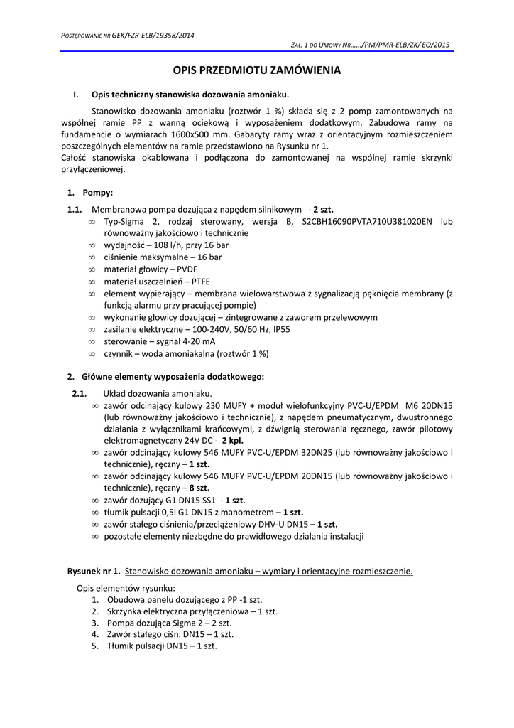 POSTĘPOWANIE NR GEK/FZR-ELB/19358/2014 ZAŁ. 1 DO UMOWY NR……/PM/PMR-ELB/ZK/ EO/2015 OPIS PRZEDMIOTU ZAMÓWIENIA I. Opis techniczny stanowiska dozowania amoniaku. Stanowisko dozowania amoniaku (roztwór 1 %) składa się z 2 pomp zamontowanych na wspólnej ramie PP z wanną ociekową i wyposażeniem dodatkowym. Zabudowa ramy na fundamencie o wymiarach 1600x500 mm. Gabaryty ramy wraz z orientacyjnym rozmieszczeniem poszczególnych elementów na ramie przedstawiono na Rysunku nr 1. Całość stanowiska okablowana i podłączona do zamontowanej na wspólnej ramie skrzynki przyłączeniowej. 1. Pompy: 1.1. Membranowa pompa dozująca z napędem silnikowym - 2 szt. • Typ-Sigma 2, rodzaj sterowany, wersja B, S2CBH16090PVTA710U381020EN lub równoważny jakościowo i technicznie • wydajność – 108 l/h, przy 16 bar • ciśnienie maksymalne – 16 bar • materiał głowicy – PVDF • materiał uszczelnień – PTFE • element wypierający – membrana wielowarstwowa z sygnalizacją pęknięcia membrany (z funkcją alarmu przy pracującej pompie) • wykonanie głowicy dozującej – zintegrowane z zaworem przelewowym • zasilanie elektryczne – 100-240V, 50/60 Hz, IP55 • sterowanie – sygnał 4-20 mA • czynnik – woda amoniakalna (roztwór 1 %) 2. Główne elementy wyposażenia dodatkowego: 2.1. • • • • • • • Układ dozowania amoniaku. zawór odcinający kulowy 230 MUFY + moduł wielofunkcyjny PVC-U/EPDM M6 20DN15 (lub równoważny jakościowo i technicznie), z napędem pneumatycznym, dwustronnego działania z wyłącznikami krańcowymi, z dźwignią sterowania ręcznego, zawór pilotowy elektromagnetyczny 24V DC - 2 kpl. zawór odcinający kulowy 546 MUFY PVC-U/EPDM 32DN25 (lub równoważny jakościowo i technicznie), ręczny – 1 szt. zawór odcinający kulowy 546 MUFY PVC-U/EPDM 20DN15 (lub równoważny jakościowo i technicznie), ręczny – 8 szt. zawór dozujący G1 DN15 SS1 - 1 szt. tłumik pulsacji 0,5l G1 DN15 z manometrem – 1 szt. zawór stałego ciśnienia/przeciążeniowy DHV-U DN15 – 1 szt. pozostałe elementy niezbędne do prawidłowego działania instalacji Rysunek nr 1. Stanowisko dozowania amoniaku – wymiary i orientacyjne rozmieszczenie. Opis elementów rysunku: 1. Obudowa panelu dozującego z PP -1 szt. 2. Skrzynka elektryczna przyłączeniowa – 1 szt. 3. Pompa dozująca Sigma 2 – 2 szt. 4. Zawór stałego ciśn. DN15 – 1 szt. 5. Tłumik pulsacji DN15 – 1 szt. POSTĘPOWANIE NR GEK/FZR-ELB/19358/2014 ZAŁ. 1 DO UMOWY NR……/PM/PMR-ELB/ZK/ EO/2015 6. 7. 8. 15. Zawór odcinający pneumatyczny DN15 – 2 szt. Zawór odcinający DN15 – 8 szt. Zawór odcinający DN25 – 1 szt. Zawór odcinający DN15 – 2 szt. POSTĘPOWANIE NR GEK/FZR-ELB/19358/2014 ZAŁ. 1 DO UMOWY NR……/PM/PMR-ELB/ZK/ EO/2015 II. Opis techniczny stanowiska dozowania amoniaku i kotaminy. Stanowisko dozowania amoniaku (roztwór 1 %) i kotaminy C (roztwór 10 %) składa się z 3 pomp zamontowanych na wspólnej ramie PP z wanną ociekową i wyposażeniem dodatkowym. Zabudowa ramy na fundamencie o wymiarach 1600x500 mm. Gabaryty ramy wraz z rozmieszczeniem poszczególnych elementów na ramie przedstawiono na Rysunku nr 2 (dostawa nie obejmuje wskazanego na rysunku zbiornika na kotaminę C). Całość stanowiska okablowana i podłączona do zamontowanej na wspólnej ramie skrzynki przyłączeniowej. 1. Pompy: 1.1. • • • • • • • • • • 1.2. • • • • • • • • • Membranowa pompa dozująca z napędem silnikowym - 2 szt. typ - Sigma 2, rodzaj sterowany, wersja B, S2CBH16090PVTA710U381020EN lub równoważny jakościowo i technicznie wydajność – 108 l/h, przy 16 bar ciśnienie maksymalne – 16 bar materiał głowicy – PVDF materiał uszczelnień – PTFE element wypierający – membrana wielowarstwowa z sygnalizacją pęknięcia membrany (z funkcją alarmu przy pracującej pompie) wykonanie głowicy dozującej – zintegrowane z zaworem przelewowym zasilanie elektryczne – 100-240V, 50/60 Hz, IP55 sterowanie – sygnał 4-20 mA czynnik – woda amoniakalna (roztwór 1 %) Elektromagnetyczna pompa dozująca - 1 szt. typ - Gamma/L, rodzaj sterowany, GALA1602PVT300U3C03000 lub równoważny jakościowo i technicznie wydajność – 2,1 l/h, przy 16 bar ciśnienie maksymalne – 16 bar materiał głowicy – PVDF materiał uszczelnień – PTFE element wypierający – membrana standardowa zasilanie elektryczne – 100-240V, 50/60 Hz, IP55 sterowanie – sygnał 4-20 mA czynnik – kotamina C (roztwór 10 %) 2. Główne elementy wyposażenia dodatkowego: 2.1. Układ dozowania amoniaku. • zawór odcinający kulowy 230 MUFY + moduł wielofunkcyjny PVC-U/EPDM M6 20DN15 (lub równoważny jakościowo i technicznie), z napędem pneumatycznym, dwustronnego działania z wyłącznikami krańcowymi, z dźwignią sterowania ręcznego, zawór pilotowy elektromagnetyczny 24V DC - 2 kpl. • zawór odcinający kulowy 546 MUFY PVC-U/EPDM 32DN25 (lub równoważny jakościowo i technicznie), ręczny – 1 szt. POSTĘPOWANIE NR GEK/FZR-ELB/19358/2014 ZAŁ. 1 DO UMOWY NR……/PM/PMR-ELB/ZK/ EO/2015 • zawór odcinający kulowy 546 MUFY PVC-U/EPDM 20DN15 (lub równoważny jakościowo i technicznie), ręczny – 8 szt. • zawór dozujący G1 DN15 SS1 - 1 szt. • tłumik pulsacji 0,5l G1 DN15 z manometrem – 1 szt. • zawór stałego ciśnienia/przeciążeniowy DHV-U DN15 – 1 szt. • pozostałe elementy niezbędne do prawidłowego działania instalacji 2.2. • • • • • • • Układ dozowania kotaminy C. zawór odcinający kulowy 230 MUFY + moduł wielofunkcyjny PVC-U/EPDM M6 16DN10 (lub równoważny jakościowo i technicznie), z napędem pneumatycznym, dwustronnego działania z wyłącznikami krańcowymi, z dźwignią sterowania ręcznego, zawór pilotowy elektromagnetyczny 24V DC - 2 kpl. zawór odcinający kulowy 546 MUFY PVC-U/EPDM 16DN10 (lub równoważny jakościowo i technicznie), ręczny – 4 szt. zawór dozujący R 1/2 d 6 