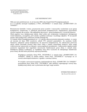 Zespół Szkół Ponadgimnazjalnych Nr 1 im. prof. Henryka Mierzejewskiego 84-300 Lębork ul. Marcinkowskiego 1 Tel/fax 862 22 95 LIST REFERENCYJNY Miło jest nam poinformować, Ŝe od stycznia 2002 roku Zespół Szkól Ponadgimnazjalnych nr l w Lęborku nawiązał współpracę z PTH ,,TECHNIKA” w ramach akcji ,,KOMPUTERY ZA TONERY”. BezuŜyteczne kartridŜe i tonery, przynoszone przez uczniów i nauczycieli, wymieniane są na sprzęt komputerowy instalowany w szkolnych pracowniach komputerowych. Organizatorzy przewidzieli równieŜ nagrody dla uczniów. Dla najbardziej aktywnych - sprzęt komputerowy i wycieczki klasowa Obok poprawy bazy dydaktycznej szkoły, akcji celem jest zwiększenie świadomości ekologicznej wśród młodzieŜy, szczególnie, jeś1i chodzi o problem utylizacji i recyklingu odpadów. W ten sposób moŜna, takŜe praktycznie, realizować ścieŜkę ekologiczną. W Zespole Szkół Ponadgimnazjalnych nr 1 w Lęborku akcja przyniosła doskonałe rezultaty - w czasie od stycznia do lipca 2002 uczniowie zebrali 978 zuŜytych pojemników. Za uzyskane środki finansowe zakupiono sprzęt komputerowy do pracowni komputerowej. Na zakończenie pierwszej edycji szkoła otrzymała równieŜ zbiór kaset wideo o bardzo róŜnorodnej tematyce, które mogą wykorzystywać nauczyciele na lekcjach z poszczególnych przedmiotów. Jednocześnie najaktywniejsi uczniowie nagradzani byli nagrodami rzeczowymi fundowanymi przez firmę w ramach akcji. Dodatkową atrakcją wynikającą, ze współpracy były dwie wycieczki do Zakopanego ufundowane przez firmę, dla klas które przyniosły najwięcej kartridŜy. Współpraca pomiędzy firmą PTH ,,TECHNIKA” w ramach akcji ,,KOMPUTERY ZA TONERY” układa sic bardzo dobrze. Firma PTH ,.TECHNIJCA” wywiązuje sic ze swoich zobowiązań terminowo i zgodnie z zawartą Umową. W związku z powyŜszym moŜemy zarekomendować akcję ,,KOMPUTRY ZA TONERY” prowadzona przez firmę PTH ,,TECHNIKA” jako partnera wspierającego rozwój bazy dydaktycznej szkoły oraz wychowania eko1ogic~nego uczniów DYREKTOR SZKOŁY Mgr Ryszard Rozwadowski