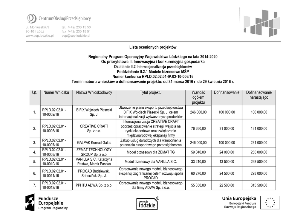 ul. Moniuszki7/9 90-101 Łódź www.cop.lodzkie.pl tel. /+42/ 230 15 50 fax /+42/ 230 15 51 [email protected] Lista ocenionych projektów Regionalny Program Operacyjny Województwa Łódzkiego na lata 2014-2020 Oś priorytetowa II: Innowacyjna i konkurencyjna gospodarka Działanie II.2 Internacjonalizacja przedsiębiorstw Poddziałanie II.2.1 Modele biznesowe MŚP Numer konkursu RPLD.02.02.01-IP.02-10-006/16 Termin naboru wniosków o dofinansowanie projektu: od 31 marca 2016 r. do 29 kwietnia 2016 r. Lp. Numer Wniosku Nazwa Wnioskodawcy 1. RPLD.02.02.0110-0002/16 BIFIX Wojciech Piasecki Sp. J. 2. RPLD.02.02.0110-0005/16 CREATIVE CRAFT Sp. z o.o. RPLD.02.02.0110-0007/16 RPLD.02.02.0110-0008/16 RPLD.02.02.0110-0010/16 ZEMAT TECHNOLOGY GROUP Sp. z o.o. VANILLA S.C. Katarzyna Pastwa, Marek Pastwa 6. RPLD.02.02.0110-0011/16 PROCAD Budziewski, Sobociński Sp. J. 7. RPLD.02.02.0110-0012/16 PPHTU ADWA Sp. z o.o. 3. 4. 5. GALPAK Konrad Galas Tytuł projektu Wartość ogółem projektu Dofinansowanie Dofinansowanie narastająco 246 000,00 100 000,00 100 000,00 76 260,00 31 000,00 131 000,00 246 000,00 100 000,00 231 000,00 Model biznesowy dla ZEMAT TG 59 040,00 24 000,00 255 000,00 Model biznesowy dla VANILLA S.C. 33 210,00 13 500,00 268 500,00 60 270,00 24 500,00 293 000,00 55 350,00 22 500,00 315 500,00 Utworzenie planu eksportu przedsiębiorstwa BIFIX Wojciech Piasecki Sp. J. celem internacjonalizacji wytwarzanych produktów Internacjonalizacja CREATIVE CRAFT poprzez opracowanie strategii wejścia na rynki eksportowe oraz zwiększenie międzynarodowej ekspansji firmy Zakup usług doradczych dla wzmocnienia potencjału eksportowego przedsiębiorstwa Opracowanie nowego modelu biznesowego ekspansji zagranicznej celem rozwoju spółki PROCAD Opracowanie nowego modelu biznesowego dla firmy ADWA Sp. z o.o. 8. RPLD.02.02.0110-0013/16 NOWA SZKOŁA Sp. z o.o. 9. RPLD.02.02.0110-0015/16 COMPLETE BRAND MANAGEMENT Sp. z o.o. Sp. k. 10. RPLD.02.02.0110-0016/16 ORION EXHAUST PARTS Rafał Matusiewicz 11. RPLD.02.02.0110-0017/16 GroMar Sp. z o.o. 12. RPLD.02.02.0110-0018/16 "FIORE" Gernant, Biernacki i Tomas Sp. J. 13. RPLD.02.02.0110-0019/16 BUSINESS CONSULTING Witold Łuczyński 14. RPLD.02.02.0110-0020/16 AGRECOL Sp. z o.o. 15. RPLD.02.02.0110-0021/16 GRANEX Sp. z o.o. 16. RPLD.02.02.0110-0023/16 SULIMAR Sp. z o.o. 17. RPLD.02.02.0110-0026/16 Staltech Polska Sp. z o.o. 18. RPLD.02.02.0110-0027/16 PACKSERVICE Sp. z o.o. Opracowanie nowego modelu biznesowego dla przedsiębiorstwa NOWA SZKOŁA Sp. z o.o. Internacjonalizacja działalności przedsiębiorstwa poprzez opracowanie modelu biznesowego zmierzającego do internacjonalizacji działalności Rozwój działań eksportowych przedsiębiorstwa ORION EXHAUST PARTS poprzez opracowanie kompleksowej strategii internacjonalizacji Opracowanie nowego modelu biznesowego dla firmy GroMar, zmierzającego do jego internacjonalizacji Internacjonalizacja firmy FIORE poprzez zakup nowego modelu biznesowego Opracowanie nowego modelu biznesowego określającego rozszerzenie działalności o sprzedaż eksportową Opracowanie planu rozwoju eksportu dla firmy AGRECOL w celu wejścia na nowe rynki zbytu Opracowanie strategii podboju rynków zagranicznych instrumentem rozwoju firmy Opracowanie strategii biznesowej firmy SULIMAR w kierunku rozpoczęcia eksportu prozdrowotnego napoju funkcjonalnego Nabycie usługi doradczej mającej na celu opracowanie nowego modelu biznesowego firmy dla rozpoczęcia jej działalności eksportowej Rozwój spółki poprzez eksport – przygotowanie nowego modelu biznesowego 73 800,00 30 000,00 345 500,00 76 260,00 31 000,00 376 500,00 76 260,00 31 000,00 407 500,00 233 700,00 95 000,00 502 500,00 43 050,00 17 500,00 520 000,00 97 170,00 39 500,00 559 500,00 123 000,00 50 000,00 609 500,00 61 500,00 25 000,00 634 500,00 36 900,00 15 000,00 649 500,00 55 350,00 22 500,00 672 000,00 49 200,00 20 000,00 692 000,00 19. RPLD.02.02.0110-0029/16 WZORCOWNIA Agnieszka DębeckaMurzyniak 20. RPLD.02.02.0110-0031/16 SAGITTARIUS GROUP Sp. z o.o. 21. RPLD.02.02.0110-0032/16 HIGIENIX Andrzej Baryga RPLD.02.02.0110-0033/16 RPLD.02.02.0110-0034/16 RPLD.02.02.0110-0035/16 Doradztwo Tomasz Wróblewski TW Consulting BUSINESS IN RUSSIA Sp. z o.o. TAMARA GIBUS – MARA GIBBUCCI 25. RPLD.02.02.0110-0037/16 ARES Bracia Maciołek Sp. z o.o. 26. RPLD.02.02.0110-0038/16 PPHU FEMI Sławomir Mikołajczyk 27. RPLD.02.02.0110-0039/16 Master Pharm S.A. 28. RPLD.02.02.0110-0041/16 Paweł Nowak – AGROMASZ 22. 23. 24. Opracowanie nowego modelu biznesowego firmy WZORCOWNIA Agnieszka DębeckaMurzyniak Opracowanie nowego modelu biznesowego internacjonalizacji przedsiębiorstwa SAGITTARIUS zmierzającego do wejścia na rynki Europy Zachodniej i Ameryki Północnej z narzędziem dla systemów nawigacji GPS Zielona Fala Opracowanie planu ekspansji na rynki zagraniczne podstawą dalszego rozwoju formy HIGIENIX 123 000,00 50 000,00 742 000,00 99 630,00 40 500,00 782 500,00 73 800,00 30 000,00 812 500,00 Model biznesowy dla TW Consulting 71 340,00 29 000,00 841 500,00 Nowe horyzonty dla BUSINESS IN RUSSIA 55 350,00 22 500,00 864 000,00 Perspektywy rozwoju MARY GIBBUCCI 36 900,00 15 000,00 879 000,00 76 260,00 31 000,00 910 000,00 76 260,00 31 000,00 941 000,00 76 260,00 31 000,00 972 000,00 49 200,00 20 000,00 992 000,00 Opracowanie strategii rozwoju eksportu w celu internacjonalizacji firmy ARES Bracia Maciołek Poszerzenie i dywersyfikacja ekspansji zagranicznej przedsiębiorstwa PPHU FEMI poprzez opracowanie modelu biznesowego zmierzającego do internacjonalizacji działalności Internacjonalizacja Master Pharm poprzez opracowanie strategii wejścia na rynki eksportowe oraz zwiększenie międzynarodowej ekspansji firmy Rozwój działalności eksportowej poprzez opracowanie nowego modelu biznesowego prowadzącego do internacjonalizacji przedsiębiorstwa 29. RPLD.02.02.0110-0044/16 SENSILAB POLSKA Sp. z o.o. Sp. k-a 30. RPLD.02.02.0110-0045/16 KĘDZIOREK Joanna Kędziorek RPLD.02.02.0110-00