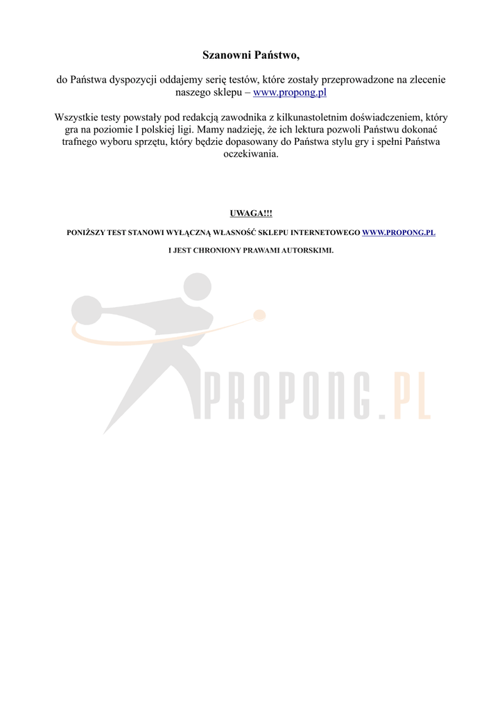 Szanowni Państwo, do Państwa dyspozycji oddajemy serię testów, które zostały przeprowadzone na zlecenie naszego sklepu – www.propong.pl Wszystkie testy powstały pod redakcją zawodnika z kilkunastoletnim doświadczeniem, który gra na poziomie I polskiej ligi. Mamy nadzieję, że ich lektura pozwoli Państwu dokonać trafnego wyboru sprzętu, który będzie dopasowany do Państwa stylu gry i spełni Państwa oczekiwania. UWAGA!!! PONIŻSZY TEST STANOWI WYŁĄCZNĄ WŁASNOŚĆ SKLEPU INTERNETOWEGO WWW.PROPONG.PL I JEST CHRONIONY PRAWAMI AUTORSKIMI. INSPIRIT 2.1mm czarna, twardość 42 W skrócie: dosyć lekka, średnio miękka, super szybkość, dobra kontrola i super rotacja. Okładzina znajduje się w opakowaniu typu „książka”. Opakowanie zawiera sporo informacji dotyczących technologii wykonania. Okładzina posiada folię ochronna, która naprawdę mocno trzyma się wierzchu. Wierzch jest bardzo klejący. Jeżeli ktoś nie lubi bardzo klejących gum, to polecam przetrzeć warstwę wierzchnia przed grą zwykłą wodą lub specjlanym płynem, co w znaczny sposób zwiększy szybkość okładziny. Okładzina znacznie lepiej sprawuje się na miękkich i średnio twardych deskach. W Internecie dużo się czyta, że jest podobna do Butterfly Bryce FX. Czy to prawda? Moim zdaniem, po części tak. Miałem okazję grać Bryce FX 2.1 czarnym i z czystym sumieniem mogę powiedzieć, że: − szybkość - Bryce FX jest trochę szybszy na kleju, bez kleju szybkość podobna, − rotacja - zdecydowanie Inspirit przewyższa Bryce FX, zarówno na kleju i bez kleju, − kontrola - w Inspiricie zauważyłem minimalnie większą kontrolę, ale ogólnie są porównywalne. Moim zdaniem nie warto przepłacać. Bardzo podobne okładziny, tylko tyle, że Bryce kosztuje trzy razy tyle. Po dłuższej grze zauważyłem, że jest to okładzina, która mi pasowała bardziej na bh. Z opinii moich kolegów z I ligi wiem natomiast, że im grało się nią lepiej na FH, więc jest naprawdę bardzo uniwersalna pod tym względem. Na pewno posiada bardzo duży katapult. Polecam bardziej do gry na świeżym kleju. Wyraźnie widać wzrost szybkości i rotacji, w porównaniu do gry bez kleju, nawet o ok. 15-20%). Do serwisu, bloku znakomita, rotacja i kontrola dają tutaj znać o sobie. Zbicia bardzo „soczyste”, dzięki wysokiemu katapultowi. Do gry topspinowej bardzo dobra, ale... czasami piłka po odbiciu, traci jakby trajektorię lotu. Zamiast opadać, to ona leci prosto, daleko za stół. Nie zdarza się to często, ale taki fakt występuje, szczególnie u mniej doświadczonych graczy. Wynika to głównie z tego, że podkład w tej okładzinie jest średniej twardości i dlatego jest ona polecana dla zaawansowanych zawodników, którzy nie będą na niej szkolić swojej techniki. Okładzina ta, po prostu nie wybacza błędów, tak jak inne, bardziej miękkie i wolniejsze modele. PODSUMOWANIE Znakomita okładzina przeznaczona przede wszystkim do gry topspinowej. Za bardzo niską cenę można mieć naprawdę super okładzinę w porównaniu do innych znanych egzemplarzy dostępnych na rynku. Jeżeli grał ktoś Brycem lub podobnymi, to proponuję wypróbować także Inspirita. No i ta super wytrzymałość, grałem nią dość długo, po kilka godzin dziennie i do tej pory nie widzę większych śladów wytarcia. 3 razy ściągałem z niej klej bez żadnego problemu, nie uszkodziłem w ogóle podkładu. Po odklejeniu od deski okładzina zwija się w rulon, wynika to z jej bardzo dużego napięcia. SERDECZNIE POLECAM!!! INSPIRIT QUATTRO ALLROUND 2.0mm czarna, twardość: 38 Teoretycznie powinna być bardziej miękka od zwykłego Inspirita. Jak to się często dzieje, teoria nie idzie w parze z praktyką. Quattro jest twardsza, trochę lżejsza. Znajduje się również w opakowaniu jak “ksiązka”, z duża dawką informacji o technologii, którą zastosowano w tej okładzinie. Posiada folię ochronną, która bardzo mocno trzyma się wierzchu. Po jej odklejeniu warstwa wierzchnia nie jest juz tak bardzo klejąca, jak w zwykłym Inspirit. Oczywiście przed grą można ją także przetrzeć płynem, ten zabieg zwiększy szybkość. Okładzina zdecydowanie lepiej sprawuje się na miękkich deskach. W porównaniu do zwykłego Inspirita jest minimalnie wolniejsza, ma lepszą kontrolę, rotację i czucie. Celem firmy Dawei było wyprodukowanie okładziny z efektem wbudowanego kleju. Czy to im się udało? Powiem tak: nie jest źle. Bez kleju Quattro jest zdecydowanie lepsza od zwykłego Inspirita. Na kleju, którego teoretycznie nie powinno się przy niej używać, również widać przyrost prędkości, choć już nie tak duży, ok 5-10%. Dla mnie zdecydowanie lepsza na fh, tak samo jak dla moich kolegów. Na bh jest po prostu za twarda. Do zwykłego Inspirita szybciej się można przyzwyczaić. Początki z Quattro, zresztą tak jak przestrzega producent w swoim katalogu, były średnio owocne. Producent napisał w swoim katalogu, że trzeba około tygodnia treningów, żeby poczuć siłę gry tą okładziną. Potwierdzam, na pewno trzeba ją rozegrać, żeby poczuć pełnię zalet jakie ta okładzina oferuje. Quattro posiada trochę mniejszy katapult niż zwykły Inspirit. Największą różnicę w grze pomiędzy obydwoma modelami Dawei, widać przy grze topspinowej. Zwykły Inspirit jest bardzo dobry, ale Quattro jest wspaniałe. Gdyby posiadała jeszcze trochę więcej szybkości, byłaby wzorowa. Z bardziej miękkim podkładem powinna być bardziej sprężysta i nie omieszkam takowej wypróbować, gdy tylko nadarzy się okazja. PODSUMOWANIE Znakomita okładzina z dość twardym podkładem, polecam szczególnie bardziej doświadczonym zawodnikom. Nie zwija się w rulon po odklejeniu tak jak zwykły Inspirit. Jest również bardzo wytrzymała. Z CZYSTYM SUMIENIEM POLECAM!!!