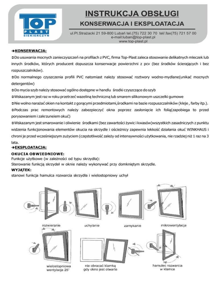 P P L A S T S IE KIERCZYN ul.Pl.Strażacki 21 59-800 Lubań tel.(75) 722 30 70 tel/.fax(75) 721 57 00 e-mail:[email protected] www.top-plast.pl čKONSERWACJA: ÜDo usuwania mocnych zanieczyszczeń na profilach z PVC, firma Top-Plast zaleca stosowanie delikatnych mleczek lub innych środków, których producent dopuszcza konserwacje powierzchni z pcv (bez środków ścierających i bez rozpuszczalników). ÜDo normalnego czyszczenia profili PVC natomiast należy stosować roztwory wodno-mydlane(unikać mocnych detergentów) ÜDo mycia szyb należy stosować ogólno dostępne w handlu środki czyszczące do szyb ÜWskazanym jest raz w roku przetrzeć wazeliną techniczną lub smarem silikonowym uszczelki gumowe ÜNie wolno narażać okien na kontakt z gorącymi przedmiotami,środkami na bazie rozpuszczalników (kleje , farby itp.). ÜPodczas prac remontowych należy zabezpieczyć okna poprzez zasłonięcie ich folią(zapobiega to przed porysowaniem i zakrzuneiem okuć) ÜWskazanym jest smarowanie i oliwienie środkami (bez zawartości żywic i kwasów)wszystkich zasadniczych z punktu widzenia funkcjonowania elementów okucia na skrzydle i ościeżnicy zapewnia lekkość działania okuć WINKHAUS i chroni je przed wcześniejszym zużyciem (częstotliwość zależy od intensywności użytkowania, nie rzadziej niż 1 raz na 3 lata. čEKSPLOATACJA: OKUCIA OBWIEDNIOWE: Funkcje użytkowe (w zależności od typu skrzydła): Sterowanie funkcją skrzydeł w oknie należy wykonywać przy domkniętym skrzydle. WYJĄTEK: stanowi funkcja hamulca rozwarcia skrzydła i wielostopniowy uchył