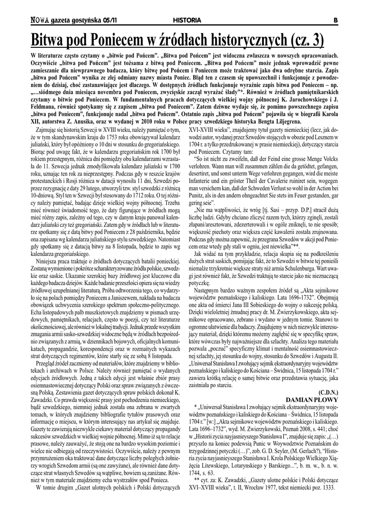 NOWA gazeta gostyñska 05/11 HISTORIA Bitwa pod Poniecem w ród³ach historycznych (cz. 3) B W literaturze czêsto czytamy o bitwie pod Poñcem. Bitwa pod Poñcem jest widoczna zw³aszcza w nowszych opracowaniach. Oczywicie bitwa pod Poñcem jest to¿sama z bitw¹ pod Poniecem. Bitwa pod Poñcem mo¿e jednak wprowadziæ pewne zamieszanie dla niewprawnego badacza, który bitwê pod Poñcem i Poniecem mo¿e traktowaæ jako dwa odrêbne starcia. Zapis bitwa pod Poñcem wynika ze z³ej odmiany nazwy miasta Poniec. B³¹d ten z czasem siê upowszechni³ i funkcjonuje z powodzeniem do dzisiaj, choæ zastanawiaj¹ce jest dlaczego. W dostêpnych ród³ach funkcjonuje wyranie zapis bitwa pod Poniecem np. siódmego dnia miesi¹ca novembra pod Poniecem, zwyciêskie zacz¹³ wyra¿aæ lady*. Równie¿ w ród³ach pamiêtnikarskich czytamy o bitwie pod Poniecem. W fundamentalnych pracach dotycz¹cych wielkiej wojny pó³nocnej K. Jarochowskiego i J. Feldmana, równie¿ spotykamy siê z zapisem bitwa pod Poniecem. Zatem dziwne wydaje siê, ¿e pomimo powszechnego zapisu bitwa pod Poniecem, funkcjonuje nadal bitwa pod Poñcem. Ostatnio zapis bitwa pod Poñcem pojawi³a siê w biografii Karola XII, autorstwa Z. Anusika, oraz w wydanej w 2010 roku w Polsce pracy szwedzkiego historyka Bengta Liljegrena. Zajmuj¹c siê histori¹ Szwecji w XVIII wieku, nale¿y pamiêtaæ o tym, XVI-XVIII wieku, znajdujemy tytu³ gazety niemieckiej (lecz, jak do¿e w tym skandynawskim kraju do 1753 roku obowi¹zywa³ kalendarz wodzi autor, wydanej przez Szwedów stoj¹cych w obozie pod Lesznem w juliañski, który by³ opóniony o 10 dni w stosunku do gregoriañskiego. 1704 r. a tylko przedrukowanej w prasie niemieckiej), dotycz¹cy starcia Bior¹c pod uwagê fakt, ¿e w kalendarzu gregoriañskim rok 1700 by³ pod Poniecem. Czytamy tam: So ist nicht zu zweifeln, daß der Feind eine grosse Menge Volcks rokiem przestêpnym, ró¿nica dni pomiêdzy obu kalendarzami wzrasta³a do 11. Szwecja jednak zmodyfikowa³a kalendarz juliañski w 1700 verlohren. Wann man will zusammen zählen die da getödtet, gefangen, roku, uznaj¹c ten rok za nieprzestêpny. Podczas gdy w reszcie krajów desertiret, und sonst unterm Wege verlohren gegangen, wird die meiste protestanckich i Rosji ró¿nica w datacji wynosi³a 11 dni, Szwedzi po- Infanterie und ein gröster Theil der Cavalerie ruiniret sein, wogegen przez rezygnacjê z daty 29 lutego, utworzyli tzw. styl szwedzki z ró¿nic¹ man versichern kan, daß der Schweden Verlust so wohl in der Action bei 10-dniow¹. Styl ten w Szwecji by³ stosowany do 1712 roku. O tej ró¿ni- Punitz, als in den andern ohngeachtet Sie stets im Feuer gestanden, gar cy nale¿y pamiêtaæ, badaj¹c dzieje wielkiej wojny pó³nocnej. Trzeba gering seie. Nie ma w¹tpliwoci, ¿e wróg [tj. Sasi przyp. D.P.] straci³ du¿¹ mieæ równie¿ wiadomoæ tego, ¿e daty figuruj¹ce w ród³ach mog¹ mieæ ró¿ny zapis, zale¿ny od tego, czy w danym kraju panowa³ kalen- liczbê ludzi. Gdyby chciano zliczyæ razem tych, którzy zginêli, zostali darz juliañski czy te¿ gregoriañski. Zatem gdy w ród³ach lub w literatu- z³apani/aresztowani, zdezerterowali i w ogóle zniknêli, to nie sposób; rze spotkamy siê z dat¹ bitwy pod Poniecem z 28 padziernika, bêdzie wiêkszoæ piechoty oraz wiêksza czêæ kawalerii zosta³a zrujnowana. ona zapisana wg kalendarza juliañskiego stylu szwedzkiego. Natomiast Podczas gdy mo¿na zapewniæ, ¿e przegrana Szwedów w akcji pod Poniegdy spotkamy siê z datacj¹ bitwy na 8 listopada, bêdzie to zapis wg cem oraz wtedy gdy stali w ogniu, jest niewielka**. Jak widaæ na tym przyk³adzie, relacja skupia siê na podkreleniu kalendarza gregoriañskiego. Niniejsza praca traktuje o ród³ach dotycz¹cych batalii ponieckiej. du¿ych strat saskich, pomijaj¹c fakt, ¿e to Szwedzi w bitwie tej ponieli Zostan¹ wymienione i pokrótce scharakteryzowane ród³a polskie, szwedz- niemal¿e trzykrotnie wiêksze straty ni¿ armia Schulenburga. Wart uwakie oraz saskie. Ukazanie szerokiej bazy ród³owej jest kluczowe dla gi jest równie¿ fakt, ¿e Szwedzi traktuj¹ to starcie jako nic nieznacz¹c¹ ka¿dego badacza dziejów. Ka¿de badanie przesz³oci opiera siê na wiedzy potyczkê. Nastêpnym bardzo wa¿nym zespo³em róde³ s¹ Akta sejmikowe ród³owej uzupe³nianej literatur¹. Próba odtworzenia tego, co wydarzy³o siê na polach pomiêdzy Poniecem a Janiszewem, nak³ada na badacza województw poznañskiego i kaliskiego. Lata 1696-1732. Obejmuj¹ obowi¹zek uchwycenia szerokiego spektrum spo³eczno-politycznego. one akta od mierci Jana III Sobieskiego do wojny o sukcesjê polsk¹. Echa listopadowych palb muszkietowych znajdziemy w pismach urzê- Dziêki wieloletniej ¿mudnej pracy dr. M. Zwierzykowskiego, akta sejdowych, pamiêtnikach, relacjach, czêsto w poezji, czy te¿ literaturze mikowe opracowano, zebrano i wydano w jednym tomie. Stanowi to okolicznociowej, ale równie¿ w lokalnej tradycji. Jednak przede wszystkim ogromne u³atwienie dla badaczy. Znajdujemy w nich niezwykle interesuzmagania armii sasko-szwedzkiej widoczne bêd¹ w ród³ach bezpored- j¹cy materia³, dziêki któremu mo¿emy zag³êbiæ siê w specyfikê spraw, nio zwi¹zanych z armi¹, w dziennikach bojowych, oficjalnych komuni- które wówczas by³y najwa¿niejsze dla szlachty. Analiza tego materia³u katach, propagandzie, korespondencji oraz w rozmaitych wykazach pozwala poczuæ specyficzny klimat i mentalnoæ osiemnastowiecznej szlachty, jej stosunku do wojny, stosunku do Szwedów i Augusta II. strat dotycz¹cych regimentów, które star³y siê ze sob¹ 8 listopada. Przegl¹d róde³ zaczniemy od materia³ów, które znajdziemy w biblio- Uniwersa³ Stanis³awa I zwo³uj¹cy sejmik ekstraordynaryjny województw tekach i archiwach w Polsce. Nale¿y równie¿ pamiêtaæ o wydanych poznañskiego i kaliskiego do Kociana widnica, 15 listopada 1704 r. edycjach ród³owych. Jedn¹ z takich edycji jest w³anie zbiór prasy zaw