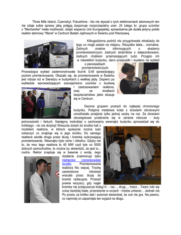 Three Mile Island, Czarnobyl, Fokushima - kto nie słyszał o tych elektrowniach atomowych ten nie zdaje sobie sprawy jaką potęgą dysponuje rozszczepialny uran. 24 lutego br. grupa uczniów z "Mechanika" miała możliwość, dzięki wsparciu Unii Europejskiej, sprawdzenia jak działa jedyny polski reaktor atomowy "Maria" w Centrum Badań Jądrowych w Świerku pod Warszawą. Kilkugodzinna podróż nie przygotowała młodzieży do tego co mogli zastać na miejscu. Wszystko takie... normalne. Żadnych znaków informujących o skażeniu promieniotwórczym, żadnych strażników z kałasznikowami, żadnych chyłkiem przemykających ludzi. Przyjęto ich w niewielkim budynku, dano przepustki i wysłano na wykład o pierwiastkach promieniotwórczych. Prowadząca wykład zademonstrowała licznik G-M sprawdzający poziom promieniowania. Okazało się, że promieniowanie w Świerku jest niższe niż w Sieradzu w budynkach z wielkiej płyty. Dopiero po wykładzie wprowadzającym zaznajomiono uczniów z budową i zastosowaniem reaktora, oraz ze środkami bezpieczeństwa jakie stosuje się w Centrum. Dwoma grupami przeszli do najlepiej chronionego budynku. Potężna metalowa krata z drzwiami obrotowymi umożliwiała przejście tylko jednej osoby na raz. Za drzwiami obowiązkowe przebranie się w ubranie robocze - buty jednorazówki i fartuch. Następny instruktaż o zachowaniu wewnątrz budynku sprowadzał się do krótkiego - nic nie dotykaj! Wreszcie dotarli do środka hali z modelem reaktora, w którym spokojnie można było zobaczyć co znajduje się w jego środku. Do samego reaktora wiodła droga przez śluzę i bramkę wykrywającą promieniowanie. Wewnątrz było cicho i chłodno. Gdyby nie to, że moc tego reaktora to 40 MW czyli tyle co 5000 dobrych samochodów, to można by stwierdzić, że jest tu... nudno. Rektor znajduje się w basenie z wodą. Jego działanie znamionuje tylko niebieskie czerenkowskie światło. Promieniowanie reaktora Nic więcej. Trochę zawiedziona młodzież wracała przez śluzę do bramki radiacyjne. Przeszli prawie wszyscy, gdy nagle bramka nie przepuszcza kolegi K. - raz..., drugi..., trzeci... Twarz robi się coraz bardziej biała, przerażenie w oczach - trzeba umierać... Jednak nie. Po prostu za krótko stał i automat stwierdzał, że coś nie gra. Na pewno, co najmniej on zapamięta ten wyjazd na długo. Z budynku reaktora przeszli do Laboratorium Dozymetrii. Dowiedzieli się w jaki sposób dba się o pozostałości po procesie produkcyjnym w reaktorze. Urządzenia badawcze wychwytują nawet 2 zabłąkane atomy w 1 m3 wody. Niczemu nie pozwala się działać na żywioł. Nadzór jest całodobowy, non stop przez wszystkie dni w roku. Wszystkie zanieczyszczenia muszą zostać unieszkodliwione. Czy prawidłowo użytkowany reaktor atomowy jest groźny dla otoczenia? Myślę, że po tym wyjeździe co najmniej kilka osób z czystym sumieniem stwierdzi, że nie i nie będzie ulegało psychozie antyatomowej. Zostaną zwolennikami taniej energii niezanieczyszczającej otoczenia.