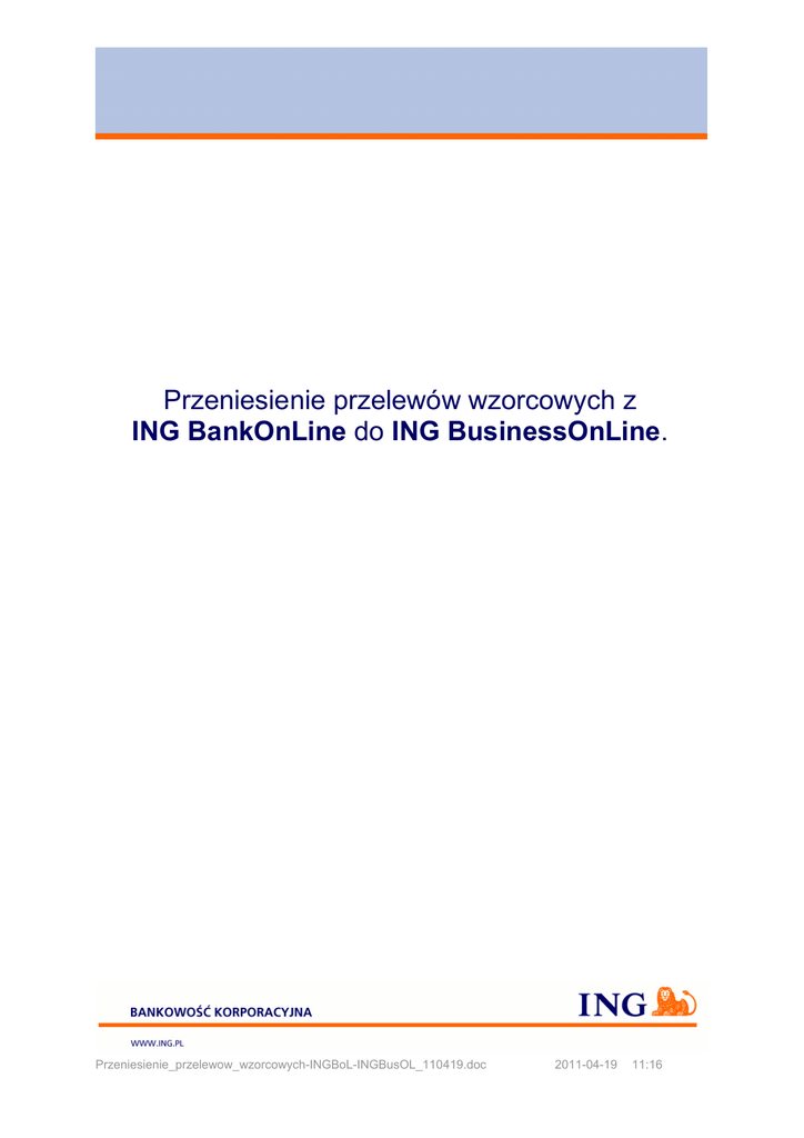 Przeniesienie przelewów wzorcowych z ING BankOnLine do ING BusinessOnLine. Przeniesienie_przelewow_wzorcowych-INGBoL-INGBusOL_110419.doc 2011-04-19 11:16 Spis treści: 1. 2. 3. Eksport przelewów wzorcowych z ING BankOnLine ........................................... 3 Import przelewów wzorcowych do ING BusinessOnLine..................................... 4 Uwagi dodatkowe ................................................................................................ 6 1. Eksport przelewów wzorcowych z ING BankOnLine W celu wygenerowania pliku z przelewami wzorcowymi naleŜy skorzystać z funkcji eksportu dostępnej w zakładce Wzorce. Z głównego menu naleŜy wybrać moduł Przelewy. W module tym naleŜy wybrać w bocznym menu pozycję Wzorce. Następnie naleŜy wskazać odpowiedni rodzaj eksportowanych przelewów – krajowe (sekcja Przelewy wzorcowe w PLN) lub walutowe (sekcja Zlecenia walutowe wzorcowe). W wybranej sekcji naleŜy nacisnąć przycisk Eksportuj przelewy wzorcowe. System stworzy plik przelewów wzorcowych, który naleŜy zapisać na dysku i wykorzystać do importu przelewów do systemu ING BusinessOnLine. 2. Import przelewów wzorcowych do ING BusinessOnLine Z menu górnego naleŜy wybrać zakładkę Narzędzia, a następnie Import/Eksport i Szablony importu. ING BusinessOnLine oferuje cztery szablony słuŜące do importu danych z ING BankOnLine: • Kontrahent krajowy ING BankOnLine – import do bazy kontrahentów krajowych, • Kontrahent walutowy ING BankOnLine – import do bazy kontrahentów walutowych, • Przelew krajowy ING BankOnLine – import do bazy krajowych przelewów wzorcowych, • Przelew walutowy ING BankOnLine – import do bazy krajowych przelewów wzorcowych. Aby wczytać plik naleŜy wybrać jeden z szablonów (odpowiadający rodzajowi przelewów i bazy, do której zlecenia mają zostać wczytane). W poniŜszym przykładzie przedstawiono wczytanie do bazy krajowych przelewów wzorcowych. Po wybraniu szablonu Przelew krajowy ING BankOnLine następuje przejście do formatki importu: NaleŜy wskazać stronę kodową importowanego pliku (plik wygenerowany z ING BankOnLine zakodowany jest w Windows-1250), wybrać plik do importu i nacisnąć przycisk Importuj. Po wczytaniu pliku pokaŜe się ekran podsumowujący zawartość pliku: Zlecenia moŜna zaimportować do paczki zleceń - podając jej nazwę w polu: Zlecenia importowane są do bazy przelewów wzorcowych. NaleŜy określić nazwę przelewów poprzez wpisanie nazwy przelewów w polu: Przelewy zostaną wczytane do bazy po naciśnięciu przycisku Zatwierdź. Przelewy są widoczne w bazie przelewów wzorcowych i moŜna z nich korzystać do tworzenia przelewów: 3. Uwagi dodatkowe • • • • • • W pliku wygenerowanym z ING BankOnLine obok zlecenia wskazana jest grupa, do jakiej zlecenie naleŜy. Grupy przelewów/kontrahentów muszą być wcześniej utworzone w ING BusinessOnLine. JeŜeli grupy nie istnieją – przelewy czy kontrahenci zostaną przypisane do grupy domyślnej – Grupy ogólnej. System ING BusinessOnLine nie pozwala na zaimportowanie następujących znaków przy imporcie przelewów krajowych: @, #, $, *, \, <, >. NaleŜy je usunąć z importowanego pliku, aby wiersz moŜna było zapisać w aplikacji. System ING BusinessOnLine nie pozwala na zaimportowanie następujących znaków przy imporcie przelewów walutowych: @, !, #, $, %, ^, &, _, +, =, \, <, >. NaleŜy je usunąć z importowanego pliku, aby wiersz moŜna było zapisać w aplikacji. Zlecenia na rachunki Zakładu Ubezpieczeń Społecznych eksportowane są błędnie – typ polecenia zapisuje się jako 110 zamiast 120. Po zmianie w wierszu przelewu na 120 i wczytaniu zlecenie importowane jest prawidłowo. Zlecenia na rachunki Urzędów Skarbowych zostaną zapisane do bazy Podatkowych przelewów wzorcowych, bez względu na typ dokumentu w pliku. Nazwa importowanego przelewu wzorcowego tworzona jest na podstawie wskazanej przez uŜytkownika nazwy przez dodanie do tej nazwy kolejnego numeru przelewu.