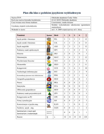 Plan dla klas z polskim językiem wykładowym Nazwa ŠVP: Kod oraz nazwa kierunku kształcenia: Czas trwania oraz forma studium: Obchodní akademie Český Těšín 63-41-M/02 Obchodní akademie Czterolotnie, studia dzienne Średnie wykształcenie zakończone egzaminem maturalnym od 1. 9. 2009 rozpocząwszy od 1. klasy Uzyskany stopień wykształcenia: Wchodzi w życie: Przedmiot Skrót 1. 2. 3. 4. ∑ Język polski i literatura PJL 3 3 3 3 12 Język czeski i literatura CJL 3 3 3 4 13 Język angielski ANJ 3 3 3 3 12 Podstawy nauk społecznych SPV 1 1 0 2 4 Historia DEJ 2 0 1 0 3 Matematyka MAT 3 4 3 2 12 Wychowanie fizyczne TEV 2 2 2 2 8 Ekonomika EKO 2 3 3 3 11 Księgowość UCE 0 3 4 3 10 Technologie informacyjne INT 3 2 2 2 9 Komunikacja pisemna oraz elektorniczna PEK 3 2 2 1 8 Geografia gospodarcza HOZ 2 1 0 0 3 Prawo PRA 0 0 0 2 2 Statystyka STA 0 0 2 0 2 Obliczenia gospodarcze HOV 2 0 0 0 2 Podstawy nauk przyrodniczych ZPV 2 3 0 0 5 Księgowanie na PC UPC 0 0 1 2 3 Firmy symulacyjne FIF 0 0 3 0 3 Konwersacja w języku ang. KAN 1 1 0 0 2 Fachowy język ang. OAN 0 0 1 1 2 0 0 0 1 1 32 31 33 32 Symbol Seminarium z nauk społ. Seminarium z matematyki Seminaria doborowe Razem ∑ x 128