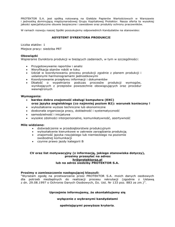 PROTEKTOR S.A. jest spółką notowaną na Giełdzie Papierów Wartościowych w Warszawie i jednostką dominującą międzynarodowej Grupy Kapitałowej Protektor. Nasza oferta to wysokiej jakości specjalistyczne obuwie bezpieczne i zawodowe oraz produkty ochrony pracowników. W ramach rozwoju naszej Spółki poszukujemy odpowiednich Kandydatów na stanowisko: ASYSTENT DYREKTORA PRODUKCJI Liczba etatów: 1 Miejsce pracy: siedziba PRT Obowiązki Wspieranie Dyrektora produkcji w bieżących zadaniach, w tym w szczególności: Przygotowywanie raportów i analiz Weryfikacja stanów robót w toku Udział w koordynowaniu procesu produkcji zgodnie z planem produkcji i ustalonymi harmonogramami jednostkowymi Koordynowanie przepływu informacji i dokumentów Dbałość o wypełnianie podczas procesów produkcji wymogów, wynikających z przepisów powszechnie obowiązujących oraz procedur wewnętrznych Wymagania: bardzo dobra znajomość obsługi komputera (EXC) oraz języka angielskiego (co najmniej poziom B2): warunek konieczny ! wykształcenie wyższe techniczne lub ekonomiczne doskonała organizacja pracy, dokładność i systematyczność samodzielność i inicjatywa wysokie zdolności interpersonalne, komunikatywność, asertywność Mile widziane: doświadczenie w przedsiębiorstwie produkcyjnym wykształcenie kierunkowe w zakresie zarządzania produkcją znajomość języka rosyjskiego lub niemieckiego na poziomie swobodnej komunikacji czynne prawo jazdy kategorii B CV oraz list motywacyjny (z informacją, jakiego stanowiska dotyczy), prosimy przesyłać na adres: [email protected] lub na adres siedziby PROTEKTOR S.A. Prosimy o zamieszczenie następującej klauzuli: "Wyrażam zgodę na przetwarzanie przez PROTEKTOR S.A. moich danych osobowych dla potrzeb niezbędnych do realizacji procesu rekrutacji (zgodnie z Ustawą z dn. 29.08.1997 o Ochronie Danych Osobowych, Dz. Ust. Nr 133 poz. 883 ze zm.)”. Uprzejmie informujemy, że skontaktujemy się wyłącznie z wybranymi kandydatami spełniającymi powyższe kryteria.