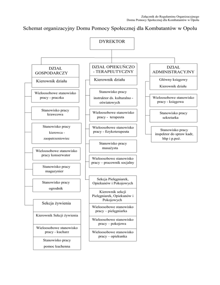 Załącznik do Regulaminu Organizacyjnego Domu Pomocy Społecznej dla Kombatantów w Opolu Schemat organizacyjny Domu Pomocy Społecznej dla Kombatantów w Opolu DYREKTOR DZIAŁ GOSPODARCZY Kierownik działu DZIAŁ OPIEKUŃCZO - TERAPEUTYCZNY Kierownik działu DZIAŁ ADMINISTRACYJNY Główny księgowy Kierownik działu Wieloosobowe stanowisko pracy - praczka Stanowisko pracy krawcowa Stanowisko pracy kierowca - Stanowisko pracy instruktor ds. kulturalno oświatowych Wieloosobowe stanowisko pracy - księgowa Wieloosobowe stanowisko pracy - terapeuta Stanowisko pracy sekretarka Wieloosobowe stanowisko pracy - fizykoterapeuta zaopatrzeniowiec Wieloosobowe stanowisko pracy konserwator Stanowisko pracy masażysta Wieloosobowe stanowisko pracy – pracownik socjalny Stanowisko pracy magazynier Stanowisko pracy ogrodnik Sekcja żywienia Sekcja Pielęgniarek, Opiekunów i Pokojowych Kierownik sekcji Pielęgniarek, Opiekunów i Pokojowych Wieloosobowe stanowisko pracy – pielęgniarka Kierownik Sekcji żywienia Wieloosobowe stanowisko pracy – pokojowa Wieloosobowe stanowisko pracy - kucharz Stanowisko pracy pomoc kuchenna Wieloosobowe stanowisko pracy – opiekunka Stanowisko pracy inspektor do spraw kadr, bhp i p.poż.