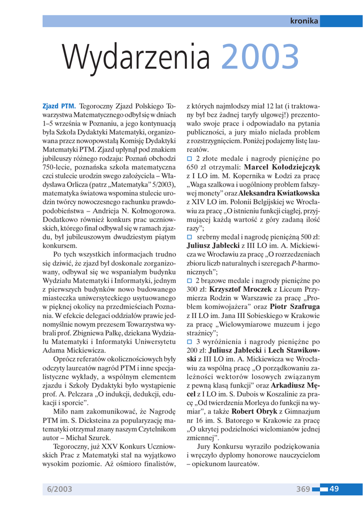 kronika Wydarzenia 2003 Zjazd PTM. Tegoroczny Zjazd Polskiego Towarzystwa Matematycznego odbył się w dniach 1–5 września w Poznaniu, a jego kontynuacją była Szkoła Dydaktyki Matematyki, organizowana przez nowopowstałą Komisję Dydaktyki Matematyki PTM. Zjazd upłynął pod znakiem jubileuszy różnego rodzaju: Poznań obchodzi 750-lecie, poznańska szkoła matematyczna czci stulecie urodzin swego założyciela – Władysława Orlicza (patrz „Matematyka” 5/2003), matematyka światowa wspomina stulecie urodzin twórcy nowoczesnego rachunku prawdopodobieństwa – Andrieja N. Kołmogorowa. Dodatkowo również konkurs prac uczniowskich, którego finał odbywał się w ramach zjazdu, był jubileuszowym dwudziestym piątym konkursem. Po tych wszystkich informacjach trudno się dziwić, że zjazd był doskonale zorganizowany, odbywał się we wspaniałym budynku Wydziału Matematyki i Informatyki, jednym z pierwszych budynków nowo budowanego miasteczka uniwersyteckiego usytuowanego w pięknej okolicy na przedmieściach Poznania. W efekcie delegaci oddziałów prawie jednomyślnie nowym prezesem Towarzystwa wybrali prof. Zbigniewa Palkę, dziekana Wydziału Matematyki i Informatyki Uniwersytetu Adama Mickiewicza. Oprócz referatów okolicznościowych były odczyty laureatów nagród PTM i inne specjalistyczne wykłady, a wspólnym elementem zjazdu i Szkoły Dydaktyki było wystąpienie prof. A. Pelczara „O indukcji, dedukcji, edukacji i sporcie”. Miło nam zakomunikować, że Nagrodę PTM im. S. Dicksteina za popularyzację matematyki otrzymał znany naszym Czytelnikom autor – Michał Szurek. Tegoroczny, już XXV Konkurs Uczniowskich Prac z Matematyki stał na wyjątkowo wysokim poziomie. Aż ośmioro finalistów, 6/2003 z których najmłodszy miał 12 lat (i traktowany był bez żadnej taryfy ulgowej!) prezentowało swoje prace i odpowiadało na pytania publiczności, a jury miało nielada problem z rozstrzygnięciem. Poniżej podajemy listę laureatów. o 2 złote medale i nagrody pieniężne po 650 zł otrzymali: Marcel Kołodziejczyk z I LO im. M. Kopernika w Łodzi za pracę „Waga szalkowa i uogólniony problem fałszywej monety” oraz Aleksandra Kwiatkowska z XIV LO im. Polonii Belgijskiej we Wrocławiu za pracę „O istnieniu funkcji ciągłej, przyjmującej każdą wartość z góry zadaną ilość razy”; o srebrny medal i nagrodę pieniężną 500 zł: Juliusz Jabłecki z III LO im. A. Mickiewicza we Wrocławiu za pracę „O rozrzedzeniach zbioru liczb naturalnych i szeregach P-harmonicznych”; o 2 brązowe medale i nagrody pieniężne po 300 zł: Krzysztof Mroczek z Liceum Przymierza Rodzin w Warszawie za pracę „Problem komiwojażera” oraz Piotr Szafruga z II LO im. Jana III Sobieskiego w Krakowie za pracę „Wielowymiarowe muzeum i jego strażnicy”; o 3 wyróżnienia i nagrody pieniężne po 200 zł: Juliusz Jabłecki i Lech Stawikowski z III LO im. A. Mickiewicza we Wrocławiu za wspólną pracę „O porządkowaniu zależności wektorów losowych związanym z pewną klasą funkcji” oraz Arkadiusz Męcel z I LO im. S. Dubois w Koszalinie za pracę „Od twierdzenia Morleya do funkcji na wymiar”, a także Robert Obryk z Gimnazjum nr 16 im. S. Batorego w Krakowie za pracę „O ukrytej podzielności wielomianów jednej zmiennej”. Jury Konkursu wyraziło podziękowania i wręczyło dyplomy honorowe nauczycielom – opiekunom laureatów. 369 49 kronika Szkoła Historii Matematyki. Tegoroczna, XVII Szkoła Historii Matematyki zorganizowana w czerwcu w Nowym Sączu (gospodarzem była Państwowa Wyższa Szkoła Zawodowa), odbyła się pod znakiem minionej w 2002 roku dwusetnej rocznicy urodzin wielkiego matematyka norweskiego Nielsa Henrika Abela. Urodzony w małej norweskiej wiosce syn pastora był genialnym samoukiem. Matematyką zainteresował się w wieku 16 lat, po roku umiał więcej od nauczyciela, po 2 latach był w stanie rozwiazywać najtrudniejsze problemy leżące w centrum ówczesnej matematyki. Powszechnie znanym jego wynikiem jest dowód niemożliwości rozwiązania przez pierwiastniki ogólnego równania stopnia 5, ale prócz tego miał znaczące dokonania w bardzo wielu działach matematyki i wiele nowych gałęzi tej nauki wyrosło z jego pomysłów. O tym właśnie była mowa na omawianej konferencji. Niestety Akademia Paryska doceniła zasługi Abela dopiero po jego śmierci, a zmarł na gruźlicę bardzo młodo, bo w wieku 27 lat. Jak już pisaliśmy („Matematyka” 3/2002, s. 133), z okazji rocznicy urodzin Abela rząd norweski postanowił przyznawać matematyczną Nagrodę im. Abela, równorzędną z Nagrodą Nobla (której, jak wiadomo, matematycy nie otrzymują). Pierwszą Nagrodę Abela otrzymał wybitny matematyk francuski starszego pokolenia, J. P. Serre. Szkoła Matematyki Poglądowej. Na XXXI, Szkole Matematyki Poglądowej (sierpień 2003) wzmocnieniu uległa tendencja do poszerzania problematyki o inne dziedziny wiedzy. Oprócz odczytów matematycznych z wielkim zainteresowaniem słuchaliśmy astronoma, genetyka, ekonomisty, chemika, biologa. Takiemu zestawieniu odczytów sprzyjał temat szkoły: Wybrane dzieła klasyków. Wśród tych klasyków byli Euklides, Kartezjusz. Poincaré, Emma Noether ale także Darwin, Mendelejew, Hubble . Słuchacze, chyba trochę zmęczeni śledzeniem tak różnorodnej problematyki, obdarzyli „medalem Filca” Krzysztofa Ciesielskiego, który pod hasłem „Nietypowi klasycy” omówił osiągnięcia popularyzatorów i autorów łamigłówek: Lecha Pijanowskiego i Iana Stewarta. 50 370 Zeszłoroczna laureatka tego medalu, kompozytorka Alicja Gronau-Osińska, zaprezentowała nagranie swojej nowej opery kameralnej. Ciekawe jakie niespodzianki czekają uczestników kolejnej szkoły... Konferencja Stowarzyszenia Nauczycieli Matematyki. Jak zwykle, tak i w tym roku, na początku lutego zorganizowana została XII Krajowa Konferencja Stowarzyszenia Nauczycieli Matematyki. Odbyła się ona,