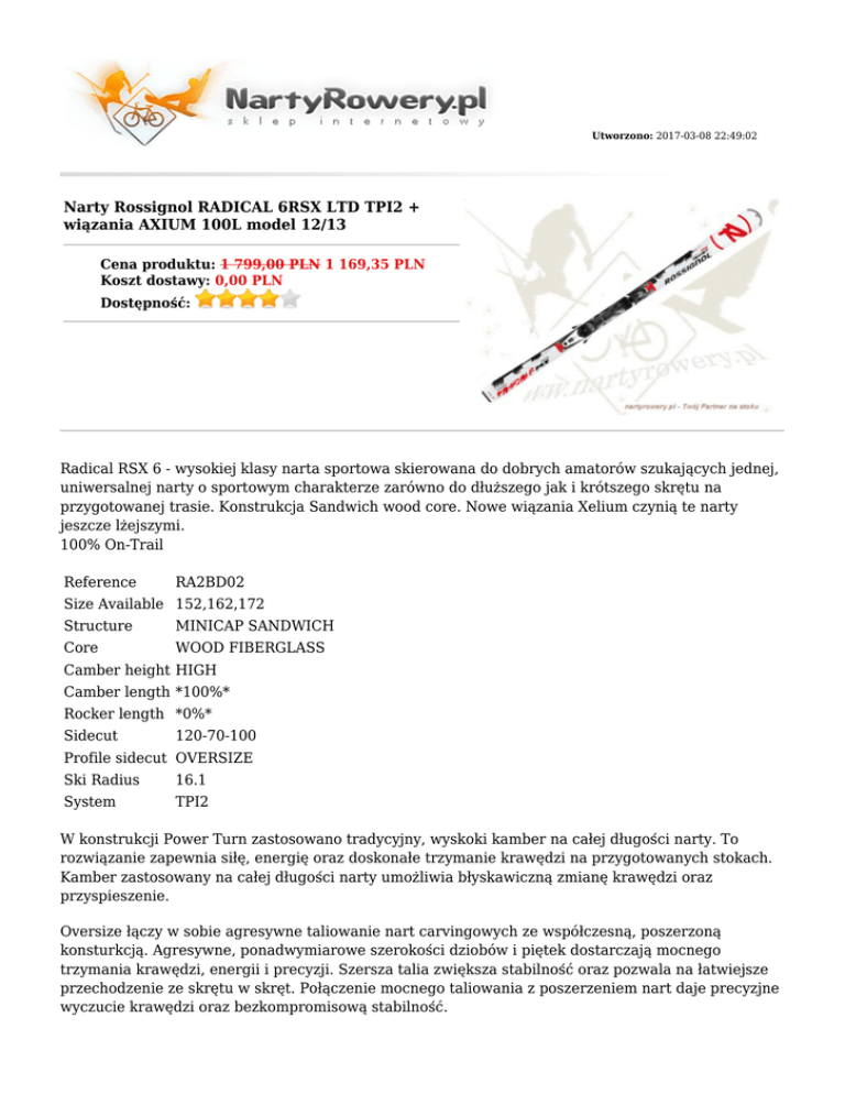 Utworzono: 2017-03-08 22:49:02 Narty Rossignol RADICAL 6RSX LTD TPI2 + wiązania AXIUM 100L model 12/13 Cena produktu: 1 799,00 PLN 1 169,35 PLN Koszt dostawy: 0,00 PLN Dostępność: Radical RSX 6 - wysokiej klasy narta sportowa skierowana do dobrych amatorów szukających jednej, uniwersalnej narty o sportowym charakterze zarówno do dłuższego jak i krótszego skrętu na przygotowanej trasie. Konstrukcja Sandwich wood core. Nowe wiązania Xelium czynią te narty jeszcze lżejszymi. 100% On-Trail Reference RA2BD02 Size Available 152,162,172 Structure MINICAP SANDWICH Core WOOD FIBERGLASS Camber height HIGH Camber length *100%* Rocker length *0%* Sidecut 120-70-100 Profile sidecut OVERSIZE Ski Radius 16.1 System TPI2 W konstrukcji Power Turn zastosowano tradycyjny, wyskoki kamber na całej długości narty. To rozwiązanie zapewnia siłę, energię oraz doskonałe trzymanie krawędzi na przygotowanych stokach. Kamber zastosowany na całej długości narty umożliwia błyskawiczną zmianę krawędzi oraz przyspieszenie. Oversize łączy w sobie agresywne taliowanie nart carvingowych ze współczesną, poszerzoną konsturkcją. Agresywne, ponadwymiarowe szerokości dziobów i piętek dostarczają mocnego trzymania krawędzi, energii i precyzji. Szersza talia zwiększa stabilność oraz pozwala na łatwiejsze przechodzenie ze skrętu w skręt. Połączenie mocnego taliowania z poszerzeniem nart daje precyzjne wyczucie krawędzi oraz bezkompromisową stabilność. TPi2: Twin Pulsion Integral Mocowanie wiązań odbywa się bez użycia narzędzi. Wiązanie z łatwością wsuwa się na paletę i łatwo ustawia. Płeć Męskie Zaawansowanie Średniozaawansowane Rdzeń WOOD FIBERGLASS Kształt b.d. Kolekcja zima 2012/13 Producent Rossignol Długości 162 cm, 172 cm, 152 cm Taliowanie (mm) Promień skrętu (m) 120-70-100 16,1m Struktura MINICAP SANDWICH Wiązanie AXIUM 100L Adres: http://nartyrowery.pl/ Telefon: 34 365 66 09 Email: [email protected] Gadu-Gadu: Skype: