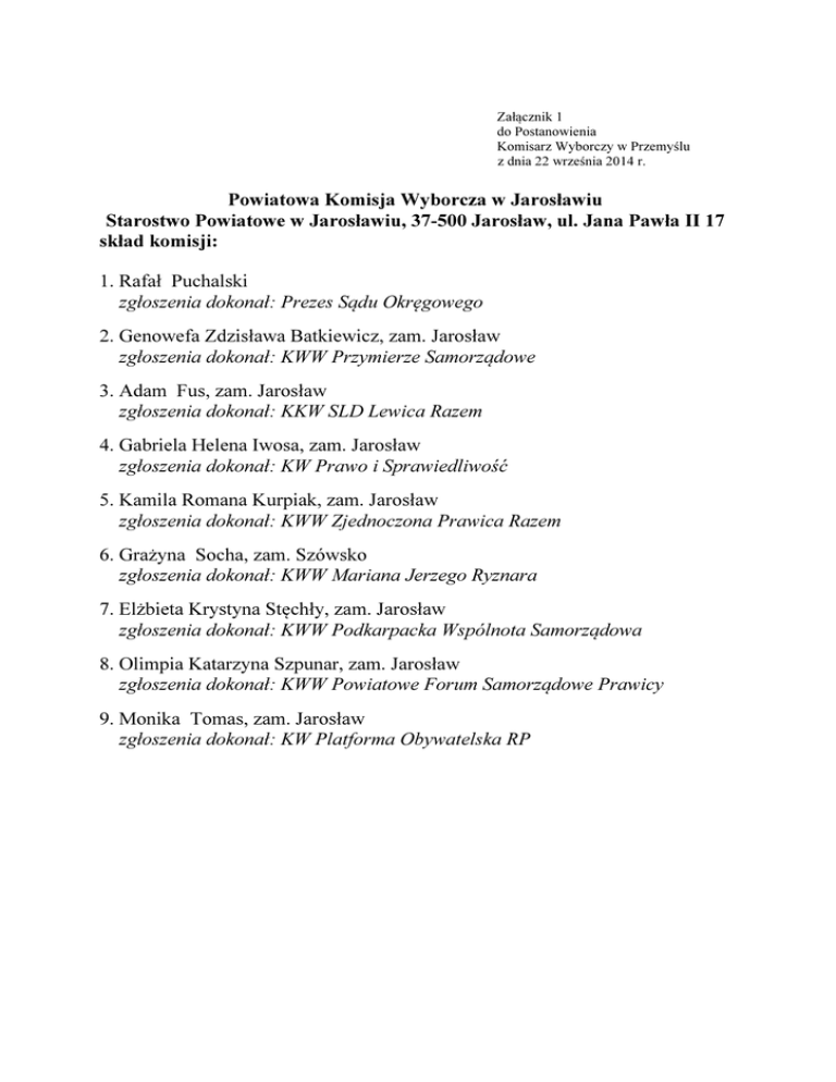 Załącznik 1 do Postanowienia Komisarz Wyborczy w Przemyślu z dnia 22 września 2014 r. Powiatowa Komisja Wyborcza w Jarosławiu Starostwo Powiatowe w Jarosławiu, 37-500 Jarosław, ul. Jana Pawła II 17 skład komisji: 1. Rafał Puchalski zgłoszenia dokonał: Prezes Sądu Okręgowego 2. Genowefa Zdzisława Batkiewicz, zam. Jarosław zgłoszenia dokonał: KWW Przymierze Samorządowe 3. Adam Fus, zam. Jarosław zgłoszenia dokonał: KKW SLD Lewica Razem 4. Gabriela Helena Iwosa, zam. Jarosław zgłoszenia dokonał: KW Prawo i Sprawiedliwość 5. Kamila Romana Kurpiak, zam. Jarosław zgłoszenia dokonał: KWW Zjednoczona Prawica Razem 6. Grażyna Socha, zam. Szówsko zgłoszenia dokonał: KWW Mariana Jerzego Ryznara 7. Elżbieta Krystyna Stęchły, zam. Jarosław zgłoszenia dokonał: KWW Podkarpacka Wspólnota Samorządowa 8. Olimpia Katarzyna Szpunar, zam. Jarosław zgłoszenia dokonał: KWW Powiatowe Forum Samorządowe Prawicy 9. Monika Tomas, zam. Jarosław zgłoszenia dokonał: KW Platforma Obywatelska RP Załącznik 2 do Postanowienia Komisarz Wyborczy w Przemyślu z dnia 22 września 2014 r. Powiatowa Komisja Wyborcza w Lubaczowie Starostwo Powiatowe w Lubaczowie (pokój nr 15), ul. Jasna 1, 37-600 Lubaczów skład komisji: 1. Artur Broś zgłoszenia dokonał: Prezes Sądu Okręgowego 2. Władysław Antoni Drop, zam. Oleszyce zgłoszenia dokonał: KKW SLD Lewica Razem 3. Dawid Dyś, zam. Lubaczów zgłoszenia dokonał: KW Platforma Obywatelska RP 4. Bogdan Skibiński, zam. Lubaczów zgłoszenia dokonał: KWW Forum Samorządowo Gospodarcze 5. Stanisława Ewa Szajowska, zam. Lubaczów zgłoszenia dokonał: KWW Ziemia Lubaczowska 6. Kazimierz Wać, zam. Lubaczów zgłoszenia dokonał: KW Prawo i Sprawiedliwość 7. Janusz Zastawny, zam. Lubaczów zgłoszenia dokonał: Komitet Wyborczy PSL Załącznik 3 do Postanowienia Komisarz Wyborczy w Przemyślu z dnia 22 września 2014 r. Powiatowa Komisja Wyborcza w Przemyślu Starostwo Powiatowe w Przemyślu, 37-700 Przemyśl, Plac Dominikański 3 skład komisji: 1. Janusz Kazienko zgłoszenia dokonał: Prezes Sądu Okręgowego 2. Piotr Jacek Gliński, zam. Brzeżawa zgłoszenia dokonał: KWW Powiatowe Forum Samorządowe Prawicy 3. Barbara Urszula Grodecka, zam. Stubno zgłoszenia dokonał: KW Stowarzyszenie "Wspólny Cel" 4. Janina Jamróz, zam. Łuczyce zgłoszenia dokonał: KWW Ruch Narodowy 5. Marta Koszykowska, zam. Orły zgłoszenia dokonał: KW Polska Razem Jarosława Gowina 6. Robert Paweł Mrozowicz, zam. Nehrybka zgłoszenia dokonał: KW Prawo i Sprawiedliwość 7. Kazimierz Roman Szołek, zam. Pikulice zgłoszenia dokonał: KWW Stowarzyszeni dla Powiatu 8. Zbigniew Walczak, zam. Wacławice zgłoszenia dokonał: Komitet Wyborczy PSL 9. Marta Maria Wilk, zam. Młodowice Osiedle zgłoszenia dokonał: KW Nowa Prawica — Janusza Korwin-Mikke Załącznik 4 do Postanowienia Komisarz Wyborczy w Przemyślu z dnia 22 września 2014 r. Powiatowa Komisja Wyborcza w Przeworsku Starostwo Powiatowe w Przeworsku, ul. Jagiellońska 10, 37-200 Przeworsk skład komisji: 1. Mariusz Fołta zgłoszenia dokonał: Prezes Sądu Okręgowego 2. Hubert Bilski, zam. Przeworsk zgłoszenia dokonał: KW Platforma Obywatelska RP 3. Marcin Łukasz Cieśliński, zam. Przeworsk zgłoszenia dokonał: KW Prawo i Sprawiedliwość 4. Hubert Jakub Curzytek, zam. Przeworsk zgłoszenia dokonał: KWW Nasz Samorządny Powiat 5. Wiesław Kwiatkowski, zam. Przeworsk zgłoszenia dokonał: KW Prawica 6. Jerzy Mazur, zam. Sieniawa zgłoszenia dokonał: KWW Nasz Samorządny Powiat Przeworski 7. Marek Piotr Nowak, zam. Gniewczyna Łańcucka zgłoszenia dokonał: Komitet Wyborczy PSL 8. Zofia Krystyna Plesnarowicz, zam. Przeworsk zgłoszenia dokonał: KWW "Przyjazny Samorząd" 9. Adam Józef Wójtowicz, zam. Przeworsk zgłoszenia dokonał: KKW SLD Lewica Razem Załącznik 5 do Postanowienia Komisarz Wyborczy w Przemyślu z dnia 22 września 2014 r. Miejska Komisja Wyborcza w Przemyślu Urząd Miejski w Przemyślu, 37-700 Przemyśl, Rynek 1 skład komisji: 1. Krzysztof Tryksza zgłoszenia dokonał: Prezes Sądu Okręgowego 2. Michał Dryjański, zam. Przemyśl zgłoszenia dokonał: KWW Przeserca Popierają Asterixa 3. Oktawia Agnieszka Gierczak, zam. Przemyśl zgłoszenia dokonał: KWW Twierdza Przemyśl 4. Henryka Alicja Kaszycka - Paniw, zam. Przemyśl zgłoszenia dokonał: KWW Roberta Chomy 5. Barbara Lech - Bembenek, zam. Przemyśl zgłoszenia dokonał: KW Polska Razem Jarosława Gowina 6. Radosław Piotr Makowiecki, zam. Przemyśl zgłoszenia dokonał: KW Prawo i Sprawiedliwość 7. Aneta Aniela Mróz - Kuźniak, zam. Przemyśl zgłoszenia dokonał: KWW Patriotyczny Polski Przemyśl 8. Janusz Antoni Pawłowski, zam. Przemyśl zgłoszenia dokonał: KW Prawica 9. Beata Szedl - Pawliszak, zam. Przemyśl zgłoszenia dokonał: KWW Ruch Narodowy Załącznik 6 do Postanowienia Komisarz Wyborczy w Przemyślu z dnia 22 września 2014 r. Miejska Komisja Wyborcza w Jarosławiu Urząd Miasta Jarosławia, Rynek 1, 37-500 Jarosław skład komisji: 1. Jan Adam Cyran, zam. Jarosław zgłoszenia dokonał: KWW Powiatowe Forum Samorządowe Prawicy 2. Zbigniew Dąbrowski, zam. Jarosław zgłoszenia dokonał: KW Stowarzyszenia "Rozwój i Postęp" 3. Waldemar Dyl, zam. Jarosław zgłoszenia dokonał: Komitet Wyborczy PSL 4. Józef Lis, zam. Jarosław zgłoszenia dokonał: KKW SLD Lewica Razem 5. Elżbieta Grażyna Mazur, zam. Jarosław zgłoszenia dokonał: KWW Wacława Spiradka 6. Anna Maria Rawska, zam. Jarosław zgłoszenia dokonał: KWW Mariusza Waltera 7. Rafał Piotr Solski, zam. Jarosław zgłoszenia dokonał: KWW Niezależni w Samorządzie 8. Jan Szczepan Wygnaniec, zam. Jarosław zgłoszenia dokonał: KWW Powiatowa Wspólnota Samorządowa 9. Dominik Żurawski, zam. Jarosław zgłoszenia dokonał: KWW Ruch Narodowy Załącznik 7 do Postanowienia Komisarz Wyborczy w Przemyślu z dnia 22 września 2014 r. Miejska Komisja Wyborcza w Radymnie Urząd Miasta Radymno, ul. Lwowska 20, 37-550 Radymno 