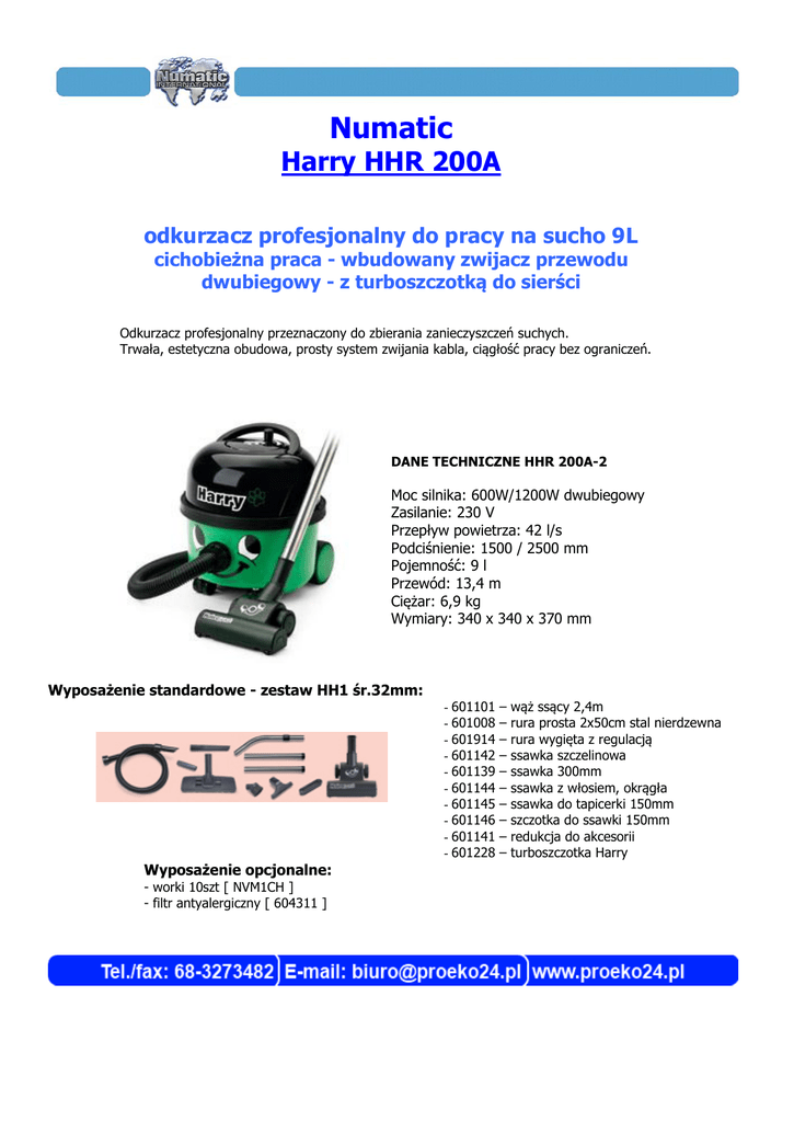 Numatic Harry HHR 200A odkurzacz profesjonalny do pracy na sucho 9L cichobieżna praca - wbudowany zwijacz przewodu dwubiegowy - z turboszczotką do sierści Odkurzacz profesjonalny przeznaczony do zbierania zanieczyszczeń suchych. Trwała, estetyczna obudowa, prosty system zwijania kabla, ciągłość pracy bez ograniczeń. DANE TECHNICZNE HHR 200A-2 Moc silnika: 600W/1200W dwubiegowy Zasilanie: 230 V Przepływ powietrza: 42 l/s Podciśnienie: 1500 / 2500 mm Pojemność: 9 l Przewód: 13,4 m Ciężar: 6,9 kg Wymiary: 340 x 340 x 370 mm Wyposażenie standardowe - zestaw HH1 śr.32mm: Wyposażenie opcjonalne: - worki 10szt [ NVM1CH ] - filtr antyalergiczny [ 604311 ] - 601101 - 601008 - 601914 - 601142 - 601139 - 601144 - 601145 - 601146 - 601141 - 601228 – – – – – – – – – – wąż ssący 2,4m rura prosta 2x50cm stal nierdzewna rura wygięta z regulacją ssawka szczelinowa ssawka 300mm ssawka z włosiem, okrągła ssawka do tapicerki 150mm szczotka do ssawki 150mm redukcja do akcesorii turboszczotka Harry