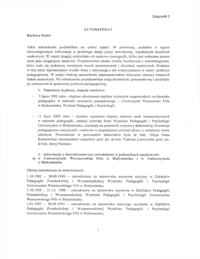 Tekst autoreferatu podzieliłam na cztery części. W pierwszej, podałam w ujęciu,