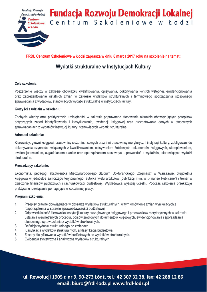 FRDL Centrum Szkoleniowe w Łodzi zaprasza w dniu 6 marca 2017 roku na szkolenie na temat: Wydatki strukturalne w Instytucjach Kultury Cele szkolenia: Poszerzenie wiedzy w zakresie obowiązku kwalifikowania, opisywania, dokonywania kontroli wstępnej, ewidencjonowania oraz zaprezentowanie ostatnich zmian w zakresie wydatków strukturalnych i terminowego sporządzania stosownego sprawozdania z wydatków, stanowiących wydatki strukturalne w instytucjach kultury. Korzyści z udziału w szkoleniu: Zdobycie wiedzy oraz praktycznych umiejętności w zakresie poprawnego stosowania aktualnie obowiązujących przepisów dotyczących zasad identyfikowania i klasyfikowania, ewidencji księgowej oraz prezentowania danych w stosownych sprawozdaniach z wydatków instytucji kultury, stanowiących wydatki strukturalne. Adresaci szkolenia: Kierownicy, główni księgowi, pracownicy służb finansowych oraz inni pracownicy merytoryczni instytucji kultury, zobligowani do dokonywania czynności związanych z kwalifikowaniem, opisywaniem źródłowych dokumentów księgowych, stemplowaniem, ewidencjonowaniem, uzgadnianiem stanów oraz sporządzaniem stosownych sprawozdań z wydatków, stanowiących wydatki strukturalne. Prowadzący szkolenie: Ekonomista, pedagog, absolwentka Międzynarodowego Studium Doktoranckiego „Orgmasz” w Warszawie, długoletnia księgowa w jednostce samorządu terytorialnego, autorka wielu artykułów (publikacji m.in. w „Finanse Publiczne”) i trener w dziedzinie finansów publicznych i rachunkowości budżetowej. Wykładowca wyższej uczelni. Podczas szkolenia przekazuje praktyczne rozwiązania pomagające w codziennej pracy. Program szkolenia: 1. 2. 3. 4. 5. 6. Przepisy prawne obowiązujące w obszarze wydatków strukturalnych, w tym omówienie zmian wynikających z rozporządzenia w sprawie sprawozdawczości budżetowej. Odpowiedzialność kierownika instytucji kultury oraz głównego księgowego i pracowników merytorycznych w zakresie ustalania wewnętrznych procedur, opisów źródłowych dokumentów księgowych, ewidencjonowania i sporządzania stosownego sprawozdania z wydatków strukturalnych. Definicja wydatku strukturalnego po zmianach. Klasyfikacja wydatków strukturalnych, a klasyfikacja budżetowa. Zasady klasyfikowania wydatków budżetowych do wydatków strukturalnych. Ewidencja syntetyczna i analityczna wydatków strukturalnych. ul. Rewolucji 1905 r. nr 9, 90-273 Łódź, tel.: 42 632 63 19, fax: 42 288 12 86 email: [email protected] www.frdl-lodz.pl 7. 8. 9. 10. 11. Regulacje wewnętrzne instytucji kultury w zakresie dokumentacji dotyczącej wydatków strukturalnych, w tym: zarządzenie kierownika jednostki, zasady opisywania i stemplowania dokumentu źródłowego, prowadzenie ewidencji, księgowanie, uproszczenia. Zasady i terminy sporządzenia sprawozdań z wydatków strukturalnych. Korekty w ewidencji księgowej i sprawozdawczości roku bieżącego i lat poprzednich. Przykładowe wydatki w instytucjach kultury, stanowiące wydatki strukturalne. Dyskusja. ul. Rewolucji 1905 r. nr 9, 90-273 Łódź, tel.: 42 632 63 19, fax: 42 288 12 86 email: [email protected] www.frdl-lodz.pl Informacje organizacyjne i warunki zgłoszeń: Szkolenie odbędzie się w siedzibie FRDL Centrum Szkoleniowego w Łodzi, ul. Rewolucji 1905 roku nr 9, II PIĘTRO (DOMOFON NR 36) 6 marca 2017 r. w godzinach 10.00 – 15.00. Cena szkolenia wynosi 290 zł netto przy zgłoszeniu do 22 lutego 2017. Cena po 22 lutym 2017 wynosi 319 zł netto. RABAT 10% dla drugiej i następnej osoby z tej samej instytucji. Zwolnione z VAT w przypadku finansowania ze środków publicznych. W cenie szkolenia materiały szkoleniowe, zaświadczenie, lunch oraz przerwy kawowe. Płatność przelewem na podstawie wystawionej faktury w dniu szkolenia. Prosimy o przesyłanie zgłoszeń 28 lutego 2017 r. na adres mailowy [email protected] wysyłając uzupełnioną kartę zgłoszenia faksem na numer wysyłając uzupełnioną kartę zgłoszenia 42 / 288 12 86 przez formularz elektroniczny zamieszczony na www.frdl-lodz.pl Szkolenia realizujemy również w formie zamkniętej na terenie instytucji. Zapytania prosimy kierować na adres mailowy [email protected] Zgłoszenie na szkolenie nt. Wydatki strukturalne w Instytucjach Kultury w dniu 6 marca 2017 r Instytucja (dane do faktury) ……………………………………………………………………………………………………………………………………………………………….. Adres: ....................................................................................................................................................... Tel: ...................................................................................................................... NIP: ..................................................................................... E-mail: ....................................................................................................................... Osoby delegowane do udziału w szkoleniu (prosimy o podanie imienia i nazwiska oraz stanowiska uczestnika szkolenia): 1. .................................................................................................................................................................................................................................................................... 2. .................................................................................................................................................................................................................................................................... 3. .................................................................................................................................................................................................................................................................... Oświadczam, że szkolenie dla ww. pracowników jest kształceniem zawodowym 