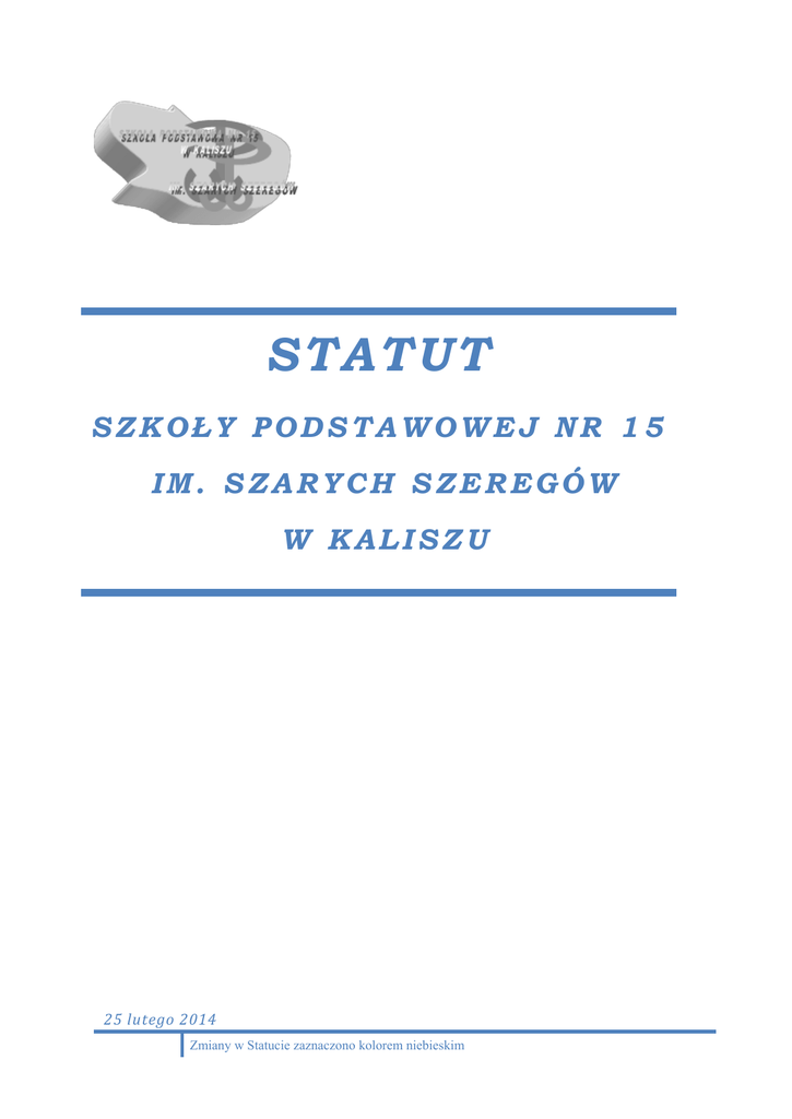 STATUT SZKOŁY PODSTAWOWEJ NR 15 IM. SZARYCH SZEREGÓW W KALISZU 25 lutego 2014 Zmiany w Statucie zaznaczono kolorem niebieskim STATUT Szkoły Podstawowej nr 15 w Kaliszu im. Szarych Szeregów SPIS TREŚCI ROZDZIAŁ I PRZEPISY OGÓLNE ....................................................................….……4 §1 Nazwa i adres szkoły ......................................................................................... 4 §2 Stempel i tablica szkoły ..................................................................................... 4 §3 Organizacja cyklu kształcenia ........................................................ ………………4 §4 Misja szkoły i model absolwenta ……………………………………………….……………5 ROZDZIAŁ II CELE I ZADANIA SZKOŁY ………………………………….......................... 7 §5 Cele i zadania szkoły ......................................................................................... 7 §6 Realizacja celów i zadań szkoły ........................................................................ 10 §7 Formy i sposoby realizacji zadań szkoły ........................................................... 13 §8 Opieka i bezpieczeństwo .................................................................................. 13 §9 Pomoc ............................................................................................................ 14 §10 Pomoc psychologiczno–pedagogiczna – inforacje ogólne .................................... 15 § 11 Formy pomocy psychologiczno-pedagogicznej .................................................. 16 §12 Organizacja popmocy psychologiczno-pedagogicznej pozostałym uczniom………20 §13 Obowiązki wychowawcy klasy i nauczycieli w zakresie wspierania uczniow…….22 §14 Zadania i obowiązki pedagoga szkolnego ………………………………………………..27 §15 Regulamin pracy zespołu wspierajacego ds. pomocy psychologiczno -pedagogicznej uczniom posiadającym orzeczenie o potrzebie kształcenia specjalnego…………..29 §16 Dokumentowanie organizacji i działań w zakresie pomocy psychologicznopedagogicznej …………………………………………………………………………………...30 §17 Organizacja nauczania uczniów niepelnosprawnych ………………………………….31 ROZDZIAŁ III ORGANIZACJA SZKOŁY. ................................................................. .35 §18 Zasady ogólne ................................................................................................. 35 §19 Rekrutacja uczniów ......................................................................................... 37 §20 Oddziały uczniowskie .. ................................................................................... 38 §21 Organizacja zajęć ............................................................................................ 38 §22 Zajęcia z podziałem na grupy .......................................................................... 39 §23 Praktyki pedagogiczne ..................................................................................... 39 §24 Wyżywienie ..................................................................................................... 39 §25 Biblioteka szkolna ........................................................................................... 40 §26 Świetlica szkolna ............................................................................................ 42 §27 Pomieszczenia szkoły ...................................................................................... 44 §28 Szkolne programy nauczania i podręczniki ...................................................... 45 §29 Innowacje pedagogiczne i zajęcia eksperymentalne .......................................... 45 §30 Warunki pobytu w szkole zapewniające uczniom bezpieczeństwo. .................... 46 §31 Współpraca z rodzicami ................................................................................... 47 §32 Sposób prowadzenia dokumentacji przebiegu nauczania, działalności wychowawczej i opiekuńczej oraz rodzajów tej dokumentacji ..................................... 48 ROZDZIAŁ IV ORGANY SZKOŁY I ICH KOMPETENCJE ......................................... 51 §33 Organy szkoły ................................................................................................. 51 §34 Dyrektor szkoły ............................................................................................... 52 §35 Rada Pedagogiczna ......................................................................................... 57 §36 Rada Rodziców ................................................................................................ 59 §37 Samorząd Uczniowski ..................................................................................... 62 §38 Współpraca organów szkoły ............................................................................. 62 §39 Rozstrzyganie sporów pomiędzy organami........................................................ 63 ROZDZIAŁ V NAUCZYCIELE I INNI PRACOWNICY SZKOŁY ................................... 65 §40 Zasady zatrudniania ....................................................................................... 65 §41 Pedagog szkolny .............................................................................................. 66 §42 Nauczyciel ...................................................................................................... 67 §43 Zadania zespołów nauczycielskich ................................................................... 71 §44 Nauczyciel wychowawca - informacje ogólne .................................................... 72 2 STATUT Szkoły Podstawowej nr 15 w Kaliszu im. Szarych Szeregów §45 Prawa wychowacy, wskazówki do pracy ……………………………………………