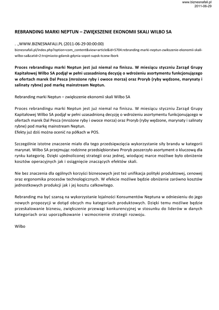 www.biznesnafali.pl 2011-06-29 REBRANDING MARKI NEPTUN – ZWIĘKSZENIE EKONOMII SKALI WILBO SA . .,WWW.BIZNESNAFALI.PL (2011-06-29 00:00:00) biznesnafali.pl/index.php?option=com_content&view=article&id=5704:rebranding-marki-neptun-zwikszenie-ekonomii-skaliwilbo-sa&catid=2:trojmiasto-gdansk-gdynia-sopot-supsk-tczew-lbork Proces rebrandingu marki Neptun jest już niemal na finiszu. W miesiącu styczniu Zarząd Grupy Kapitałowej Wilbo SA podjął w pełni uzasadnioną decyzję o wdrożeniu asortymentu funkcjonującego w ofertach marek Dal Pesca (mrożone ryby i owoce morza) oraz Proryb (ryby wędzone, marynaty i salinaty rybne) pod markę mainstream Neptun. Rebranding marki Neptun – zwiększenie ekonomii skali Wilbo SA Proces rebrandingu marki Neptun jest już niemal na finiszu. W miesiącu styczniu Zarząd Grupy Kapitałowej Wilbo SA podjął w pełni uzasadnioną decyzję o wdrożeniu asortymentu funkcjonującego w ofertach marek Dal Pesca (mrożone ryby i owoce morza) oraz Proryb (ryby wędzone, marynaty i salinaty rybne) pod markę mainstream Neptun. Efekty już dziś można ocenić na półkach w POS. Szczególnie istotne znaczenie miało dla tego przedsięwzięcia wykorzystanie siły brandu w kategorii marynat. Wilbo SA przejmując rodzinne przedsiębiorstwo Proryb poszerzyło asortyment o kluczową dla rynku kategorię. Dzięki ujednoliconej strategii oraz jednej, wiodącej marce możliwe było obniżenie kosztów operacyjnych jak i osiągnięcie znaczących efektów skali. Nie bez znaczenia dla ogólnych korzyści biznesowych jest też unifikacja polityki produktowej, cenowej oraz ergonomika procesów technologicznych. W efekcie możliwe będzie obniżenie zarówno kosztów jednostkowych produkcji jak i jej kosztu całkowitego. Rebranding ma być szansą na wykorzystanie lojalności Konsumentów Neptuna w odniesieniu do jego nowych propozycji w dotąd obcych mu kategoriach produktowych. Dzięki temu możliwe będzie przeskalowanie biznesu, zwiększenie przewagi konkurencyjnej w stosunku do liderów w danych kategoriach oraz uporządkowanie i wzmocnienie strategii rozwoju. Wilbo