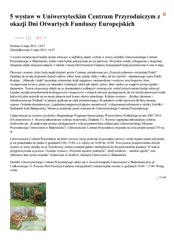 5 wystaw w Uniwersyteckim Centrum Przyrodniczym z okazji Dni Otwartych Funduszy Europejskich Lubię to! 0 0 Dodana: 6 maja 2015, 14:27 Zmodyfikowana: 6 maja 2015, 14:27 5 wystaw tematycznych będzie można zobaczyć w najbliższy piątek i sobotę w nowej siedzibie Uniwersyteckiego Centrum Przyrodniczego w Białymstoku. Jedna z nich będzie pokazywana po raz pierwszy. Wszystkie zostały wzbogacone o eksponaty zakupione dzięki dotacjom unijnym. I właśnie z okazji Dni Otwartych Funduszy Europejskich będą prezentowane 8 oraz 9 maja. Pierwsza z wystaw, które będą mogli obejrzeć goście Centrum, zatytułowana jest „Przyroda północno-wschodniej Polski”. Znajdują się na niej eksponaty dużych ssaków: żubra, łosia, jelenia, dzika i wilka, ale też ryjówki – najmniejszego ssaka Polski. Kolejna - „Minerały i skały” prezentuje różnorodne skały magmowe, metamorficzne i osadowe oraz bogactwo form występowania kwarcu, pirytu czy minerałów rodzimych, takich jak miedź, srebro, złoto, siarka czy węgiel w postaci grafitu i diamentów. Trzecia ekspozycja składa się ze skamieniałości roślinnych i zwierzęcych, wśród których można będzie zobaczyć kopalne szczątki przedstawicieli bezkręgowców i kręgowców z różnych okresów geologicznych, ale też odciski pierwszych roślin lądowych jakie pojawiły się na naszej planecie pod koniec okresu sylurskiego. Kolejna wystawa - „Rośliny chronione i charakterystyczne Podlasia” to plansze graficzne na szkle przedstawiające 60 gatunków roślin typowych dla flory naszego regionu. Ostatnim elementem jest „Lapidarium magmowych głazów narzutowych” z eksponatami zebranymi w okolicy Sokółki i Studzianek koło Białegostoku. Można je podziwiać przed wejściem do Uniwersyteckiego Centrum Przyrodniczego. Unijna dotacja na wystawy pochodzi z Regionalnego Programu Operacyjnego Województwa Podlaskiego na lata 2007-2013 (Oś priorytetowa V. Rozwój infrastruktury ochrony środowiska, Działanie 5.1. Rozwój regionalnej infrastruktury ochrony środowiska pn. „Kształtowanie postaw ekologicznych z wykorzystaniem bazy edukacyjnej Uniwersyteckiego Muzeum Przyrodniczego Uniwersytetu w Białymstoku”). Uniwersyteckie Centrum Przyrodnicze otrzymało na swój projekt ponad 276 tys. zł. Uniwersyteckie Centrum Przyrodnicze na dobre otworzy swoje podwoje na początku czerwca i wtedy będzie można odwiedzać je od poniedziałku do piątku w godzinach 9.00-15.00, a w soboty od 10.00 do 16.00. Trwa jeszcze przeprowadzka dwóch wystaw ze starej siedziby na ul. Świerkowej, montaż ostatnich gablot i niezbędnych do ich podświetlenia instalacji. W trakcie przygotowywania są jeszcze 3 kolejne wystawy: „Przyroda rejonów polarnych”, „Rafy koralowe – morskie ogrody” oraz „Bursztyn i inne żywice kopalne” realizowane ze środków własnych Uniwersytetu w Białymstoku. Siedziba Uniwersyteckiego Centrum Przyrodniczego mieści się w nowym kampusie Uniwersytetu w Białymstoku przy ul. Ciołkowskiego 1J. Podczas Dni Otwartych Funduszy Europejskich Centrum będzie otwarte w godzinach 10.00 - 17.00. Wstęp wolny. UwB