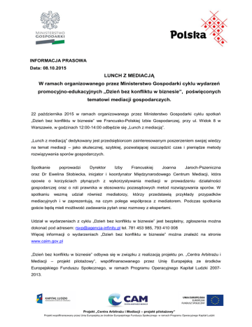 INFORMACJA PRASOWA Data: 08.10.2015 LUNCH Z MEDIACJĄ W ramach organizowanego przez Ministerstwo Gospodarki cyklu wydarzeń promocyjno-edukacyjnych „Dzień bez konfliktu w biznesie”, poświęconych tematowi mediacji gospodarczych. 22 października 2015 w ramach organizowanego przez Ministerstwo Gospodarki cyklu spotkań „Dzień bez konfliktu w biznesie” we Francusko-Polskiej Izbie Gospodarczej, przy ul. Widok 8 w Warszawie, w godzinach 12:00-14:00 odbędzie się „Lunch z mediacją”. „Lunch z mediacją” dedykowany jest przedsiębiorcom zainteresowanym poszerzeniem swojej wiedzy na temat mediacji – jako skutecznej, szybkiej, pozwalającej oszczędzić czas i pieniądze metody rozwiązywania sporów gospodarczych. Spotkanie poprowadzi Dyrektor Izby Francuskiej Joanna Jaroch-Pszeniczna oraz Dr Ewelina Stobiecka, inicjator i koordynator Międzynarodowego Centrum Mediacji, która opowie o korzyściach płynących z wykorzystywania mediacji w prowadzeniu działalności gospodarczej oraz o roli prawnika w stosowaniu pozasądowych metod rozwiązywania sporów. W spotkaniu wezmą udział również mediatorzy, którzy przedstawią przykłady przypadków mediacyjnych i w zaprezentują, na czym polega współpraca z mediatorem. Podczas spotkania goście będą mieli możliwość zadawania pytań oraz rozmowy z ekspertami. Udział w wydarzeniach z cyklu „Dzień bez konfliktu w biznesie” jest bezpłatny, zgłoszenia można dokonać pod adresem: [email protected] tel. 781 453 985, 793 410 008 Więcej informacji o wydarzeniach „Dzień bez konfliktu w biznesie” można znaleźć na stronie www.caim.gov.pl „Dzień bez konfliktu w biznesie” odbywa się w związku z realizacją projektu pn. „Centra Arbitrażu i Mediacji – projekt pilotażowy”, współfinansowanego przez Unię Europejską ze środków Europejskiego Funduszu Społecznego, w ramach Programu Operacyjnego Kapitał Ludzki 20072013. Projekt „Centra Arbitrażu i Mediacji – projekt pilotażowy” Projekt współfinansowany przez Unię Europejską ze środków Europejskiego Funduszu Społecznego w ramach Programu Operacyjnego Kapitał Ludzki 2 Partnerami wydarzeń „Dzień bez konfliktu w biznesie” są: Międzynarodowe Centrum Mediacji, Belgijska Izba Gospodarcza, Brytyjsko-Polska Izba Handlowa, Francusko-Polska Izba Gospodarcza, Włoska Izba Handlowo Przemysłowa w Polsce, PolskoHiszpańska Izba Gospodarcza, Fundacja Rozwoju Mediacji, Polskie Stowarzyszenie Prawników Przedsiębiorstw, MABOR – Centrum Doradztwa i Szkoleń, Mediationsakademie Berlin, Centre for Effective Dispute Resolution (CEDR) Londyn. KONTAKT: Aleksandra Ladachowska Agencja INFINITY PR&MarComm Tel.: + 48 793 41 00 08, E-Mail: [email protected] O PROJEKCIE CENTRA MEDIACJI I ARBITRAŻU W 2014 roku Ministerstwo Gospodarki zainicjowało Projekt „Centra Arbitrażu i Mediacji – projekt pilotażowy”, w ramach którego powołano w Polsce sześć regionalnych, działających wg jednolitych zasad, Centrów Arbitrażu i Mediacji (CAM): w Białymstoku, Katowicach, Krakowie, Lublinie, Poznaniu i Warszawie. Wśród Partnerów Projektu realizowanego przez Ministerstwo są organizacje przedsiębiorców, izby gospodarcze i uczelnie wyższe. Projekt jest realizowany z funduszy europejskich w ramach Programu Operacyjnego Kapitał Ludzki 2007-2013. Projekt zakłada podniesienie poziomu wiedzy oraz wzrost świadomości na temat alternatywnych metod rozwiązywania sporów (ADR), w szczególności gospodarczych, poprzez podejmowanie działań edukacyjno-szkoleniowych oraz promocyjnych. W ramach projektu CAM przewidziane jest ułatwienie dostępu do ADR, w szczególności do mediacji, poprzez uruchomienie sieci Centrów Arbitrażu i Mediacji. Centra będą skupiały się na prowadzeniu mediacji pozasądowej, z zachowaniem możliwości mediacji sądowej, co do zasady między podmiotami gospodarczymi. Celem działalności Centrów jest obniżenie kosztów rozwiązywania konfliktów ponoszonych przez przedsiębiorców, w szczególności poprzez zmniejszenie finansowych obciążeń związanych z postępowaniem sądowym oraz skrócenie czasu rozstrzygania sporów. ZAKŁADANE EFEKTY: integracja środowiska - współpraca z partnerami społecznymi doprowadzi do zwiększenia aktywności organizacji zajmujących się tematyką ADR na własnym terenie, wzrost liczby mediacji w regionach, rozpowszechnienie wiedzy na temat ADR – dzięki kampanii informacyjnej oraz działaniom edukacyjnym. KORZYŚCI Z CAM: zmniejszenie liczby spraw rozstrzyganych w wydziałach cywilnych i gospodarczych sądów powszechnych, przyspieszenie rozpoznawania spraw przez sądy powszechne wskutek zmniejszenia wpływu oraz szerszego korzystania przez sędziów z instytucji skierowania sprawy do postępowania mediacyjnego, znaczące obniżenie kosztów rozwiązywania sporów, w szczególności między przedsiębiorcami, rzeczywista analiza przyczyn sporu i możliwość dalszej współpracy między skonfliktowanymi stronami, zwiększenie kultury prawnej, w szczególności kultury rozwiązywania sporów wśród polskich przedsiębiorców, popularyzacja alternatywnych metod rozwiązywania sporów wśród polskich przedsiębiorców oraz prawników, w tym sędziów. Projekt „Centra Arbitrażu i Mediacji – projekt pilotażowy” Projekt współfinansowany przez Unię Europejską ze środków Europejskiego Funduszu Społecznego w ramach Programu Operacyjnego Kapitał Ludzki