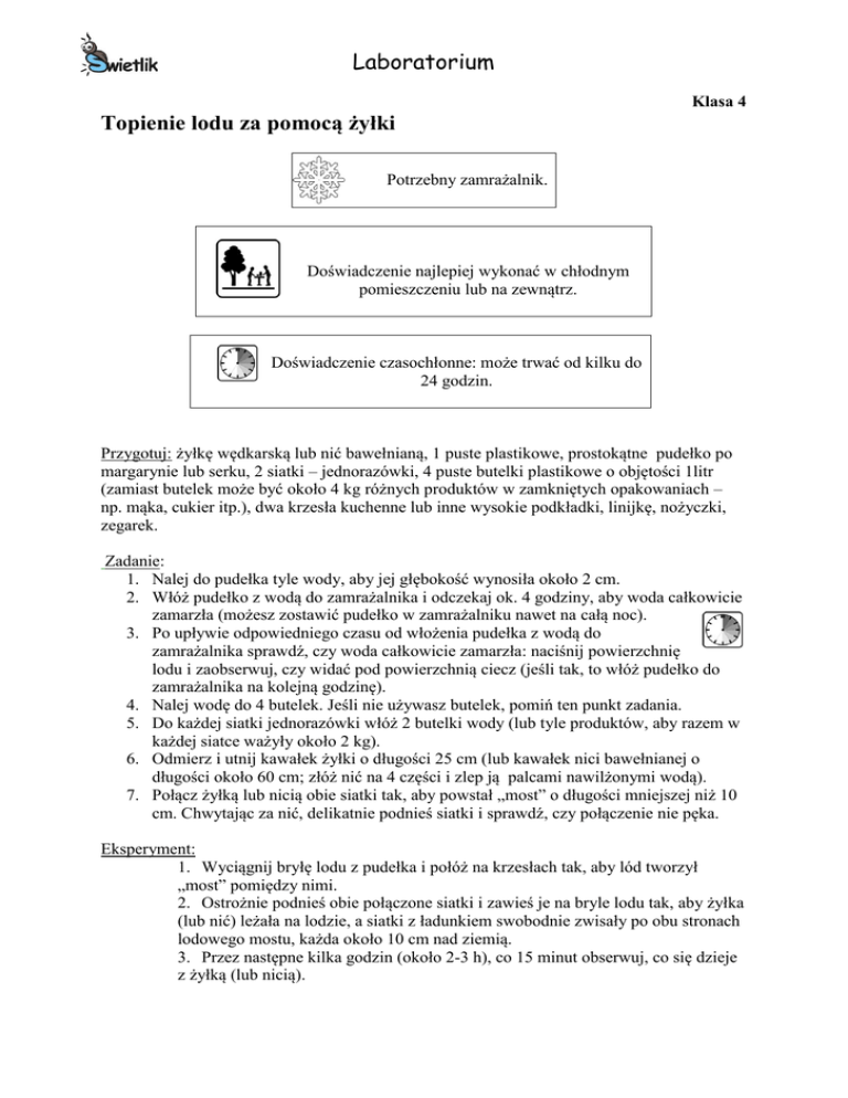 Laboratorium Klasa 4 Topienie lodu za pomocą żyłki Potrzebny zamrażalnik. Doświadczenie najlepiej wykonać w chłodnym pomieszczeniu lub na zewnątrz. Doświadczenie czasochłonne: może trwać od kilku do 24 godzin. Przygotuj: żyłkę wędkarską lub nić bawełnianą, 1 puste plastikowe, prostokątne pudełko po margarynie lub serku, 2 siatki – jednorazówki, 4 puste butelki plastikowe o objętości 1litr (zamiast butelek może być około 4 kg różnych produktów w zamkniętych opakowaniach – np. mąka, cukier itp.), dwa krzesła kuchenne lub inne wysokie podkładki, linijkę, nożyczki, zegarek. Zadanie: 1. Nalej do pudełka tyle wody, aby jej głębokość wynosiła około 2 cm. 2. Włóż pudełko z wodą do zamrażalnika i odczekaj ok. 4 godziny, aby woda całkowicie zamarzła (możesz zostawić pudełko w zamrażalniku nawet na całą noc). 3. Po upływie odpowiedniego czasu od włożenia pudełka z wodą do zamrażalnika sprawdź, czy woda całkowicie zamarzła: naciśnij powierzchnię lodu i zaobserwuj, czy widać pod powierzchnią ciecz (jeśli tak, to włóż pudełko do zamrażalnika na kolejną godzinę). 4. Nalej wodę do 4 butelek. Jeśli nie używasz butelek, pomiń ten punkt zadania. 5. Do każdej siatki jednorazówki włóż 2 butelki wody (lub tyle produktów, aby razem w każdej siatce ważyły około 2 kg). 6. Odmierz i utnij kawałek żyłki o długości 25 cm (lub kawałek nici bawełnianej o długości około 60 cm; złóż nić na 4 części i zlep ją palcami nawilżonymi wodą). 7. Połącz żyłką lub nicią obie siatki tak, aby powstał „most” o długości mniejszej niż 10 cm. Chwytając za nić, delikatnie podnieś siatki i sprawdź, czy połączenie nie pęka. Eksperyment: 1. Wyciągnij bryłę lodu z pudełka i połóż na krzesłach tak, aby lód tworzył „most” pomiędzy nimi. 2. Ostrożnie podnieś obie połączone siatki i zawieś je na bryle lodu tak, aby żyłka (lub nić) leżała na lodzie, a siatki z ładunkiem swobodnie zwisały po obu stronach lodowego mostu, każda około 10 cm nad ziemią. 3. Przez następne kilka godzin (około 2-3 h), co 15 minut obserwuj, co się dzieje z żyłką (lub nicią). Laboratorium Obserwacja: 1. Czy żyłka (nić) zagłębia się w bryle lodu, czy pozostaje na jej powierzchni? 2. Do czego może to doprowadzić, zanim cała bryła lodu stopnieje? 3. Dlaczego cała bryła lodu w końcu stopnieje całkowicie? Komentarz: W temperaturze poniżej zera bryła lodu nie topnieje w całości, ale może się rozmrozić w pewnych miejscach pod wpływem dużego ciśnienia (czyli dużego nacisku w tym miejscu na małą powierzchnię lodu). Takie topnienie pod wpływem wysokiego ciśnienia nazywa się regelacją. Lód pod żyłką (nicią) topnieje, bo żyłka (nić) ma małą powierzchnię i są do niej przyczepione ciężary w siatkach. Na skutek regelacji żyłka (nić) zatapia się w lodzie. Jednakże tuż nad żyłką (nicią) woda z powrotem zamarza, bo tam nie działa na nią już duże ciśnienie, a temperatura w tym miejscu (temperatura lodu) wciąż jest mniejsza od zera. Zjawisko regelacji można zaobserwować także na lodowisku. Łyżwiarz wywiera duże ciśnienie na lód, bo krawędź łyżwy jest bardzo cienka, a łyżwiarz dużo waży. Ciśnienie to powoduje topienie cienkiej warstwy lodu pod łyżwą. Dzięki niej, łyżwa stabilnie porusza się po lodzie. Cienka warstwa wody ponownie zamarza, natychmiast, gdy łyżwiarz się oddali.
