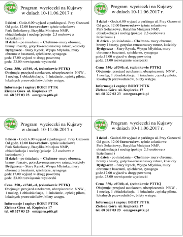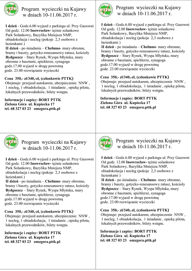 Program wycieczki na Kujawy w dniach 10-11.06.2017 r. Program wycieczki na Kujawy w dniach 10-11.06.2017 r. I dzień - Godz.6.00 wyjazd z parkingu ul. Przy Gazowni Od godz. 12.00 Inowrocław- tężnie solankowe Park Solankowy, Bazylika Mniejsza NMP, obiadokolacja i nocleg (pokoje 2,3 osobowe z łazienkami ) II dzień - po śniadaniu – Chełmno- mury obronne, bramy i baszty, gotycko-renesansowy ratusz, kościoły Bydgoszcz – Stary Rynek, Wyspa Młyńska, mury obronne z basztami, spichlerze, synagoga godz.17.00 wyjazd w drogę powrotną godz. 23.00 rozwiązanie wycieczki I dzień - Godz.6.00 wyjazd z parkingu ul. Przy Gazowni Od godz. 12.00 Inowrocław- tężnie solankowe Park Solankowy, Bazylika Mniejsza NMP, obiadokolacja i nocleg (pokoje 2,3 osobowe z łazienkami ) II dzień - po śniadaniu – Chełmno- mury obronne, bramy i baszty, gotycko-renesansowy ratusz, kościoły Bydgoszcz – Stary Rynek, Wyspa Młyńska, mury obronne z basztami, spichlerze, synagoga godz.17.00 wyjazd w drogę powrotną godz. 23.00 rozwiązanie wycieczki Cena 350,- zł/340,-zł, (członkowie PTTK) Obejmuje: przejazd autokarem, ubezpieczenie NNW , 1 nocleg, 1 obiadokolacja, 1 śniadanie , opiekę pilota, lokalnych przewodników, bilety wstępu. Cena 350,- zł/340,-zł, (członkowie PTTK) Obejmuje: przejazd autokarem, ubezpieczenie NNW , 1 nocleg, 1 obiadokolacja, 1 śniadanie , opiekę pilota, lokalnych przewodników, bilety wstępu. Informacje i zapisy: BORT PTTK Zielona Góra ul. Kupiecka 17 tel. 68 327 03 23 omzgora.pttk.pl Informacje i zapisy: BORT PTTK Zielona Góra ul. Kupiecka 17 tel. 68 327 03 23 omzgora.pttk.pl Program wycieczki na Kujawy w dniach 10-11.06.2017 r. Program wycieczki na Kujawy w dniach 10-11.06.2017 r. I dzień - Godz.6.00 wyjazd z parkingu ul. Przy Gazowni Od godz. 12.00 Inowrocław- tężnie solankowe Park Solankowy, Bazylika Mniejsza NMP, obiadokolacja i nocleg (pokoje 2,3 osobowe z łazienkami ) II dzień - po śniadaniu – Chełmno- mury obronne, bramy i baszty, gotycko-renesansowy ratusz, kościoły Bydgoszcz – Stary Rynek, Wyspa Młyńska, mury obronne z basztami, spichlerze, synagoga godz.17.00 wyjazd w drogę powrotną godz. 23.00 rozwiązanie wycieczki I dzień - Godz.6.00 wyjazd z parkingu ul. Przy Gazowni Od godz. 12.00 Inowrocław- tężnie solankowe Park Solankowy, Bazylika Mniejsza NMP, obiadokolacja i nocleg (pokoje 2,3 osobowe z łazienkami ) II dzień - po śniadaniu – Chełmno- mury obronne, bramy i baszty, gotycko-renesansowy ratusz, kościoły Bydgoszcz – Stary Rynek, Wyspa Młyńska, mury obronne z basztami, spichlerze, synagoga godz.17.00 wyjazd w drogę powrotną godz. 23.00 rozwiązanie wycieczki Cena 350,- zł/340,-zł, (członkowie PTTK) Obejmuje: przejazd autokarem, ubezpieczenie NNW , 1 nocleg, 1 obiadokolacja, 1 śniadanie , opiekę pilota, lokalnych przewodników, bilety wstępu. Cena 350,- zł/340,-zł, (członkowie PTTK) Obejmuje: przejazd autokarem, ubezpieczenie NNW , 1 nocleg, 1 obiadokolacja, 1 śniadanie , opiekę pilota, lokalnych przewodników, bilety wstępu. Informacje i zapisy: BORT PTTK Zielona Góra ul. Kupiecka 17 tel. 68 327 03 23 omzgora.pttk.pl Informacje i zapisy: BORT PTTK Zielona Góra ul. Kupiecka 17 tel. 68 327 03 23 omzgora.pttk.pl