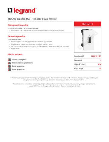 MOSAIC Gniazdo USB - 1 moduł BIAŁE żeńskie Charakterystyka ogólna 078761 Gniazda informatyczne Program Mosaic Mechanizm do montażu w uchytach instalacyjnych Programu Mosaic Parametry produktu USB żeńskie białe Pozwalają na instalację podłączeń blisko użytkownika Podłączenie na zaciski śrubowe, przekrój kabla 1 mm2 Do podłączania urządzeń USB (drukarki, skanery, zewnętrzne dyski twarde) Kabel: USB Pliki do pobrania Strona katalogowa Potwierdzenie Zgodności IŁ Dane techniczne Dane techniczne Cena bez VAT 119,6 ZŁ / SZ. 1 Pakowanie Objętość (dm³) 0,54 Waga (dag) * Podane ceny są cenami katalogowymi producenta dla klientów biznesowych w Polsce. Nie stanowią podstawy do utrzymywania ceny odsprzedaży. Ceny nie zawierają podatku VAT. Styczeń 2017 r. Wszelkie dane zawarte w e-katalogu Legrand (np. charakterystyki, rysunki, zdjęcia, ceny) mogą ulec zmianie. Legrand Polska zastrzega sobie prawo do dokonywania tych zmian. 35