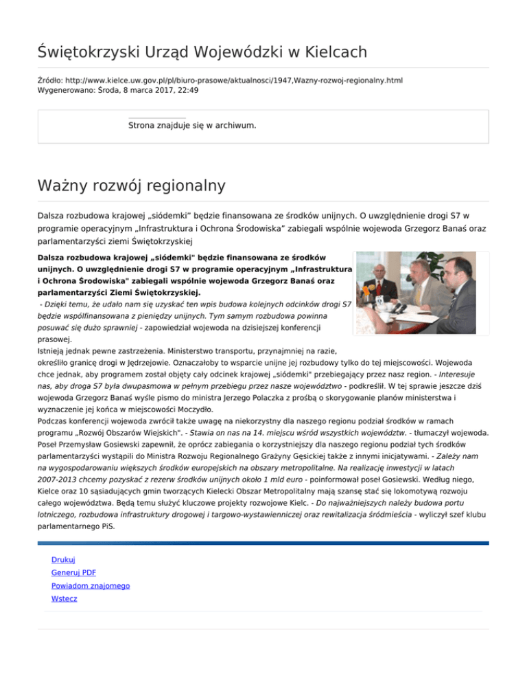 Świętokrzyski Urząd Wojewódzki w Kielcach Źródło: http://www.kielce.uw.gov.pl/pl/biuro-prasowe/aktualnosci/1947,Wazny-rozwoj-regionalny.html Wygenerowano: Środa, 8 marca 2017, 22:49 Strona znajduje się w archiwum. Ważny rozwój regionalny Dalsza rozbudowa krajowej „siódemki” będzie finansowana ze środków unijnych. O uwzględnienie drogi S7 w programie operacyjnym „Infrastruktura i Ochrona Środowiska” zabiegali wspólnie wojewoda Grzegorz Banaś oraz parlamentarzyści ziemi Świętokrzyskiej Dalsza rozbudowa krajowej „siódemki" będzie finansowana ze środków unijnych. O uwzględnienie drogi S7 w programie operacyjnym „Infrastruktura i Ochrona Środowiska" zabiegali wspólnie wojewoda Grzegorz Banaś oraz parlamentarzyści Ziemi Świętokrzyskiej. - Dzięki temu, że udało nam się uzyskać ten wpis budowa kolejnych odcinków drogi S7 będzie wspólfinansowana z pieniędzy unijnych. Tym samym rozbudowa powinna posuwać się dużo sprawniej - zapowiedział wojewoda na dzisiejszej konferencji prasowej. Istnieją jednak pewne zastrzeżenia. Ministerstwo transportu, przynajmniej na razie, określiło granicę drogi w Jędrzejowie. Oznaczałoby to wsparcie unijne jej rozbudowy tylko do tej miejscowości. Wojewoda chce jednak, aby programem został objęty cały odcinek krajowej „siódemki" przebiegający przez nasz region. - Interesuje nas, aby droga S7 była dwupasmowa w pełnym przebiegu przez nasze województwo - podkreślił. W tej sprawie jeszcze dziś wojewoda Grzegorz Banaś wyśle pismo do ministra Jerzego Polaczka z prośbą o skorygowanie planów ministerstwa i wyznaczenie jej końca w miejscowości Moczydło. Podczas konferencji wojewoda zwrócił także uwagę na niekorzystny dla naszego regionu podział środków w ramach programu „Rozwój Obszarów Wiejskich". - Stawia on nas na 14. miejscu wśród wszystkich województw. - tłumaczył wojewoda. Poseł Przemysław Gosiewski zapewnił, że oprócz zabiegania o korzystniejszy dla naszego regionu podział tych środków parlamentarzyści wystąpili do Ministra Rozwoju Regionalnego Grażyny Gęsickiej także z innymi inicjatywami. - Zależy nam na wygospodarowaniu większych środków europejskich na obszary metropolitalne. Na realizację inwestycji w latach 2007-2013 chcemy pozyskać z rezerw środków unijnych około 1 mld euro - poinformował poseł Gosiewski. Według niego, Kielce oraz 10 sąsiadujących gmin tworzących Kielecki Obszar Metropolitalny mają szansę stać się lokomotywą rozwoju całego województwa. Będą temu służyć kluczowe projekty rozwojowe Kielc. - Do najważniejszych należy budowa portu lotniczego, rozbudowa infrastruktury drogowej i targowo-wystawienniczej oraz rewitalizacja śródmieścia - wyliczył szef klubu parlamentarnego PiS. Drukuj Generuj PDF Powiadom znajomego Wstecz