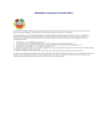 Beskidzkie warsztaty trenerskie [Akt.] Wydział Szkolenia BOZPN w Bielsku-Białej organizuje Beskidzkie Warsztaty Trenerskie, których celem jest integracja środowiska trenerów regionu oraz wymiana poglądów i doświadczeń w zakresie szkolenia, przede wszystkim dzieci i młodzieży. Pierwsze spotkanie w ramach Beskidzkich Warsztatów Trenerskich odbędzie się zgodnie z planem 20 marca we środę – ze względów technicznych niewielkiej zmianie uległa jednak godzina rozpoczęcia (godz.16.00 zamiast pierwotnie 17.00) oraz miejsce spotkania (sala konferencyjna w Hotelu BTS Rekord zamiast pierwotnie auli SMS Rekord). Znany też jest plan spotkania, które odbędzie się według następujących punktów: 1. Wprowadzenie – Prezes BOZPN Czesław Biskup – 10’ 2. Trening funkcjonalny w młodzieżowej piłce nożnej – Dominik Chałupnik (trener BBTS Podbeskidzie) – 25’ 3. Szczegółowość w ćwiczeniach techniczno-taktycznych Andrzej Rybarski (trener koordynator BBTS Podbeskidzie) – 25’ 4. Pokazowy trening do punktów 2 i 3 – D.Chałupnik i A.Rybarski – 45’ 5. Panel dyskusyjny do punktów 2-4 oraz wnioski i spostrzeżenia co do formuły Beskidzkich Warsztatów Trenerskich oraz anonimowa ankieta diagnostyczna w zakresie potrzeb tematycznych 6. Wydanie certyfikatów – potwierdzeń udziału w spotkaniu, które będą honorowane przy przedłużaniu licencji trenerskich W dalszym ciągu przyjmowane są zgłoszenia do udziału w Beskidzkich Warsztatach Trenerskich pod adresem e-mail: [email protected] lub sms pod nr tel.660 664 360 z podaniem imienia i nazwiska, klubu oraz uprawnień trenerskich. Serdecznie zapraszamy i liczymy, że ta inicjatywa pozwoli na podniesienie poziomu szkolenia dzieci i młodzieży w naszym regionie.