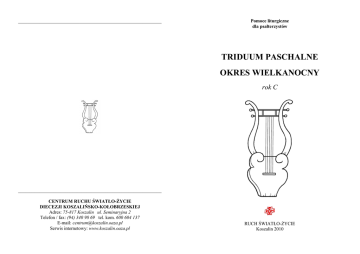 _____________________________________________________________ Pomoce liturgiczne dla psałterzystów TRIDUUM PASCHALNE OKRES WIELKANOCNY rok C _____________________________________________________________ CENTRUM RUCHU ŚWIATŁO-ŻYCIE DIECEZJI KOSZALIŃSKO-KOŁOBRZESKIEJ Adres: 75-817 Koszalin ul. Seminaryjna 2 Telefon / fax: (94) 340 98 69 tel. kom. 600 604 137 E-mail: [email protected] Serwis internetowy: www.koszalin.oaza.pl RUCH ŚWIATŁO-ŻYCIE Koszalin 2010 LEGENDA: podkreślenie – akcent(y) wyrazowe w melodii podkreślenie – sylaba rozłożona na dwie lub więcej nut fleksa - skłon melodii (†), podkreślenie medianta – oddech w połowie wersetu (*) finis – zakończenie wersetu (.) 2 23 NOTATKI WIELKI CZWARTEK, MSZA WIECZERZY PAŃSKIEJ PSALM 116B(115), 12-13.15-16bc.17-18 mel. oprac. ks. M. Miod. Czym się Panu odpłacę * za wszystko, co mi wyświadczył? Podniosę kielich zbawienia * i wezwę imienia Pana. Cenna jest w oczach Pana * śmierć Jego świętych. Jam sługa Twój, syn Twej służebnicy, * Ty rozerwałeś moje kajdany. Tobie złożę ofiarę pochwalną * i wezwę imienia Pana. Wypełnię me śluby dla Pana * przed całym Jego ludem, AKLAMACJA J 13, 34 autor mel. nieznany Daję wam przykazanie nowe, abyście się wzajemnie miłowali, Jak Ja was umiłowałem. 22 3 WIELKI PIĄTEK MĘKI PAŃSKIEJ PSALM 31(30), 2 i 6.12-13.15-16.17 i 25 NOTATKI mel. M. Machura Panie, do Ciebie się uciekam: niech nigdy nie doznam zawodu, * wybaw mnie w sprawiedliwości Twojej! W ręce Twoje powierzam ducha mego: * Ty mnie odkupisz, Panie, wierny Boże. Stałem się znakiem hańby dla wszystkich mych wrogów, * dla sąsiadów przedmiotem odrazy, postrachem dla moich znajomych; * ucieka, kto mnie ujrzy na drodze. Ja zaś pokładam ufność w Tobie, Panie, * i mówię: «Ty jesteś moim Bogiem». W Twoim ręku są moje losy, * wyrwij mnie z rąk wrogów i prześladowców. Niech Twoje oblicze zajaśnieje nad Twym sługą, * wybaw mnie w swoim miłosierdziu. Bądźcie dzielni i mężnego serca, * wszyscy, którzy ufacie Panu. AKLAMACJA Flp 2, 8-9 mel. ks. I. Pawlak Dla nas Chrystus stał się posłuszny aż do śmierci, * a była to śmierć krzyżowa. Dlatego Bóg wywyższył Go nad wszystko * i dał Mu imię, które jest ponad wszelkie imię. 4 21 NOTATKI WIGILIA PASCHALNA Psalm responsoryjny po I czytaniu (Rdz 1, 1 – 2, 2) PSALM 104(103), 1-2a.5-6 mel. ks. I. Pawlak Błogosław duszo moja, Pana, * o Boże mój, Panie, Ty jesteś bardzo wielki! Odziany w majestat i piękno, * światłem okryty jak płaszczem. Umocniłeś ziemię w jej podstawach, * nie zachwieje się na wieki wieków Jak szatą okryłeś ją Wielką Głębią * ponad górami stanęły wody. Ty zdroje kierujesz do strumieni, * co pośród gór się sączą. Nad nimi mieszka ptactwo niebieskie * i śpiewa wśród gałęzi. Z Twoich komnat nawadniasz góry, * owocem Twych dzieł syci się ziemia. Każesz rosnąć trawie dla bydła, * i roślinom, by człowiekowi służyły. Jak liczne są dzieła Twoje, Panie! * Tyś wszystko mądrze uczynił, ziemia jest pełna Twych stworzeń. * Błogosław, duszo moja, Pana. 20 5 WIGILIA PASCHALNA Psalm responsoryjny po I czytaniu (Rdz 1, 1 – 2, 2)* PSALM 33(32), 4-5.6-7.12-13.20 i 22 Słowo Pana jest prawe, * a każde Jego dzieło godne zaufania. On miłuje prawo i sprawiedliwość, * ziemia jest pełna Jego łaski. Przez słowo Pana powstały niebiosa, * wszystkie gwiazdy przez tchnienie ust Jego. On morskie wody gromadzi jak w bukłaku, * otchłanie oceanu w zbiornikach. Błogosławiony lud, którego Pan jest Bogiem, * naród, który On wybrał na dziedzictwo dla siebie. Pan spogląda z nieba, * widzi wszystkich ludzi. Dusza nasza oczekuje Pana, * On jest naszą pomocą i tarczą. Panie, niech nas ogarnie Twoja łaska * według nadziei, jaką pokładamy w Tobie. * Drugi Psalm do wyboru przy tym czytaniu. 6 mel. ks. I. Pawlak IV NIEDZIELA WIELKANOCNA, ROK C PSALM 100(99), 1-2.3.4b-5ab mel. ks. J. Ścibor CSsR Wykrzykujcie na cześć Pana wszystkie ziemie, * służcie Panu z weselem, Stawajcie przed obliczem Pana * z okrzykami radości. Wiedzcie, że Pan jest Bogiem, * On sam nas stworzył. Jesteśmy Jego własnością, * Jego ludem, owcami Jego pastwiska, W Jego bramy wstępujcie z dziękczynieniem, * z hymnami w Jego przedsionki. Albowiem Pan jest dobry, * Jego łaska trwa na wieki. AKLAMACJA J 10, 14 mel. greg. Ja jestem dobrym Pasterzem i znam owce moje, a moje Mnie znają. 19 III NIEDZIELA WIELKANOCNA, ROK C PSALM 30(29), 2 i 4.5-6a.11 i 12a i 13b WIGILIA PASCHALNA Psalm responsoryjny po II czytaniu (Rdz 22, 1-18) mel. J. Furmanik PSALM 16(15), 5 i 8.9-10.11 Ref. Strzeż mnie, o Boże, Tobie zaufałem. Sławię Cię, Panie, bo mnie wybawiłeś * i nie pozwoliłeś mym wrogom naśmiewać się ze mnie. Panie, mój Boże, z krainy umarłych wywołałeś moją duszę * i ocaliłeś mi życie spośród schodzących do grobu. Śpiewajcie psalm wszyscy miłujący Pana * i pamiętajcie o Jego świętości. Gniew Jego bowiem trwa tylko przez chwilę, * a Jego łaska przez całe życie. Dlatego cieszy się moje serce i dusza raduje, * a ciało moje będzie spoczywać bezpiecznie, bo w kraju zmarłych duszy mej nie zostawisz * i nie dopuścisz, bym pozostał w grobie. Ty ścieżkę życia mi ukażesz, * pełnię Twojej radości i wieczną rozkosz, * po Twojej prawicy. Wysłuchaj mnie, Panie, zmiłuj się nade mną * Panie, bądź moją pomocą. Zamieniłeś w taniec mój żałobny lament, * Boże mój i Panie, będę Cię sławił na wieki. AKLAMACJA Pan moim dziedzictwem i przeznaczeniem, * to On mój los zabezpiecza. Zawsze stawiam sobie Pana przed oczy, * On jest po mojej prawicy, nic mną nie zachwieje. mel. wg Graduale Simplex Zmartwychwstał Chrystus, który wszystko stworzył i zlitował się nad ludźmi. 18 7 WIGILIA PASCHALNA Psalm responsoryjny po III czytaniu (Wj 14, 15 – 15, 1) II NIEDZIELA WIELKANOCNA, ROK C PSALM 118(117), 1 i 4.13-14.22 i 24 mel. oprac. J. Kosko KAN