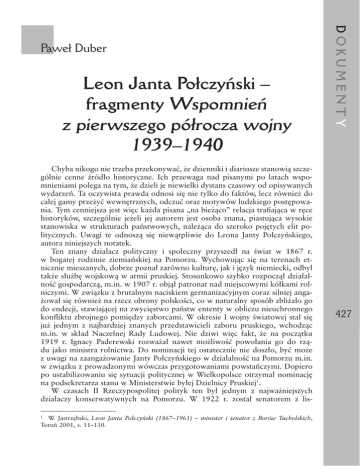 Paweł Duber Leon Janta Połczyƒski – fragmenty Wspomnieƒ z pierwszego półrocza wojny 1939–1940 Chyba nikogo nie trzeba przekonywać, że dzienniki i diariusze stanowią szczególnie cenne źródło historyczne. Ich przewaga nad pisanymi po latach wspomnieniami polega na tym, że dzieli je niewielki dystans czasowy od opisywanych wydarzeń. Ta oczywista prawda odnosi się nie tylko do faktów, lecz również do całej gamy przeżyć wewnętrznych, odczuć oraz motywów ludzkiego postępowania. Tym cenniejsza jest więc każda pisana „na bieżąco” relacja trafiająca w ręce historyków, szczególnie jeżeli jej autorem jest osoba znana, piastująca wysokie stanowiska w strukturach państwowych, należąca do szeroko pojętych elit politycznych. Uwagi te odnoszą się niewątpliwie do Leona Janty Połczyńskiego, autora niniejszych notatek. Ten znany działacz polityczny i społeczny przyszedł na świat w 1867 r. w bogatej rodzinie ziemiańskiej na Pomorzu. Wychowując się na terenach etnicznie mieszanych, dobrze poznał zarówno kulturę, jak i język niemiecki, odbył także służbę wojskową w armii pruskiej. Stosunkowo szybko rozpoczął działalność gospodarczą, m.in. w 1907 r. objął patronat nad miejscowymi kółkami rolniczymi. W związku z brutalnym naciskiem germanizacyjnym coraz silniej angażował się również na rzecz obrony polskości, co w naturalny sposób zbliżało go do endecji, stawiającej na zwycięstwo państw ententy w obliczu nieuchronnego konfliktu zbrojnego pomiędzy zaborcami. W okresie I wojny światowej stał się już jednym z najbardziej znanych przedstawicieli zaboru pruskiego, wchodząc m.in. w skład Naczelnej Rady Ludowej. Nie dziwi więc fakt, że na początku 1919 r. Ignacy Paderewski rozważał nawet możliwość powołania go do rządu jako ministra rolnictwa. Do nominacji tej ostatecznie nie doszło, być może z uwagi na zaangażowanie Janty Połczyńskiego w działalność na Pomorzu m.in. w związku z prowadzonymi wówczas przygotowaniami powstańczymi. Dopiero po ustabilizowaniu się sytuacji politycznej w Wielkopolsce otrzymał nominację na podsekretarza stanu w Ministerstwie byłej Dzielnicy Pruskiej1. W czasach II Rzeczypospolitej polityk ten był jednym z najważniejszych działaczy konserwatywnych na Pomorzu. W 1922 r. został senatorem z lis1 W. Jastrzębski, Leon Janta Połczyński (1867–1961) – minister i senator z Borów Tucholskich, Toruń 2001, s. 11–110. DOKUMENTY Obraz podziemnej „Solidarności” w propagandzie stanu wojennego 427 Paweł Duber 428 ty Chrześcijańskiego Związku Jedności Narodowej, zachowując swój mandat do końca kadencji izby. Objęcie władzy w państwie przez Józefa Piłsudskiego w maju 1926 r. nie pozostało jednak bez wpływu na jego poglądy polityczne, ponieważ podobnie jak duża część polskich konserwatystów zaczął szukać porozumienia z władzami sanacyjnymi. Podczas kampanii przed wyborami parlamentarnymi w 1928 r. udzielił poparcia prorządowej Katolickiej Unii Ziem Zachodnich, a jego nazwisko znalazło się na liście kandydatów do senatu. Tym razem nie udało mu się uzyskać mandatu, cieszył się jednak uznaniem prominentnych piłsudczyków, w związku z czym dwa lata później otrzymał nominację na ministra rolnictwa w piątym gabinecie Kazimierza Bartla. Co więcej, jesienią 1930 r. po raz kolejny wziął udział w wyborach parlamentarnych, tym razem zdobywając mandat senatorski z ramienia Bezpartyjnego Bloku Współpracy z Rządem. Natomiast w 1933 r., już po swoim odejściu z rządu, został jednym z wiceprezesów Zjednoczenia Zachowawczych Organizacji Politycznych. Jednak znaczenie środowisk zachowawczych w obozie rządzącym, mocno nadszarpnięte w latach trzydziestych, uległo dalszej marginalizacji po śmierci Piłsudskiego, co nie pozostało oczywiście bez wpływu na działalność polityczną Janty Połczyńskiego, który wycofywał się stopniowo z czynnego życia publicznego. We wrześniu 1939 r. był on już praktycznie politycznym emerytem, tym bardziej że miał przecież 72 lata2. Publikowane wspomnienia, nieznane dotychczas historykom, nie zostały wykorzystane nawet w biografii ich Autora, w której okres wojenny został opracowany niezwykle pobieżnie3. Jest to w rzeczywistości dziennik, sporządzony w formie maszynopisu i przechowywany do niedawna w prywatnych zbiorach dr Teresy Tyszkiewicz z Poznania, wnuczki Leona Janty Połczyńskiego (obecnie materiały te wraz z innymi dokumentami wchodzącymi w skład rodzinnego archiwum zostały przekazane do Biblioteki Kórnickiej). Są to zapiski szczególne, pisane z pozycji człowieka przyzwyczajonego do aktywnego trybu życia, obecnie skazanego jednak na rolę biernego obserwatora tragicznych wypadków pierwszych miesięcy wojny. W chwili jej wybuchu przebywał wraz z żoną w Milanówku, skąd oboje nie mogli już powrócić na Pomorze. Surowe warunki okupacji wkrótce zmusiły ich do przeniesienia się do willi, należącej do spokrewnionych z Autorem Marii i Jana Mohlów. Odcięty od domu, pełen obaw o los najbliższej rodziny (jego najstarszy syn Maciej, skierowany na ciężkie roboty w głębi Rzeszy, zmarł 6 maja 1940 r.4), patrzący na katastrofę państwa, którego budowie poświęcił dużą część swojego życia, postanowił przelać swoje myśli na papier. Jego ówczesny stan psychiczny, prawdopodobnie bliski załamania, nie pozostał z pewnością bez wpływu na formę publikowanych notatek, zawierających stosunkowo dużą ilość błędów literowych i stylistycznych. Powstał jednak dokument szczególny, w którym obok poruszających opisów ówczesnej rzeczywistości znalazły się także interesujące komentarze dotyczące jego wieloletniej działalności politycznej, m.in. w formie ciekawych uwag na temat przyczyn, dla których po 1926 r. zdecydował się udzielić poparcia Józefowi Piłsudskiemu. Ibidem, s. 111–184. Ibidem, s. 185–188. 4 Ibidem, s. 186