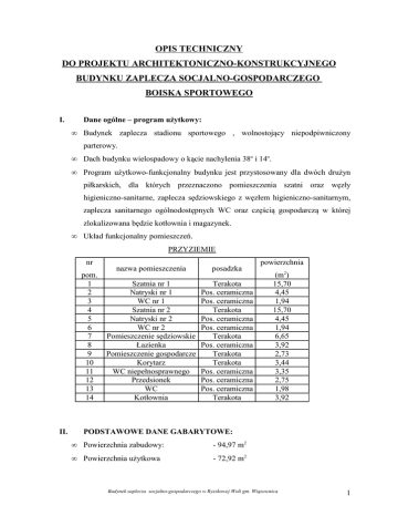 OPIS TECHNICZNY DO PROJEKTU ARCHITEKTONICZNO-KONSTRUKCYJNEGO BUDYNKU ZAPLECZA SOCJALNO-GOSPODARCZEGO BOISKA SPORTOWEGO I. Dane ogólne – program użytkowy: • Budynek zaplecza stadionu sportowego , wolnostojący niepodpiwniczony parterowy. • Dach budynku wielospadowy o kącie nachylenia 38o i 14o. • Program użytkowo-funkcjonalny budynku jest przystosowany dla dwóch drużyn piłkarskich, dla których przeznaczono pomieszczenia szatni oraz węzły higieniczno-sanitarne, zaplecza sędziowskiego z węzłem higieniczno-sanitarnym, zaplecza sanitarnego ogólnodostępnych WC oraz częścią gospodarczą w której zlokalizowana będzie kotłownia i magazynek. • Układ funkcjonalny pomieszczeń. PRZYZIEMIE nr pom. 1 2 3 4 5 6 7 8 9 10 11 12 13 14 II. nazwa pomieszczenia posadzka Szatnia nr 1 Natryski nr 1 WC nr 1 Szatnia nr 2 Natryski nr 2 WC nr 2 Pomieszczenie sędziowskie Łazienka Pomieszczenie gospodarcze Korytarz WC niepełnosprawnego Przedsionek WC Kotłownia Terakota Pos. ceramiczna Pos. ceramiczna Terakota Pos. ceramiczna Pos. ceramiczna Terakota Pos. ceramiczna Terakota Terakota Pos. ceramiczna Pos. ceramiczna Pos. ceramiczna Terakota powierzchnia (m2) 15,70 4,45 1,94 15,70 4,45 1,94 6,65 3,92 2,73 3,44 3,35 2,75 1,98 3,92 PODSTAWOWE DANE GABARYTOWE: • Powierzchnia zabudowy: - 94,97 m2 • Powierzchnia użytkowa - 72,92 m2 Budynek zaplecza socjalno-gospodarczego w Ryszkowej Woli gm. Wiązownica 1 • Kubatura - 422,10 m3 • Wysokość budynku - 5,96 m • Szerokość elewacji frontowej - 8,15 m • Długość - 13,95 m • Poziom zerowy budynku +/-0,00 = 190,40 m n.p.m. III. WARUNKI LOKALIZACYJNE: • Poziom zwierciadła wody gruntowej znajduje się poniżej poziomu posadowienia fundamentów tj. min. 1,50 m poniżej poziomu podłogi przyziemia. • Głębokość przemarzania gruntu hz = 1,0 m • Do obliczeń fundamentów przyjęto parametry geotechniczne dla średnio spoistych glin piaszczystych w stanie plastycznym. • IV. Obciążenie śniegiem – strefa III, obciążenie wiatrem – strefa I DANE KONSTRUCKYJNO - MATERIAŁOWE: 1) KONSTRUKCJA – murowana o stropach z belek drewnianych w układzie poprzecznym. 2) FUNDAMENTY - Ławy fundamentowe – wylewane na mokro żelbetowe z betonu żwirowego klasy C16/20 (B20), wysokość 30 cm, szerokość 50 cm i 40 cm ławy zewnętrzne , - Pod ławami i stopą - chudy beton gr. 10 cm. - Ściany fundamentowe – murowanie z bloczków betonowych gr. 25 cm. 3) ŚCIANY ZEWNĘTRZNE - Przyziemie : bloczki z betonu komórkowego „SIPOREX” odmiany 500 gr. 25 cm ocieplone styropianem EPS 70 gr. 10 cm tynk cienkowarstwowy. 4) ŚCIANY WEWNĘTRZNE - Przyziemie: bloczki z betonu komórkowego „SIPOREX” odmiany 500 gr. 25 cm i 12 cm, ścianki gr. 6 cm wykonane z cegły pełnej zwykłej klasy 150. Budynek zaplecza socjalno-gospodarczego w Ryszkowej Woli gm. Wiązownica 2 5) KOMINY - Przewody wentylacyjne 14x14 cm i 20x14 cm z cegły pełnej, przewody spalinowe 20x14 cm z cegły pełnej zwykłej klasy 150. Dostęp do kominów stopnie i ławy kominiarskie. 6) STROP Nad przyziemiem strop drewniany z belek 20x20 cm obudowany deskami gr. 2 cm i wypełniony wełną mineralną gr. 20 cm. Jako wykończenie stropu projektuje się wykonanie stropu podwieszonego z płyt gipsowo-kartonowymi na ruszcie metalowym. 7) NADPROŻA – żelbetowe monolityczne wylewane na mokro, nad typowymi drzwiami o szer. 1,00 nadproża Kleina – ceglane o zbrojonych spoinach. 8) DACH - wielospadowy o kącie nachylenia 38o i 14o - dach o konstrukcji drewnianej wiązara jętkowego opartego na drewnianych murłatach, konstrukcja dachu zabezpieczona środkami grzybo i ognioodpornymi - pokrycie dachu blacha blachodachówka powlekana w kolorze brązu, - rynny i rury spustowe z PCV w kolorze brązu, - obróbki blacharskie z blachy powlekanej. 9) IZOLACJE Przeciwwilgociowa: - pozioma ścian fundamentowych i podłóg 2x papa termozgrzewalna - pionowa ścian fundamentowych i obustronnie abizol R+P . Termiczna: - strop nad przyziemiem : wełna mineralna gr. 20 cm, - ocieplenie ścian zewnętrznych: styropian EPS 70 -040 – gr. 10 cm - ocieplenie ścian fundamentowych polistyren ekstradowany XPS „styrodur” gr. 5 cm - ocieplenie posadzki przyziemia polistyren ekstradowany XPS „styrodur” gr. 10 cm Folia paroprzepuszczalna:- nad krokwiami w dachu folia o wysokiej przepuszczalności. Paroszczelna: - folia polietylenowa w stropie nad przyziemiem. V. WYKOŃCZENIE WEWNĘTRZNE: - posadzki: wg zestawienia na rysunkach Budynek zaplecza socjalno-gospodarczego w Ryszkowej Woli gm. Wiązownica 3 - tynki i okładziny: ściany pomieszczeń płytki ceramiczne , sufity gładzie gipsowe. - malowanie farbami emulsyjnymi, VI. WYKOŃCZENIE ZEWNĘTRZNE - tynki zewnętrzne cienkowarstwowe mineralne wykonane na dociepleniu styropianem gr. 10 cm, - malowanie elewacji w pasy poziome farbami silikonowymi w kolorach odcieni piaskowych , stolarka fabrycznie malowana , elementy stalowe zabezpieczyć farbami antykorozyjnymi. - odbojówka z kostki betonowej na podsypce cementowo-piaskowej, VII. STOLARKA Stolarka okienna typowa z PCV lub drewna, Stolarka drzwiowa zewnętrzna z PCW , wewnętrzna typowa z drewna . VIII. WENTYLACJA W budynku zastosowano wentylację grawitacyjną nawiewno-wywiewną. Drzwi pomieszczeń sanitarnych oraz zaplecza wyposażyć w nawiewniki dolne. Wszystkie okna wyposażyć w nawiewniki higrosterowane. IX. OCHRONA PRZECIWPOŻAROWA. Wykończenie wewnętrzne dachu płytami gipsowo-kartonowymi. Okładziny zewnętrzne elewacyjne z płyt styropianu samogasnącego EPS 70-040 Dach budynku zabezpieczony instalacją odgromową. X. INSTALACJE W budynku projektuje się: - wewnętrzna instalację wodociągową, - wewnętrzna instalację kanalizacyjną, - wewnętrzna instalację CO i CWU, - - wewnętrzna instalację elektryczną Kotłownia węglowa w wydzielonym pomieszczeniu przyziemia wyposażonym w wentylację grawitacyjną oraz przewody kominowe spalinowe 20x14 cm. Budynek zaplecza socjaln
