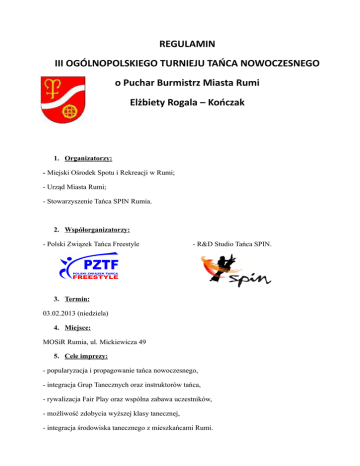 REGULAMIN III OGÓLNOPOLSKIEGO TURNIEJU TAŃCA NOWOCZESNEGO o Puchar Burmistrz Miasta Rumi Elżbiety Rogala – Kończak 1. Organizatorzy: - Miejski Ośrodek Spotu i Rekreacji w Rumi; - Urząd Miasta Rumi; - Stowarzyszenie Tańca SPIN Rumia. 2. Współorganizatorzy: - Polski Związek Tańca Freestyle - R&D Studio Tańca SPIN. 3. Termin: 03.02.2013 (niedziela) 4. Miejsce: MOSiR Rumia, ul. Mickiewicza 49 5. Cele imprezy: - popularyzacja i propagowanie tańca nowoczesnego, - integracja Grup Tanecznych oraz instruktorów tańca, - rywalizacja Fair Play oraz wspólna zabawa uczestników, - możliwość zdobycia wyższej klasy tanecznej, - integracja środowiska tanecznego z mieszkańcami Rumi. 6. Kategorie: DYSCYPLINA DISCO DANCE KONKURENCJA KATEGORIA WIEKOWA Solo debiuty, kl. E, kl. D, kl. C kl. S+A+B open Duety debiuty, poziom D+E; B+C; S+A Małe grupy II Liga, I Liga, Ekstraklasa HIP HOP Solo debiuty, kl. E, kl. D, kl. C kl. S+A+B open Duety debiuty, poziom D+E; B+C; S+A Małe grupy II Liga, I Liga, Ekstraklasa BALLET /POINT JAZZ DANCE Solo Debiuty Solo debiuty, kl. E, kl. D open MODERN Solo debiuty, kl. E, kl. D open ZESPOŁY TANECZNE Zespoły (od 3 osób) II Liga, I Liga, Ekstraklasa • • • 11 lat i młodsi* 7 lat i młodsi 8-9 lat 10-11 lat 12-15 lat* 12-13 lat 14-15 lat 16 lat i starsi* 16-19 lat 20 lat i starsi zgodnie z uchwałą Zarządu PZTF z dnia 19.12.2012 r. kategorie wiekowe mogą zostać połączone w przypadku, gdy nie ma pełnych finałów w poszczególnych przedziałach wiekowych Ligi zespołów: - II liga – zespoły początkujące, zespoły szkolne - I liga – zespoły średniozaawansowane (uczestnicy ogólnopolskich festiwali i turniejów) - Ekstraliga – zespoły zaawansowane (uczestnicy MŚ, ME, KM IDO, finaliści dużych festiwali) Duety – o starcie na danym poziomie decyduje wyższa klasa z posiadanych przez tancerzy (np. tancerze posiadają klasy S i D – tańczą na poziomie S; tancerze posiadają klasy B i A – tańczą na poziomie A; tancerze posiadają klasę D i B – tańczą na poziomie B). 7. Czas prezentacji: - solo, duety / Disco Dance, Hip Hop - 1.00 min. (muzyka organizatora) - solo / Jazz Dance / Ballet_Point/ Modern - do 1.00 min. (muzyka obowiązkowa) - małe grupy Disco Dance; Hip Hop - 2.00 min. (muzyka organizatora) - małe grupy Disco Dance (11 lat i młodsi) - 1.30 min. (muzyka organizatora) - Zespoły Taneczne – do 4 min. (muzyka własna) 8. Warunki uczestnictwa: - przesłanie Karty Zgłoszenia (w załączniku) w terminie do 25.01.2013 r. na adres e-mail: [email protected] kopia zgłoszenia na adres [email protected] i [email protected] - uiszczenie opłaty startowej w wysokości: Solo 40 zł dla członków PZTF, PFT 20 zł Duet 80 zł dla członków PZTF, PFT 40 zł Mała grupa / os. 40 zł dla członków PZTF, PFT 20 zł Zespoły Taneczne / os. 40 zł dla członków PZTF, PFT karty PZTF 20 zł UWAGA!! Dla członków PZTF – opłata za drugą i dalsze konkurencje – 50% zniżki - opłatę startową należy przesłać na konto: STOWARZYSZENIE TAŃCA SPIN RUMIA Mickiewicza 49, Rumia 84-230 Bank Rumia Spółdzielczy 31 8351 0003 0035 4901 2000 0010 z dopiskiem „TURNIEJ TAŃCA wraz z adnotacją (klub i jakie konkurencje) – opłata”. - potwierdzenie swojego udziału w dniu imprezy zgodnie z Programem Ramowym, - podporządkowanie się zaleceniom organizacyjnym, przepisom BHP i PPOŻ, - podporządkowanie się przepisom szczegółowym turnieju, - tańczenie w obuwiu sportowym, które nie niszczy parkietu, - UWAGA! 28.01.2013 r. stanowi ostateczną datę wniesienia opłaty startowej. Po tym terminie organizator zastrzega sobie prawo nie przyjęcia zgłoszenia. W przypadku przyjęcia zgłoszenia po terminie – odpłatność za udział wzrasta dwukrotnie, - uczestnik ma prawo wycofać się z udziału w turnieju na każdym etapie. W takim przypadku, jak również w przypadku niezakwalifikowania się do dalszych rund, opłata startowa nie podlega zwrotowi, - turniej został zatwierdzony przez Zarząd PZTF i zostanie rozegrany zgodnie z Regulaminem. 9. Komisja sędziowska: - skład Komisji Sędziowskiej minimum 5 licencjonowanych sędziów PZTF - przy obliczaniu wyników finału stosowany jest Skating System // w kategorii Debiuty – ocena szkolna // w kategorii małe Grupy i Zespoły Taneczne II i I Liga – ocena na miejsca 1,2,3 / Ekstraliga – finał - Skating System. 10. Nagrody: - debiuty (solo, duety) - w klasach / poziomy duety - nagrody finansowe* S+A+B poziom duetów S - dyplomy - medale miejsca I, II i III i dyplomy dla finalistów - 1 m.- 120 zł, 2 m.- 80 zł, 3 m.-60 zł, pozostałe miejsca finałowe - 40 zł - 1 m.- 120 zł, 2 m.- 80 zł, 3 m.-60 zł, pozostałe miejsca finałowe - 40 zł - małe grupy II i I liga - Ekstraliga nagrody finansowe Ekstraliga* - puchar i dyplom - dla wszystkich zespołów - puchary I, II, II i dyplomy dla wszystkich uczestników - 1 m.- 200 zł, 2 m.- 150 zł, 3 m.- 100 zł - zespoły taneczne II i I liga - puchar i dyplom - dla wszystkich zespołów - Ekstraliga - puchary I, II, II i dyplomy dla wszystkich uczestników nagrody finansowe Ekstraliga* - 1 m.- 500 zł, 2 m.- 300 zł, 3 m.- 200 zł * Nagrody finansowe zostają ufundowane przez Polski Związek Tańca Freestyle. 11. Postanowienia końcowe: - protesty jedynie w formie pisemnej należy składać do Sędziego Głównego najpóźniej 15 min. po ogłoszeniu wyników, - protest rozpatrywany jest przez Sędziego Głównego, Przewodniczącego Komisji Skrutacyjnej, Kierownika Organizacyjnego, po wpłaceniu kaucji w wys. 200 zł. W przypadku nieuznania protestu kaucja nie podlega zwrotowi i zostaje wpłacona na konto PZTF. 12. Informacje dodatkowe: - w debiutach oraz w klasach E / D obowiązują stroje i fryzury bez ozdób (bez cekinów, kamieni, piór, itp.). Nie należy również stosować makijaży. - na prowadzenie reklamy (w każdej postaci) należy uzyskać pisemną zgodę organizatora. - wymiary parkietu – 12 m x 14 m - dokonani