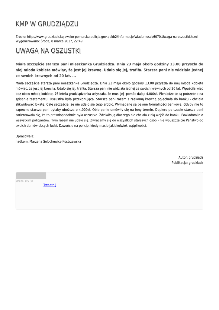 KMP W GRUDZIĄDZU Źródło: http://www.grudziadz.kujawsko-pomorska.policja.gov.pl/kb2/informacje/wiadomosci/6070,Uwaga-na-oszustki.html Wygenerowano: Środa, 8 marca 2017, 22:49 UWAGA NA OSZUSTKI Miała szczęście starsza pani mieszkanka Grudziądza. Dnia 23 maja około godziny 13.00 przyszła do niej młoda kobieta mówiąc, że jest jej krewną. Udało się jej, trafiła. Starsza pani nie widziała jednej ze swoich krewnych od 20 lat. ... Miała szczęście starsza pani mieszkanka Grudziądza. Dnia 23 maja około godziny 13.00 przyszła do niej młoda kobieta mówiąc, że jest jej krewną. Udało się jej, trafiła. Starsza pani nie widziała jednej ze swoich krewnych od 20 lat. Wpuściła więc bez obaw młodą kobietę. 76 letnia grudziądzanka usłyszała, że musi jej pomóc dając 4.000zł. Pieniądze te są potrzebne na spisanie testamentu. Oszustka była przekonująca. Starsza pani razem z rzekomą krewną pojechała do banku - chciała zlikwidować lokatę. Całe szczęście, że nie udało się tego zrobić. Wymagane są pewne formalności bankowe. Gdyby nie to zapewne starsza pani byłaby uboższa o 4.000zł. Obie panie umówiły się na inny termin. Dopiero po czasie starsza pani zorientowała się, że to prawdopodobnie była oszustka. Zdziwiło ją dlaczego nie chciała z nią wejść do banku. Powiadomiła o wszystkim policjantów. Tym razem nie udało się. Zwracamy się do wszystkich starszych osób - nie wpuszczajcie Państwo do swoich domów obcych ludzi. Dzwońcie na policję, kiedy macie jakiekolwiek wątpliwości. Opracowała: nadkom. Marzena Solochewicz-Kostrzewska Autor: grudziadz Publikacja: grudziadz Ocena: 0/5 (0) Tweetnij