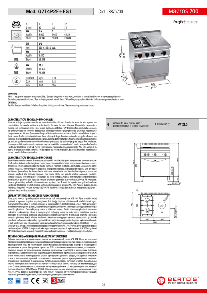 Mod. G7T4P2F+FG1 1 110 7 6.020 23.884 TOT. GN mm kW kcal/h Btu/h 1/1 530 x 325 x 3 pos. 4 3.440 13.648 TOT. kW kcal/h Btu/h 21,5 18.490 73.358 G30/G31 G20 G25 kg/h m3/h m3/h TP 70 7 6.020 23.884 900 35 3⁄8” 1 80 3,5 3.010 11.942 700 ” 27 ½ n. Ø mm kW kcal/h Btu/h macros 700 Cod. 18875200 1,70 2,28 2,65 800 31 ½” STANDARD 7B/2 recipiente fuegos de acero inoxidable / bandeja de aço inox / misa inox z palnikami / контейнер для огня из нержавеющей стали Encendido piezoeléctrico horno / Sem activação piezoeléctrica do forno / Piezoelektryczny zapłon piekarnika / Пьезоэлектрический поджиг печи OPTIONAL Parrillas de acero inoxidable / Grelhas de aço inox / Ruszty ze stali inox / Решетки из нержавеющей стали CARACTERÍSTICAS TÉCNICAS y FUNCIONALES Plano de trabajo y paneles frontales de acero inoxidable AISI 304. Plancha de acero de alto espesor con características de elevada resistencia y distribución del calor de zonas térmicas diferenciadas. temperatura máxima en el centro y decreciente en los bordes. Quemador central de 7 kW de combustión optimizada, accionado por grifo valvulado con termopar de seguridad e indicador luminoso piloto protegido. Encendido piezoeléctrico con protección en silicona. Quemadores fuegos abiertos enteramente en hierro fundido niquelado de simple y doble corona de alta potencia dotados de llama piloto y de larga duración, accionados por grifo valvulado con termopar de seguridad e indicador luminoso piloto. Parrillas de hierro fundido. Máxima limpieza y mantenimiento garantizado por la completa extracción del cuerpo quemador y de las bandejas para fuegos. Pies regulables. Horno a gas estático, enteramente construido en acero inoxidable, con soportes de 3 niveles para parrillas/fuentes EuroNorm 400x600mm y 1/1 GN. Puerta y contrapuerta estampadas de acero inoxidable AISI 304. Manija de la puerta de alta resistencia de acero AISI 304 de espesor 20/10. Pies regulables. Estándar: Encendido piezoeléctrico horno. 1 parrilla de horno antivuelco. conexión del gas / conexão a gás / podłączenie gazowe / газовое соединение kW 21,5 R 1/2 UNI ISO 7/1 140 G 140 100 (½” G) 1040 900 Superfície de trabalho e painéis dianteiros de aço inox AISI 304. Placa de aço de alta espessura, com características de elevada resistência e distribuição do calor a zonas térmicas diferenciadas: temperatura máxima no centro e decrescente em direcção das bordas. Queimador central de 7 kW com combustão optimizada, accionado mediante torneira valvulada, com termopar de segurança e luz piloto protegida. Activação piezoeléctrica com protecção de silicone. Queimadores das bocas abertas realizados inteiramente com ferro fundido niquelado, com coroa simples e dupla de alta potência, equipados com chama piloto, com garantia vitalícia, accionados mediante torneira valvulada com termopar de segurança e luz piloto protegida. Grelhas de ferro fundido. Máxima limpeza e manutenção garantida pois é possível remover o corpo do queimador e as bandejas das bocas. Pés reguláveis. Forno a gás estático, realizado inteiramente com aço inox, com 3 níveis de suporte para grelhas/assadeiras EuroNorm 400x600mm e 1/1GN. Porta e contra-porta moldadas de aço inox AISI 304. Puxador da porta de alta resistência de aço AISI 304 com espessura 20/10. Pés reguláveis. Padrão: Sem activação piezoeléctrica do forno. 1 grelha do forno anti-basculamento. 900 CARACTERÍSTICAS TÉCNICAS e FUNCIONAIS 65 26 (½” G) 01 7 KW 580 700 7 KW 3,5 KW TP 367 430 800 ТЕХНИЧЕСКИЕ и ФУНКЦИОНАЛЬНЫЕ ХАРАКТЕРИСТИКИ Рабочая поверхность и фронтальные панели из нержавеющей стали AISI 304. Плита со сплошной поверхностью из стали большой толщины, обладающая повышенной прочностью и дифференцированным распределением тепла по термическим зонам: максимальная температура в центре и убывающая по направлению к краям. Центральная горелка на 7 КВт с оптимизированным сгоранием, включаемая с помощью крана с предохранительным клапаном, оснащенным термопарой, с защищенным пилотным индикатором. Пьезоэлектрический поджиг с защитой из силикона. Горелки высокой мощности с открытым огнем полностью из никелированной стали с одинарным и двойным ободом, оснащенные пилотным огнем, с пожизненной гарантией, включаемые с помощью крана с предохранительным клапаном, оснащенным термопарой, с защищенным пилотным индикатором. Чугунные решетки. Максимальная чистота в обслуживании гарантирована полной съемностью как корпуса горелки, так и контейнеров для огня. Статическая газовая плита, полностью из нержавеющей стали, с 3 направляющими для решеток/ противней EuroNorm 400x600мм и 1/1 GN. Штампованные дверь и контрдверь из нержавеющей стали AISI 304. Ручка двери из высокопрочной стали AISI 304 толщиной 20/10. Регулируемые ножки. Стандарт: пьезоэлектрический поджиг печи, 1 противоо