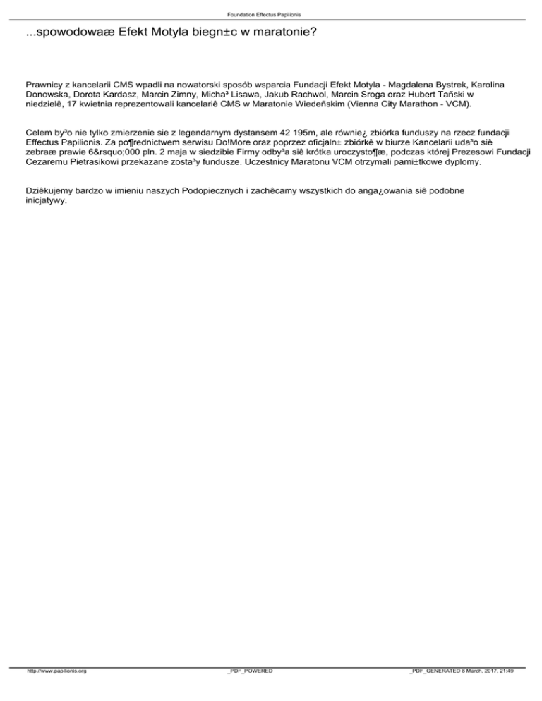 Foundation Effectus Papilionis ...spowodowaæ Efekt Motyla biegn±c w maratonie? Prawnicy z kancelarii CMS wpadli na nowatorski sposób wsparcia Fundacji Efekt Motyla - Magdalena Bystrek, Karolina Donowska, Dorota Kardasz, Marcin Zimny, Micha³ Lisawa, Jakub Rachwol, Marcin Sroga oraz Hubert Tañski w niedzielê, 17 kwietnia reprezentowali kancelariê CMS w Maratonie Wiedeñskim (Vienna City Marathon - VCM). Celem by³o nie tylko zmierzenie sie z legendarnym dystansem 42 195m, ale równie¿ zbiórka funduszy na rzecz fundacji Effectus Papilionis. Za po¶rednictwem serwisu Do!More oraz poprzez oficjaln± zbiórkê w biurze Kancelarii uda³o siê zebraæ prawie 6’000 pln. 2 maja w siedzibie Firmy odby³a siê krótka uroczysto¶æ, podczas której Prezesowi Fundacji Cezaremu Pietrasikowi przekazane zosta³y fundusze. Uczestnicy Maratonu VCM otrzymali pami±tkowe dyplomy. Dziêkujemy bardzo w imieniu naszych Podopiecznych i zachêcamy wszystkich do anga¿owania siê podobne inicjatywy. http://www.papilionis.org _PDF_POWERED _PDF_GENERATED 8 March, 2017, 21:49