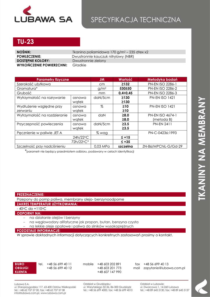 TU-23 NOŚNIK: POWLECZENIE: DOSTĘPNE KOLORY: WYKOŃCZENIE POWIERZCHNI: Tkanina poliamidowa 170 g/m2 – 235 dtex x2 Dwustronnie kauczuk nitrylowy (NBR) Dwustronnie zielony Gładkie Parametry fizyczne Szerokość użytkowa Gramatura* Grubość Wytrzymałość na rozrywanie osnowa wątek osnowa wątek osnowa wątek osnowa wątek Wydłużenie względne przy zerwaniu Wytrzymałość na rozdzieranie Przyczepność powleczenia Pęcznienie w paliwie JET A JM cm g/m2 mm daN/5cm % daN daN/5cm Wartość ≥132 530±50 0,4÷0,45 ≥130 ≥130 ≥10 ≥10 ≥8.0 ≥8.0 ≥3.5 ≥3.5 Metodyka badań PN-EN ISO 2286-1 PN-EN ISO 2286-2 PN-EN ISO 2286-3 PN-EN ISO 1421 PN-EN ISO 1421 PN-EN ISO 4674-1 (metoda B) PN-EN 2411 % wag 24h/22oC 72h/22oC* Szczelność przy nadciśnieniu 0,03 MPa PN-C-04236:1993 ≤ +15 ≤ +35 szczelna ZN-86/MPChiL-G/Gd-29 *parametr nie będący przedmiotem odbioru, podawany w celach identyfikacji PRZEZNACZENIE: Przepony do pomp paliwa, membrany olejo- benzynoodporne ZAKRES TEMPERATUR UŻYTKOWANIA: - 40oC do +110oC ODPORNY NA: − na działanie olejów i benzyny − na węglowodory alifatyczne jak propan, butan, benzyna czysta − na lekkie oleje opałowe i paliwa do silników wysokoprężnych POZOSTAŁE INFORMACJE: W sprawie dokładnych informacji dotyczących konkretnych zastosowań prosimy o kontakt. BIURO OBSŁUGI KLIENTA tel. +48 56 699 40 11 +48 56 699 40 12 mobile +48 603 202 891 +48 603 201 773 +48 607 147 990 fax mail +48 56 699 40 13 [email protected]
