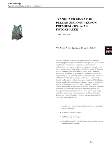 www.abfoto.pl Aparaty fotograficzne cyfrowe i kompaktowe VANGUARD KINRAY 48 PLECAK ZIELONY +KUPON PREMIUM -50% na AB FOTOKSIĄŻKĘ Cena: 849.00 zł VANGUARD Kinray 48 ZIELONY Plecak Kinray 48, powstały by odpowiedzieć na potrzeby podróżujących fotografów i obserwatorów ptaków, jest w pełni regulowany. Przestrzenne wnętrze z wyjmowanymi podziałkami pozwala na bezpieczny transport lornetek, lunet lub cyfrowych lustrzanek, także z teleobiektywem. Wykonany z wytrzymałego materiału, ochroni cenny sprzęt podczas zmiennych warunków pogodowych. Dodatkowo, plecak jest wyposażony w wyjmowaną osłonę przed deszczem. Zapewnia szybki i łatwy dostęp do sprzętu oraz wygodę użytkowania dzięki regulowanym paskom i zapięciu na piersi. Oddychająca tkanina na plecach pozwala na swobodny przepływ powietrza. Kinray może służyć za plecak i torbę, wystarczy jedynie usunąć przegródki. Wyposażony w uchwyt na statyw, zapinane na zamek kieszenie i przedni pasek z karabińczykiem do zaczepienia mniejszych akcesoriów. Dwa niższe pasy mogą służyć do zaczepienia większych przedmiotów, takich jak śpiwór czy kurtka. Mniejsze elementy można doczepiać do bocznych zaczepów plecaka. 2 torby w 1 - łatwo i szybko konwertuje się z plecaka w plecak codzienny System trzymania statywu Szybki dostęp do sprzętu Zaprojektowany by mieścić aparat wraz z dołączonym teleobiektywem i lunetę 1/1 Powered by TCPDF (www.tcpdf.org)