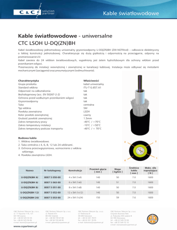 Kable światłowodowe Kable światłowodowe - uniwersalne CTC LSOH U-DQ(ZN)BH Kabel światłowodowy jednomodowy uniwersalny gryzonioodporny U-DQ(ZN)BH (ZW-NOTKtcd) – całkowicie dielektryczny o lekkiej konstrukcji jednotubowej. Charakteryzuje się dużą giętkością i odpornością na przeciąganie, odporny na promieniowanie UV. Kabel zawiera do 24 włókien światłowodowych, wypełniony jest żelem hydrofobowym dla ochrony włókien przed przenikaniem wilgoci. Przeznaczony do instalacji wewnętrznej i zewnętrznej w kanalizacji kablowej. Instalacja może odbywać się metodami mechanicznymi (zaciąganie) oraz pneumatycznymi (wdmuchiwanie). Charakterystyka Grupa produktu Standard włókna Odporność na odkształcenia Bezhalogenowy (acc. EN 50267-2-2) Ochrona przed wzdłużnym przenikaniem wilgoci Gryzonioodporny Tuba Typ włókna Powłoka zewnętrzna Kolor powłoki zewnętrznej Grubość powłoki zewnętrznej Zakres temperatury pracy Zakres temperatury instalacji Zakres temperatury podczas transportu Właściwości kabel uniwersalny ITU-T G.657.A1 tak tak tak tak centralna SM LSOH czarny 1.5mm -40°C / +70°C -10°C / +50°C -40°C / + 70°C Budowa kabla 1. Włókno światłowodowe. 2. Tuba centralna z 4, 6, 8, 12 lub 24 włóknami. 3. Ochrona przeciwgryzoniowa, wzmocnienie z włókna szklanego. 4. Powłoka zewnętrzna LSOH. Nazwa Nr katalogowy Konstrukcja Promień gięcia [ mm ] Waga [ kg/km ] Średnica kabla [ mm ] Maks. siła naprężająca [N] U-DQ(ZN)BH 4J 8007 5 050-00 4 x SM (1x4) 140 50 7.0 1600 U-DQ(ZN)BH 6J 8007 5 063-00 6 x SM (1x6) 140 51 7.0 1600 U-DQ(ZN)BH 8J 8007 5 051-00 8 x SM (1x8) 140 50 7.0 1600 U-DQ(ZN)BH 12J 8007 5 052-00 12 x SM (1x12) 140 50 7.0 1600 U-DQ(ZN)BH 24J 8007 5 053-00 24 x SM (1x24) 150 59 7.6 1600 C&C Partners Telecom Sp. z o.o. ul. 17 Stycznia 119, 121 64-100 Leszno tel. +48 65 525 55 55 fax +48 65 525 56 66 e-mail: [email protected] www.ccpartners.pl C&C Partners Telecom Sp. z o.o. ul. Polanki 67c 80-302 Gdańsk tel. +48 58 739 67 80 fax +48 58 739 68 99 e-mail: [email protected] C&C Partners Telecom Sp. z o.o. ul. Malinowa 8 40-692 Katowice tel. +48 32 201 78 91 fax +48 32 201 78 95 e-mail: [email protected] C&C Partners Telecom Sp. z o.o. Ursynów Business Park ul. Puławska 303 wejście B 02-785 Warszawa tel. +48 22 549 70 00 fax +48 22 549 70 10 e-mail: [email protected]