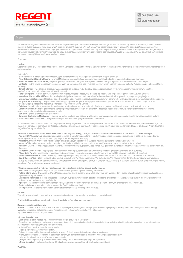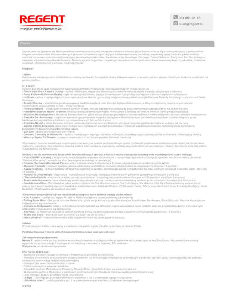 061 851-31-18 [email protected] Program Zapraszamy na Sylwestra do Mediolanu! Miasta o niepowtarzalnym i niezwykle urokliwym klimacie, gdzie historia miesza się z nowoczesnością, a jednocześnie biegnie z duchem czasu. Miasto cudownych skarbów architektonicznych ukrytych wśród nowoczesnej zabudowy, wspaniałej opery La Scala, galerii wielkich mistrzów malarstwa, salonów najsłynniejszych światowych projektantów i kreatorów mody Armaniego, Gucciego, Dolce&Gabbana, Prady oraz San Siro jednego z największych stadionów piłkarskich świata. To także symbol bogactwa i rozrywki, gdzie można dobrze zjeść, skosztować wspaniałej kawy, czy drinków, doskonale się bawić i chłonąć klimat wielkiego, modnego miasta. Program: 1 dzień: Odprawa na lotnisku i przelot do Mediolanu – stolicy Lombardii. Przejazd do hotelu. Zakwaterowanie, czas wolny na korzystanie z lokalnych atrakcji w zależności od godzin przylotu. 2 - 3 dzień: Kolejne dwa dni to czas na poznanie fascynującej atmosfery miasta oraz jego najważniejszych miejsc, takich jak - Plac Katedralny i Katedra Duomo – symbol Mediolanu, wspaniała, fascynująca i monumentalna budowla w całości zbudowana z marmuru - Pałac Królewski (Palazzo Reale) – była rezydencja królewska, będąca dziś miejscem najsłynniejszych wystaw i ważnych wydarzeń kulturalnych - La Scala – jedna z najsłynniejszych scen operowych na świecie, gdzie miały miejsce premiery takich oper jak Madame Butterfly Pucciniego czy Nabucco i Otello Verdiego - Zamek Sforzów – wielokrotnie przebudowywana siedziba książęca rodu Sforzów, będąca dziś muzeum, w którym znajdziemy między innymi ostatnie nieukończone dzieło Michała Anioła – Pieta Rondanini - Parco Sempione – uroczy park w samym centrum miasta, miejsce odpoczynku z okazją do podziwiania imponującego widoku na Zamek Sforzów - Narodowe Muzeum Nauki i Techniki z wielką kolekcją drewnianych modeli, wynalazków Leonarda da Vinci, w tym m.in. słynną maszyną latającą - Muzeum Archeologiczne w klasztorze benedyktyńskim, gdzie można zobaczyć pozostałości murów obronnych i wiele znalezisk z różnych okresów historycznych - Bazylika Św. Ambrożego z kaplicami reprezentującymi prawie wszystkie istniejące w Mediolanie style, od neoklasycznych form Ludwika Gagnola, przez barokową kopułę ozdobioną freskami, po renesansowy styl Bernardino Lanino - Dzielnica Navigli z siecią kanałów, licznymi restauracyjkami oraz nocnymi klubami, oferująca bogactwo możliwości zarówno w dzień, jak i w nocy - Galeria Vittorio Emanuele, gdzie można ubrać się u najlepszych włoskich projektantów i zobaczyć wspaniałą konstrukcję architektoniczną zwieńczoną przeszklonym dachem i charakterystyczną kopułą - San Siro – gratka dla miłośników piłki nożnej - Dworzec Centralny w Mediolanie – jeden z największych tego typu obiektów w Europie, charakteryzujący się niepospolitą architekturą i interesującą historią - Wieczny Szpital Ca'Granda, dzisiejszy uniwersytet z dziedzińcem projektu Daniela Libeskinda W przerwach podczas zwiedzania proponujemy czas wolny na posiłek, podczas którego będzie możliwość spróbowania włoskich potraw, takich jak słynne pizze, makarony, panettone, cannelloni czy focaccia, a także posmakowania wyśmienitej włoskiej kawy oraz lokalnych win, Campari, Grappy, Martini czy Amaretto (płatne indywidualnie wg zamówienia). Mediolan ma do zaoferowania także wiele innych ciekawych atrakcji, z których można skorzystać fakultatywnie w zależności od czasu wolnego: - Kościół NMP Łaskawej, z którym związana jest legenda o powstaniu panettone – najsłynniejszego mediolańskiego przysmaku, w kościele można podziwiać "Ostatnią Wieczerzę" Leonarda da Vinci (wymagana wcześniejsza rezerwacja) - Klasztor Kartuzów (Certosa di Pavia) - jeden z najokazalszych klasztorów w Europie, najpiękniejsza renesansowa perła Włoch - Muzeum Triennale - muzeum designu, włoska urbanistyka, architektura, muzyka i sztuka mediów w nowoczesnym stylu (ok. 14 euro/os.) - Acquario Civico – jedno z najstarszych tego typu obiektów w Europie, prezentujące ponad 100 gatunków zwierząt wodnych włoskiego wybrzeża, jezior i rzek (ok. 15 euro/os.) - Planetario Ulrico Hoepli – największe i najważniejsze w Europie, zachwyca niesamowitymi pokazami gwiezdnego świata (ok. 5 euro/os.) - l'Oasi delle Farfalle - motylarnia, w której pomiędzy orchideami i innymi egzotycznymi roślinami lata ponad 250 pięknych motyli (ok. 5 euro/os.) - Teatro delle Marionette - teatr kukiełkowy posiadający długie tradycje i bardzo chętnie odwiedzany zarówno przez dzieci jak i dorosłych (od 20 euro/os.) - Quadrilatero d’Oro – Złoty Kwadrat, gdzie wzdłuż czterech ulic Via Montenapoleone, Via Della Spiga, Via Manzoni i Via Sant’Andrea możemy wybrać się na zakupy do znanych butików słynnych włoskich projektantów mody, takich jak Chanel, LV, Chopard, Gucci i Tiffany oraz Gianfranco Ferre, Ermenegildo Zegny, Fendi, Moschino i Prady (płatne we własnym zakresie) Wieczorami proponujemy słynne mediolańskie rozrywki, które świetnie oddają ducha miasta: - Klub Alcatraz - największa "wyspa Muzyki" w Mediolanie (płatne indywidualnie wg zamówienia) - Rolling Stone Milan - Świątynia rock'a w Mediolanie, gdzie swoje koncerty grały takie sławy jak: Iron Maiden, Ben Harper, Black Sabbath i Massive Attack (płatne indywidualnie wg zamówienia) - Dyskoteka Hollywood to jedna z najbardziej znanych dyskotek we Włoszech, często odwiedzana przez modelki, aktorów, projektantów mody i wielu sławnych ludzi(płatne indywidualnie wg zamówienia) - Aperitivo – w niektórych lokalach w ramach opłaty za drinka, możemy korzystać z bufetu z ciepłymi i zimnymi przekąskami (ok. 10 euro/os.) - Teatro alla Scala – opera lub balet w słynnej "La Scali" (od 20 euro/os.) - Mecz piłkarski – niesamowite wrażenia dla wszystkich fanów ligi w