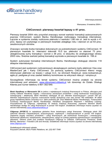 Informacja prasowa Warszawa, 6 kwietnia 2004 r. CitiConnect: pierwszy kwartał lepszy o 41 proc. Pierwszy kwartał 2004 roku przyniósł znaczący wzrost wartości transakcji autoryzowanych poprzez CitiConnect, system Banku Handlowego rozliczający transakcje internetowe. Łącznie w systemie zostały rozliczone płatności o wartości 1,66 mln zł. Jest to wynik o 41 proc. lepszy od uzykanego w pierwszym kwartale ubiegłego roku i stanowi on aż 63 proc. zeszłorocznych obrotów. Znacząco wzrosła liczba transakcji dokonanych za pośrednictwem systemu CitiConnect. W pierwszym kwartale br. internauci dokonali 10,5 tys. płatności co stanowi 73 proc. ubiegłorocznej sumy transakcji i wzrost o 36 proc. w stosunku do analogicznego okresu 2003 roku. Średnia wartość jednej transakcji wyniosła w pierwszym kwartale br. 158 zł. System autoryzacji transakcji internetowych Banku Handlowego obsługuje obecnie 118 sklepów internetowych. CitiConnect jest systemem rozliczeniowym akceptującym zarówno karty płatnicze Visa oraz MasterCard jak i Karty CitiConnect. Za pomocą systemu CitiConnect klienci mogą dokonywać płatności za towary i usługi m.in. na stronach flowers.pl, www.rockserwis.pl, agito.pl, pedigree.pl oraz zasilać telefony komórkowe na witrynach idea.pl. i simplus.pl. Szczegółowe informacje na temat systemu CitiConnect można znaleźć na stronie internetowej pod adresem: www.citiconnect.citibank.pl lub dzwoniąc do Działu Obsługi Klienta pod numer telefonu 0-801 302 649. *** Bank Handlowy w Warszawie SA to jedna z największych instytucji finansowych w Polsce, oferująca pod marką Citibank Handlowy bogaty i nowoczesny asortyment produktów i usług bankowości korporacyjnej, inwestycyjnej i detalicznej. Bank Handlowy obsługuje 20 tys. klientów korporacyjnych i ponad 750 tys. klientów indywidualnych poprzez nowoczesne kanały dystrybucji oraz sieć ponad 160 oddziałów. W skład grupy kapitałowej Banku wchodzą m.in. takie podmioty jak: Dom Maklerski Banku Handlowego, Towarzystwo Funduszy Inwestycyjnych Banku Handlowego, Handlowy Zarządzanie Aktywami i Handlowy Leasing. Przynależność do Citigroup, największej na świecie instytucji finansowej, zapewnia klientom Banku Handlowego dostęp do usług finansowych w ponad 100 krajach. Dodatkowe informacje można uzyskać na stronie internetowej www.citibankhandlowy.pl Citigroup (NYSE:C) to największa globalna firma świadcząca usługi finansowe. Obsługuje około 200 milionów klientów indywidualnych, korporacyjnych, rządowych i instytucjonalnych w ponad 100 krajach. Zapewnia bogaty wachlarz produktów i usług finansowych, jak bankowość komercyjna i inwestycyjna, bankowość detaliczna, kredytowanie, ubezpieczenia, usługi na rynków papierów wartościowych i zarządzanie aktywami. Główne marki pod znakiem handlowym Citigroup to Citibank, CitiFinancial, Primerica, Smith Barney, Banamex i Travelers Life and Annuity. Dodatkowe informacje można uzyskać na stronie internetowej www.citigroup.com Dodatkowych informacji udziela: Krzysztof Litwinek, Biuro Public Relations, tel. (22) 657 7548