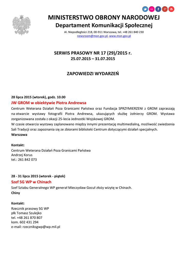 MINISTERSTWO OBRONY NARODOWEJ Departament Komunikacji Społecznej Al. Niepodległości 218, 00-911 Warszawa, tel. +48 261 840 230 [email protected], www.mon.gov.pl SERWIS PRASOWY NR 17 (29)/2015 r. 25.07.2015 – 31.07.2015 ZAPOWIEDZI WYDARZEŃ 28 lipca 2015 (wtorek), godz. 10.00 JW GROM w obiektywie Piotra Andrewsa Centrum Weterana Działań Poza Granicami Państwa oraz Fundacja SPRZYMIERZENI z GROM zapraszają na otwarcie wystawy fotografii Piotra Andrewsa, ukazujących służbę żołnierzy GROM. Wystawa zorganizowana została z okazji 25-lecia Jednostki Wojskowej GROM. W czasie otwarcia wystawy zaplanowano między innymi prezentację multimedialną, możliwość zwiedzenia Sali Tradycji oraz zapoznania się ze zbiorami biblioteki Centrum dotyczącymi działań specjalnych. Warszawa Kontakt: Centrum Weterana Działań Poza Granicami Państwa Andrzej Korus tel.: 261 842 073 28 - 31 lipca 2015 (wtorek - piątek) Szef SG WP w Chinach Szef Sztabu Generalnego WP generał Mieczysław Gocuł złoży wizytę w Chinach. Chiny Kontakt: Rzecznik prasowy SG WP płk Tomasz Szulejko tel. +48 261 870 807 kom. 602 431 294 e-mail: [email protected] 30 lipca 2015 (czwartek), godz. 11.00 Spotkanie z powstańcami warszawskimi Podsekretarz stanu w MON Maciej Jankowski będzie uczestniczył w spotkaniu powstańców warszawskich z prezydentem Bronisławem Komorowskim i prezydent m.st. Warszawy Hanną Gronkiewicz-Waltz. Wstęp z zaproszeniem. Warszawa, Park Wolności przy Muzeum Powstania Warszawskiego Kontakt: Biuro Prasowe KPRP tel. (48 22) 695 10 70 mail: [email protected] 30-31 lipca 2015 (czwartek - piątek) Święto 2 Brygady Zmechanizowanej W 2 Brygadzie Zmechanizowanej odbędą się uroczystości z okazji święta jednostki, które przypada 28 lipca. Złocieniec Kontakt: Oficer prasowy 2BZ kpt. Sebastian Stawiński tel. 727 012 810 e-mail:[email protected] 31 lipca 2015 (piątek), godz. 19.00 Uroczystości z okazji 71. rocznicy wybuchu Powstania Warszawskiego Podsekretarz stanu w MON Maciej Jankowski weźmie udział w uroczystych obchodach 71. rocznicy wybuchu Powstania Warszawskiego. Podczas uroczystości odczytany zostanie Apel Poległych. Wcześniej, o godz. 18.00, w intencji powstańców, zostanie odprawiona msza św. Warszawa, plac Krasińskich (przy pomniku Bohaterów Powstania Warszawskiego) Kontakt: Rzecznik prasowy DGW ppłk Joanna Klejszmit-Bodziuch tel. 261 879102; 721810749 e-mail: [email protected] 1 sierpnia 2015 (sobota) 71. rocznica wybuchu Powstania Warszawskiego W garnizonach na terenie całego kraju odbędą się uroczystości upamiętniające 71. rocznicę wybuchu Powstania Warszawskiego. Centralne obchody odbędą się w Warszawie. Szczegóły w oddzielnym komunikacie. Terytorium RP Kontakt: Departament Komunikacji Społecznej tel.+48 261 840 230 e-mail: [email protected] KRONIKA 19 lipca 2015 (niedziela) Mecz GORTAT TEAM vs WOJSKO POLSKIE 73:69 takim wynikiem zakończył się czwarty w historii mecz „Gortat Team vs Wojsko Polskie”. Tym razem lepsza okazała się drużyna naszego koszykarza z NBA, która czterema punktami pokonała żołnierzy. Więcej… 21 lipca 2015 (wtorek) Muzeum Historii Polski powstanie w Cytadeli Wicepremier, minister obrony narodowej Tomasz Siemoniak oraz minister kultury i dziedzictwa narodowego prof. Małgorzata Omilanowska - podpisali list intencyjny ws. utworzenia Muzeum Historii Polski i Muzeum Wojska Polskiego w warszawskiej Cytadeli. Więcej… 23 lipca 2015 (czwartek) 2% PKB na obronę od 2016 r. Prezydent RP, Zwierzchnik Sił Zbrojnych Bronisław Komorowski podpisał ustawę o zmianie ustawy o przebudowie i modernizacji technicznej oraz finansowaniu Sił Zbrojnych Rzeczypospolitej Polskiej oraz ustawy o finansach publicznych, zwiększającą od 2016 roku budżet obronny do poziomu co najmniej 2 proc. PKB. Więcej… 24 lipca 2015 (piątek) Wicepremier Tomasz Siemoniak z wizytą na Ukrainie W piątek, 24 lipca, wicepremier, minister obrony narodowej Tomasz Siemoniak przebywał na Ukrainie, gdzie spotkał się z ministrem obrony Ukrainy gen. broni Stepanem Poltorakiem oraz ministrem obrony Litwy ministrem Juozasem Olekasem. Więcej…