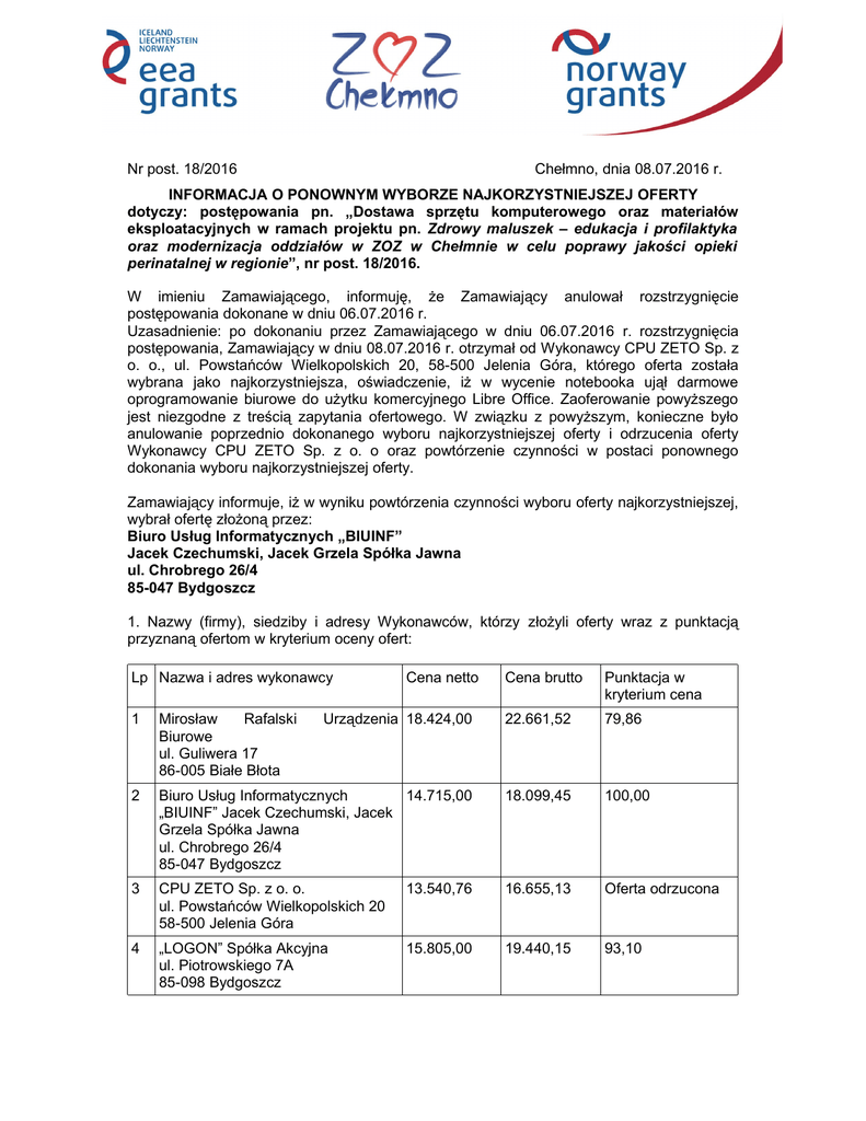 Nr post. 18/2016 Chełmno, dnia 08.07.2016 r. INFORMACJA O PONOWNYM WYBORZE NAJKORZYSTNIEJSZEJ OFERTY dotyczy: postępowania pn. „Dostawa sprzętu komputerowego oraz materiałów eksploatacyjnych w ramach projektu pn. Zdrowy maluszek – edukacja i profilaktyka oraz modernizacja oddziałów w ZOZ w Chełmnie w celu poprawy jakości opieki perinatalnej w regionie”, nr post. 18/2016. W imieniu Zamawiającego, informuję, że Zamawiający anulował rozstrzygnięcie postępowania dokonane w dniu 06.07.2016 r. Uzasadnienie: po dokonaniu przez Zamawiającego w dniu 06.07.2016 r. rozstrzygnięcia postępowania, Zamawiający w dniu 08.07.2016 r. otrzymał od Wykonawcy CPU ZETO Sp. z o. o., ul. Powstańców Wielkopolskich 20, 58-500 Jelenia Góra, którego oferta została wybrana jako najkorzystniejsza, oświadczenie, iż w wycenie notebooka ujął darmowe oprogramowanie biurowe do użytku komercyjnego Libre Office. Zaoferowanie powyższego jest niezgodne z treścią zapytania ofertowego. W związku z powyższym, konieczne było anulowanie poprzednio dokonanego wyboru najkorzystniejszej oferty i odrzucenia oferty Wykonawcy CPU ZETO Sp. z o. o oraz powtórzenie czynności w postaci ponownego dokonania wyboru najkorzystniejszej oferty. Zamawiający informuje, iż w wyniku powtórzenia czynności wyboru oferty najkorzystniejszej, wybrał ofertę złożoną przez: Biuro Usług Informatycznych „BIUINF” Jacek Czechumski, Jacek Grzela Spółka Jawna ul. Chrobrego 26/4 85-047 Bydgoszcz 1. Nazwy (firmy), siedziby i adresy Wykonawców, którzy złożyli oferty wraz z punktacją przyznaną ofertom w kryterium oceny ofert: Lp Nazwa i adres wykonawcy Cena netto Cena brutto Punktacja w kryterium cena 1 Mirosław Rafalski Biurowe ul. Guliwera 17 86-005 Białe Błota Urządzenia 18.424,00 22.661,52 79,86 2 Biuro Usług Informatycznych 14.715,00 „BIUINF” Jacek Czechumski, Jacek Grzela Spółka Jawna ul. Chrobrego 26/4 85-047 Bydgoszcz 18.099,45 100,00 3 CPU ZETO Sp. z o. o. ul. Powstańców Wielkopolskich 20 58-500 Jelenia Góra 13.540,76 16.655,13 Oferta odrzucona 4 „LOGON” Spółka Akcyjna ul. Piotrowskiego 7A 85-098 Bydgoszcz 15.805,00 19.440,15 93,10 2. Uzasadnienie wyboru oferty najkorzystniejszej: − wybrano ofertę najkorzystniejszą z punktu widzenia kryterium oceny ofert i spełniającą wszystkie warunki określone w zapytaniu ofertowym. 3. Postępowanie prowadził/a: Grażyna Marcinkowska, Andrzej Pawlik 4. Podpisanie umowy nastąpi w dniu 13.07.2016 r. Grażyna Marcinkowska, Andrzej Pawlik 08.07.2016 r. (data, podpis pracownika merytorycznego) Zatwierdzam Dyrektor Zespołu Opieki Zdrowotnej w Chełmnie Mariola Burc 08.07.2016 r. (Data i podpis Kierownika zamawiającego)