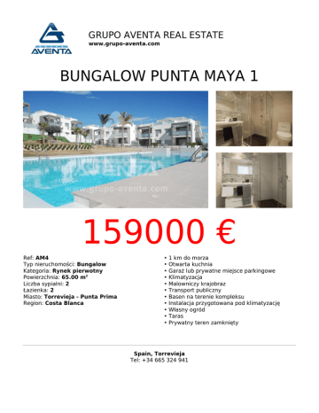 GRUPO AVENTA REAL ESTATE www.grupo-aventa.com BUNGALOW PUNTA MAYA 1 159000 € Ref: AM4 Typ nieruchomości: Bungalow Kategoria: Rynek pierwotny Powierzchnia: 65.00 m2 Liczba sypialni: 2 Łazienka: 2 Miasto: Torrevieja - Punta Prima Region: Costa Blanca • 1 km do morza • Otwarta kuchnia • Garaż lub prywatne miejsce parkingowe • Klimatyzacja • Malowniczy krajobraz • Transport publiczny • Basen na terenie kompleksu • Instalacja przygotowana pod klimatyzację • Własny ogród • Taras • Prywatny teren zamknięty Spain, Torrevieja Tel: +34 665 324 941