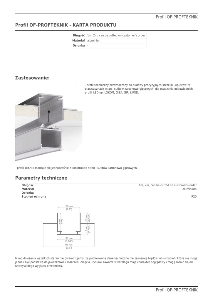 Profil OF-PROFTEKNIK Profil OF-PROFTEKNIK - KARTA PRODUKTU Długość 1m, 2m, can be cutted on customer's order Materiał aluminium Osłonka - Zastosowanie: - profil techniczny przeznaczony do budowy precyzyjnych szczelin (wpustów) w płaszczyznach ścian i sufitów kartonowo-gipsowych, dla osadzania odpowiednich profili LED np. LOKOM, GIZA, GIP, LIPOD. - profil TEKNIK montuje się jednocześnie z konstrukcją ścian i sufitów kartonowo-gipsowych. Parametry techniczne Długość Materiał Osłonka Stopień ochrony 1m, 2m, can be cutted on customer's order aluminium IP20 Mimo dołożenia wszelkich starań nie gwarantujemy, że publikowane dane techniczne nie zawierają błędów lub uchybień, które nie mogą jednak być podstawą do jakichkolwiek roszczeń. Zdjęcia i rysunki zawarte w katalogu mają charakter poglądowy i mogą różnić się od rzeczywistego wyglądu przedmiotu. Profil OF-PROFTEKNIK