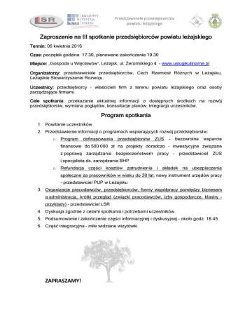 Zaproszenie na III spotkanie przedsiębiorców powiatu leżajskiego Termin: 06 kwietnia 2016 Czas: początek godzina 17.30, planowane zakończenie 19.30 Miejsce: „Gospoda u Więcławów”, Leżajsk, ul. Żeromskiego 4 - www.uslugikulinarne.pl Organizatorzy: przedstawiciele przedsiębiorców, Cech Rzemiosł Różnych w Leżajsku, Leżajskie Stowarzyszenie Rozwoju. Uczestnicy: przedsiębiorcy – właścicieli firm z terenu powiatu leżajskiego oraz osoby zarządzające firmami. Cele spotkania: przekazanie aktualnej informacji o dostępnych środkach na rozwój przedsiębiorstw, wymiana poglądów, konsultacje planów, integracja uczestników. Program spotkania 1. Powitanie uczestników 2. Przedstawienie informacji o programach wspierających rozwój przedsiębiorstw: o Program dofinasowania przedsiębiorstw ZUS – bezzwrotne wsparcie finansowe do 500 000 zł na projekty doradczo – inwestycyjne związane z poprawą zarządzania bezpieczeństwem pracy – przedstawiciel ZUS i specjalista ds. zarządzania BHP o Refundacja części kosztów zatrudnienia i składek na ubezpieczenia społeczne za pracowników w wieku do 30 lat, nowy instrument urzędów pracy - przedstawiciel PUP w Leżajsku 3. Organizacje pracodawców, przedsiębiorców, formy współpracy pomiędzy biznesem a administracją, krótki przegląd (związki pracodawców, izby gospodarcze, klastry – przykłady) – przedstawiciel LSR 4. Dyskusja zgodnie z celami spotkania i potrzebami uczestników. 5. Podsumowanie i zakończenie części informacyjnej i dyskusyjnej - około godz. 18.45 6. Część integracyjna – mile widziane wizytówki. ZAPRASZAMY!