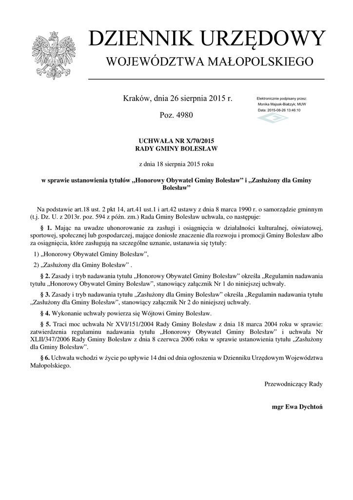 DZIENNIK URZĘDOWY WOJEWÓDZTWA MAŁOPOLSKIEGO Kraków, dnia 26 sierpnia 2015 r. Elektronicznie podpisany przez: Monika Majsak-Białczyk; MUW Poz. 4980 Data: 2015-08-26 13:46:10 UCHWAŁA NR X/70/2015 RADY GMINY BOLESŁAW z dnia 18 sierpnia 2015 roku w sprawie ustanowienia tytułów „Honorowy Obywatel Gminy Bolesław” i „Zasłużony dla Gminy Bolesław” Na podstawie art.18 ust. 2 pkt 14, art.41 ust.1 i art.42 ustawy z dnia 8 marca 1990 r. o samorządzie gminnym (t.j. Dz. U. z 2013r. poz. 594 z późn. zm.) Rada Gminy Bolesław uchwala, co następuje: § 1. Mając na uwadze uhonorowanie za zasługi i osiągnięcia w działalności kulturalnej, oświatowej, sportowej, społecznej lub gospodarczej, mające doniosłe znaczenie dla rozwoju i promocji Gminy Bolesław albo za osiągnięcia, które zasługują na szczególne uznanie, ustanawia się tytuły: 1) „Honorowy Obywatel Gminy Bolesław”, 2) „Zasłużony dla Gminy Bolesław” . § 2. Zasady i tryb nadawania tytułu „Honorowy Obywatel Gminy Bolesław” określa „Regulamin nadawania tytułu „Honorowy Obywatel Gminy Bolesław”, stanowiący załącznik Nr 1 do niniejszej uchwały. § 3. Zasady i tryb nadawania tytułu „Zasłużony dla Gminy Bolesław” określa „Regulamin nadawania tytułu „Zasłużony dla Gminy Bolesław”, stanowiący załącznik Nr 2 do niniejszej uchwały. § 4. Wykonanie uchwały powierza się Wójtowi Gminy Bolesław. § 5. Traci moc uchwała Nr XVI/151/2004 Rady Gminy Bolesław z dnia 18 marca 2004 roku w sprawie: zatwierdzenia regulaminu nadawania tytułu „Honorowy Obywatel Gminy Bolesław” i uchwała Nr XLII/347/2006 Rady Gminy Bolesław z dnia 8 czerwca 2006 roku w sprawie ustanowienia tytułu „Zasłużony dla Gminy Bolesław”. § 6. Uchwała wchodzi w życie po upływie 14 dni od dnia ogłoszenia w Dzienniku Urzędowym Województwa Małopolskiego. Przewodniczący Rady mgr Ewa Dychtoń Dziennik Urzędowy Województwa Małopolskiego –2– Poz. 4980 Załącznik Nr 1 do Uchwały Nr X/70/2015 Rady Gminy Bolesław z dnia 18 sierpnia 2015 r. Regulamin nadawania tytułu „Honorowy Obywatel Gminy Bolesław” § 1. 1. Tytuł „Honorowy Obywatel Gminy Bolesław”jest wyrazem szczególnego wyróżnienia i uznania. 2. Tytuły „Honorowy Obywatel Gminy Bolesław” może otrzymać osoba pełnoletnia, która: 1) w istotnym stopniu przyczyniła się lub przyczynia się do kulturalnego, gospodarczego lub społecznego rozwoju gminy Bolesław, 2) w istotny sposób przyczyniła się lub przyczynia do budowania prestiżu, popularyzacji wiedzy, historii i walorów Gminy Bolesław, 3) posiada uznany i wyróżniajacy się dorobek twórczy w szczególności w sferze artystycznej, naukowej lub społecznej. § 2. 1. Tytuł„Honorowy Obywatel Gminy Bolesław” nadaje Rada Gminy Bolesław w formie uchwały. 2. Z wnioskiem w sprawie przyznania w/w tytułu może wystąpić: 1) Wójt Gminy Bolesław, 2) klub radnych lub grupa radnych posiadających inicjatywę uchwałodawczą, 3) jednostka pomocnicza Gminy, 4) partia polityczna, stowarzyszenie oraz organizacja związkowa działająca na terenie Gminy Bolesław, 5) grupa mieszkańców licząca nie mniej niż 50 osób. 3. Wniosek musi być szczegółowo uzasadniony, a w przypadkach określonych w ust. 2 pkt 3) i pkt 4) do wniosku musi być dołączona stosowna uchwała władz statutowych. 4. Wniosek składa się Przewodniczącemu Rady Gminy Bolesław, który następnie wniosek kieruje na posiedzenia stałych Komisji Rady Gminy. 5. Po uzyskaniu pozytywnych opinii stałych Komisji Rady Gminy, Przewodniczący Rady Gminy kieruje wniosek do Wójta, celem przygotowania projektu stosownej uchwały Rady Gminy. 6. Uchwałę w sprawie nadania tytułu „Honorowy Obywatel Gminy Bolesław”, Rada Gminy podejmuje na zwyczajnej sesji, zaś oficjalne nadanie tytułu następuje na uroczystej sesji Rady Gminy. 7. Nadanie tytułu „Honorowy Obywatel Gminy Bolesław” wiąże się z wręczeniem dyplomu „Honorowy Obywatel Gminy Bolesław” oraz jednorazowej nagrody rzeczowej ustalonej przez Wójta. 8. Tytuł „Honorowy Obywatel Gminy Bolesław” może być nadawany tej samej osobie tylko jeden raz. § 3. Ewidencję uhonorowanych tytułem „Honorowy Obywatel Gminy Bolesław” prowadzi Referat Organizacyjno - Administracyjny i Spraw Obywatelskich, który przechowuje także dokumentację związaną z nadawaniem w/w tytułu. § 4. Uchwała o nadaniu tytułu „Honorowy Obywatel Gminy Bolesław” podlega ogłoszeniu w prasie lokalnej. § 5. Koszty związane z nadaniem tytułu „Honorowy Obywatel Gminy Bolesław” pokrywane są z budżetu Gminy Bolesław. Przewodniczący Rady mgr Ewa Dychtoń Dziennik Urzędowy Województwa Małopolskiego –3– Poz. 4980 Załącznik Nr 2 do Uchwały Nr X/70/2015 Rady Gminy Bolesław z dnia 18 sierpnia 2015 r. Regulamin nadawania tytułu „Zasłużony dla Gminy Bolesław” § 1. 1. Tytuł „Zasłużony dla Gminy Bolesław” jest wyrazem wyróżnienia i uznania. 2. Tytuł „Zasłużony dla Gminy Bolesław” nadawany może być osobom fizycznym i prawnym oraz jednostkom nie posiadającym osobowości prawnej, które przyczyniły się do rozwoju, popularyzowania Gminy i tworzenia wspólnego dobra dla jej mieszkańców. § 2. 1. Tytuł „Zasłużony dla Gminy Bolesław” nadaje Rada Gminy Bolesław w formie uchwały. 2. Z wnioskiem w sprawie przyznania w/w tytułu może wystąpić: 1) Wójt Gminy, 2) klub radnych lub grupa radnych posiadających inicjatywę uchwałodawczą, 3) jednostka pomocnicza Gminy, 4) partia polityczna, stowarzyszenie oraz organizacja związkowa działająca na terenie Gminy Bolesław, 5) grupa mieszkańców licząca nie mniej niż 50 osób. 3. Wniosek musi być szczegółowo uzasadniony, a w przypadkach określonych w ust. 2 pkt 3) i pkt 4) do wniosku musi być dołączona stosowna uchwała władz statutowych. 4. Wniosek składa się Przewodniczącemu Rady Gminy Bolesław, który następnie wniosek kie