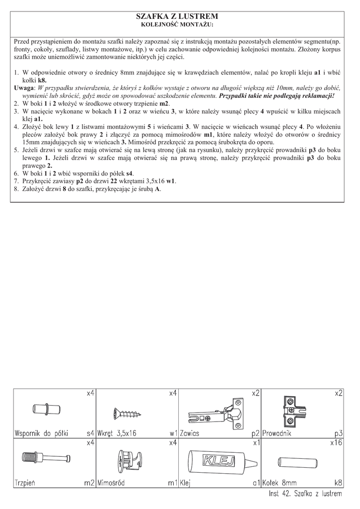 SZAFKA Z LUSTREM KOLEJNOŒÆ MONTA¯U: Przed przyst¹pieniem do monta¿u szafki nale¿y zapoznaæ siê z instrukcj¹ monta¿u pozosta³ych elementów segmentu(np. fronty, coko³y, szuflady, listwy monta¿owe, itp.) w celu zachowanie odpowiedniej kolejnoœci monta¿u. Z³o¿ony korpus szafki mo¿e uniemo¿liwiæ zamontowanie niektórych jej czêœci. 1. W odpowiednie otwory o œrednicy 8mm znajduj¹ce siê w krawêdziach elementów, nalaæ po kropli kleju a1 i wbiæ ko³ki k8. Uwaga: W przypadku stwierdzenia, ¿e któryœ z ko³ków wystaje z otworu na d³ugoœæ wiêksz¹ ni¿ 10mm, nale¿y go dobiæ, wymieniæ lub skróciæ, gdy¿ mo¿e on spowodowaæ uszkodzenie elementu. Przypadki takie nie podlegaj¹ reklamacji! 2. W boki 1 i 2 w³o¿yæ w œrodkowe otwory trzpienie m2. 3. W naciêcie wykonane w bokach 1 i 2 oraz w wieñcu 3, w które nale¿y wsun¹æ plecy 4 wpuœciæ w kilku miejscach klej a1. 4. Z³o¿yæ bok lewy 1 z listwami monta¿owymi 5 i wieñcami 3. W naciêcie w wieñcach wsun¹æ plecy 4. Po w³o¿eniu pleców za³o¿yæ bok prawy 2 i z³¹czyæ za pomoc¹ mimoœrodów m1, które nale¿y w³o¿yæ do otworów o œrednicy 15mm znajduj¹cych siê w wieñcach 3. Mimoœród przekrêciæ za pomoc¹ œrubokrêta do oporu. 5. Je¿eli drzwi w szafce maj¹ otwieraæ siê na lew¹ stronê (jak na rysunku), nale¿y przykrêciæ prowadniki p3 do boku lewego 1. Je¿eli drzwi w szafce maj¹ otwieraæ siê na praw¹ stronê, nale¿y przykrêciæ prowadniki p3 do boku prawego 2. 6. W boki 1 i 2 wbiæ wsporniki do pó³ek s4. 7. Przykrêciæ zawiasy p2 do drzwi 22 wkrêtami 3,5x16 w1. 8. Za³o¿yæ drzwi 8 do szafki, przykrêcaj¹c je œrub¹ A.