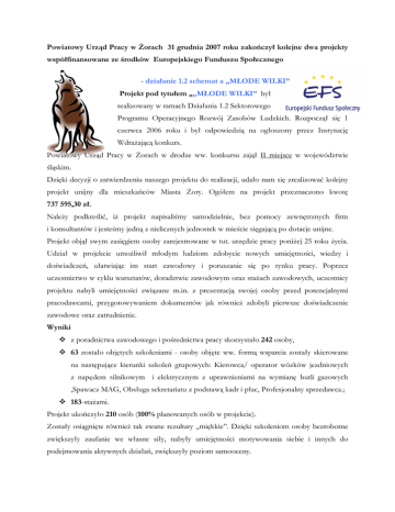 Powiatowy Urząd Pracy w śorach 31 grudnia 2007 roku zakończył kolejne dwa projekty współfinansowane ze środków Europejskiego Funduszu Społecznego - działanie 1.2 schemat a „MŁODE WILKI” Projekt pod tytułem „„MŁODE WILKI” był realizowany w ramach Działania 1.2 Sektorowego Programu Operacyjnego Rozwój Zasobów Ludzkich. Rozpoczął się 1 czerwca 2006 roku i był odpowiedzią na ogłoszony przez Instytucję WdraŜającą konkurs. Powiatowy Urząd Pracy w śorach w drodze ww. konkursu zajął II miejsce w województwie śląskim. Dzięki decyzji o zatwierdzeniu naszego projektu do realizacji, udało nam się zrealizować kolejny projekt unijny dla mieszkańców Miasta śory. Ogółem na projekt przeznaczono kwotę 737 595,30 zł. NaleŜy podkreślić, iŜ projekt napisaliśmy samodzielnie, bez pomocy zewnętrznych firm i konsultantów i jesteśmy jedną z nielicznych jednostek w mieście sięgającą po dotacje unijne. Projekt objął swym zasięgiem osoby zarejestrowane w tut. urzędzie pracy poniŜej 25 roku Ŝycia. Udział w projekcie umoŜliwił młodym ludziom zdobycie nowych umiejętności, wiedzy i doświadczeń, ułatwiając im start zawodowy i poruszanie się po rynku pracy. Poprzez uczestnictwo w cyklu warsztatów, doradztwie zawodowym oraz staŜach zawodowych, uczestnicy projektu nabyli umiejętności związane m.in. z prezentacją swojej osoby przed potencjalnymi pracodawcami, przygotowywaniem dokumentów jak równieŜ zdobyli pierwsze doświadczenie zawodowe oraz zatrudnienie. Wyniki z poradnictwa zawodowego i pośrednictwa pracy skorzystało 242 osoby, 63 zostało objętych szkoleniami - osoby objęte ww. formą wsparcia zostały skierowane na następujące kierunki szkoleń grupowych: Kierowca/ operator wózków jezdniowych z napędem silnikowym i elektrycznym z uprawnieniami na wymianę butli gazowych ,Spawacz MAG, Obsługa sekretariatu z podstawą kadr i płac, Profesjonalny sprzedawca.; 183-staŜami. Projekt ukończyło 210 osób (100% planowanych osób w projekcie). Zostały osiągnięte równieŜ tak zwane rezultaty „miękkie”. Dzięki szkoleniom osoby bezrobotne zwiększyły zaufanie we własne siły, nabyły umiejętności motywowania siebie i innych do podejmowania aktywnych działań, zwiększyły poziom samooceny. Unia Europejska wymaga, aby projekty z jej środków kończyły się efektywnością na poziomie około 25-30%. Niewątpliwym sukcesem projektu, jaki udało się osiągnąć jest przekroczenie tego wymaganego minimum. Efektywność projektu jest na poziomie 63,3 % Oznacza to, Ŝe 133 uczestników po zakończeniu swojego udziału w projekcie podjęło zatrudnienie. Status beneficjenta po zakończeniu Działania 1.2 „MŁODE WILKI” pozostawanie bez zatrudnienia 37% podjęcie zatrudnienia 63% - działanie 1.3 schemat a Projekt pod tytułem „CZAS NA ZMIANY” był realizowany w ramach Działania 1.3 Sektorowego Programu Operacyjnego Rozwój Zasobów Ludzkich. Rozpoczął się 1 czerwca 2006 roku i był odpowiedzią na ogłoszony przez Instytucję WdraŜającą konkurs tj. Wojewódzki Urząd Katowice. Dzięki decyzji o zatwierdzeniu naszego projektu do realizacji oraz zaangaŜowaniu pracowników urzędu udało się zrealizować projekt ze środków unijnych dla mieszkańców Miasta śory. Ogółem na ww. projekt przeznaczono kwotę 508 272,59 Jak wszystkie projekty na na duŜą skalę, projekt był napisany samodzielnie, bez pomocy zewnętrznych instytucji, jak równieŜ samodzielnie był monitorowany oraz rozliczany (w urzędzie pracuje 1 osoba na stanowisku specjalisty ds. programów) Projekt był skierowany do osób zarejestrowanych w PUP śory, ze szczególnym uwzględnieniem osób długotrwale bezrobotnych. Udział beneficjentów projekcie umoŜliwił im powrót na rynek pracy, pomógł w zdefiniowaniu własnych braków a poprzez wszechstronne wsparcie udało się zaktywizować osoby do tej pory bierne zawodowo. Oprócz wsparcia doradczego, osoby mogły skorzystać w ramach programu ze szkoleń, dotacji na działalność gospodarczą, co umoŜliwiło im zaistnienie na lokalnym rynku pracy jako przedsiębiorcom, jak równieŜ przygotowania zawodowego, które przyczyniło się do przezwycięŜenia barier które często się pojawiają przy długiej przerwie w zatrudnieniu. Wyniki z poradnictwa zawodowego i pośrednictwa pracy skorzystało 191 osoby, 87 zostało objętych szkoleniami - osoby objęte ww. formą wsparcia zostały skierowane na następujące kierunki szkoleń grupowych: kasy fiskalne; spawacz elektrycznygazowy,MAG; ABC przedsiębiorczości; pracownik biurowy z podstawą kadr i płac oraz programem PŁATNIK; uprawnienia SEP do 1 kV, ADR; kierowca kat C 105-przygotowaniem zawodowym, 11- doradztwo dla osób zamierzających rozpocząć działalność gospodarczą, 8- jednorazowe dotacje na podjęcie działalności gospodarczej Projekt ukończyło 159 osób (101,92% planowanych osób w projekcie). Zostały osiągnięte równieŜ tak zwane rezultaty „miękkie”. Dzięki poradnictwu zawodowemu osoby bezrobotne zwiększyły zaufanie we własne moŜliwości, otworzyły się na nowe szanse, poznały swoje słabe strony oraz metody przezwycięŜania ich. DuŜym sukcesem projektu, jaki udało się osiągnąć przy grupie osób znajdujących się w szczególnej sytuacji na rynku pracy, jest przekroczenie tego wymaganego minimum efektywności wg. UE. Efektywność projektu jest na poziomie 58,5 % Oznacza to, Ŝe aŜ 93 uczestników po zakończeniu swojego udziału w projekcie podjęło zatrudnienie. Status beneficjenta po zakończeniu Działania 1.3 „CZAS NA ZMIANY” pozostawanie bez zatrudnienia 42% podjęcie zatrudnienia 58% Powiatowy Urząd Pracy pozyskał dodatkowe środki z Funduszu Pracy na realizację nw. programów