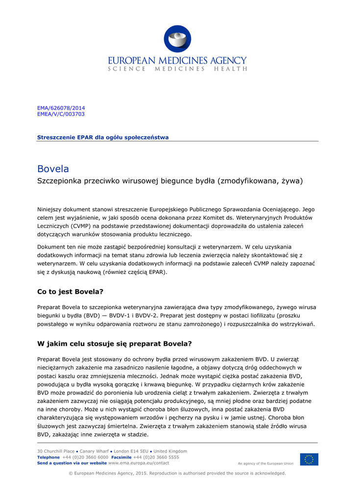 EMA/626078/2014 EMEA/V/C/003703 Streszczenie EPAR dla ogółu społeczeństwa Bovela Szczepionka przeciwko wirusowej biegunce bydła (zmodyfikowana, żywa) Niniejszy dokument stanowi streszczenie Europejskiego Publicznego Sprawozdania Oceniającego. Jego celem jest wyjaśnienie, w jaki sposób ocena dokonana przez Komitet ds. Weterynaryjnych Produktów Leczniczych (CVMP) na podstawie przedstawionej dokumentacji doprowadziła do ustalenia zaleceń dotyczących warunków stosowania produktu leczniczego. Dokument ten nie może zastąpić bezpośredniej konsultacji z weterynarzem. W celu uzyskania dodatkowych informacji na temat stanu zdrowia lub leczenia zwierzęcia należy skontaktować się z weterynarzem. W celu uzyskania dodatkowych informacji na podstawie zaleceń CVMP należy zapoznać się z dyskusją naukową (również częścią EPAR). Co to jest Bovela? Preparat Bovela to szczepionka weterynaryjna zawierająca dwa typy zmodyfikowanego, żywego wirusa biegunki u bydła (BVD) — BVDV-1 i BVDV-2. Preparat jest dostępny w postaci liofilizatu (proszku powstałego w wyniku odparowania roztworu ze stanu zamrożonego) i rozpuszczalnika do wstrzykiwań. W jakim celu stosuje się preparat Bovela? Preparat Bovela jest stosowany do ochrony bydła przed wirusowym zakażeniem BVD. U zwierząt nieciężarnych zakażenie ma zasadniczo nasilenie łagodne, a objawy dotyczą dróg oddechowych w postaci kaszlu oraz zmniejszenia mleczności. Jednak może wystąpić ciężka postać zakażenia BVD, powodująca u bydła wysoką gorączkę i krwawą biegunkę. W przypadku ciężarnych krów zakażenie BVD może prowadzić do poronienia lub urodzenia cieląt z trwałym zakażeniem. Zwierzęta z trwałym zakażeniem zazwyczaj nie osiągają potencjału produkcyjnego, są mniej płodne oraz bardziej podatne na inne choroby. Może u nich wystąpić choroba błon śluzowych, inna postać zakażenia BVD charakteryzująca się występowaniem wrzodów i pęcherzy na pysku i w jamie ustnej. Choroba błon śluzowych jest zazwyczaj śmiertelna. Zwierzęta z trwałym zakażeniem stanowią stałe źródło wirusa BVD, zakażając inne zwierzęta w stadzie. 30 Churchill Place ● Canary Wharf ● London E14 5EU ● United Kingdom Telephone +44 (0)20 3660 6000 Facsimile +44 (0)20 3660 5555 Send a question via our website www.ema.europa.eu/contact An agency of the European Union © European Medicines Agency, 2015. Reproduction is authorised provided the source is acknowledged. Szczepionkę podaje się bydłu w postaci pojedynczego wstrzyknięcia domięśniowego. Ochrona rozpoczyna się po trzech tygodniach od szczepienia i utrzymuje się przez rok. Aby nie dopuścić do urodzenia cieląt z trwałym zakażeniem, szczepionkę należy podać co najmniej trzy tygodnie przed unasiennieniem/kryciem. Jak działa preparat Bovela? Preparat Bovela jest szczepionką. Szczepionki działają poprzez „uczenie” układu odpornościowego (naturalnych mechanizmów obronnych organizmu) sposobów obrony przed chorobą. Preparat Bovela zawiera dwa szczepy (lub typy) BVDV zmodyfikowane przez delecję fragmentów dwóch genów uniemożliwiającą wywołanie choroby przez wirusa. Po podaniu preparatu Bovela bydłu układ odpornościowy zwierząt rozpoznaje szczepy wirusa jako struktury „obce” i wytwarza skierowane przeciwko nim przeciwciała. W przypadku narażenia na tego wirusa w przyszłości układ odpornościowy zwierzęcia będzie w stanie zareagować szybciej. Pomoże to w ochronie bydła przed zakażeniem BVD. Jak badano preparat Bovela? Skuteczność szczepionki badano najpierw w szeregu badań laboratoryjnych z udziałem bydła. Celem tych badań było ustalenie czasu potrzebnego do uzyskania pełnej ochrony bydła przed zakażeniem BVD, czasu trwania tej ochrony oraz wpływu przeciwciał matczynych (przeniesionych od matki) na skuteczność szczepionki u cieląt. Następnie skuteczność preparatu Bovela badano populacyjnie w ośmiu stadach bydła mlecznego, z których pięć wykazywało zakażenie BVD w wywiadzie lub zakażenie utrzymujące się na początku badania. Około połowę bydła zaszczepiono preparatem Bovela, a pozostałej części wstrzyknięto placebo. Główną miarą skuteczności było zmniejszenie się liczby nowo narodzonych, trwale zakażonych cieląt, co potwierdzono swoistymi testami identyfikacyjnymi wirusa. Jakie korzyści ze stosowania preparatu Bovela zaobserwowano w badaniach? W badaniach laboratoryjnych preparat Bovela ochronił 100% cieląt przed trwałym zakażeniem, natomiast zwierzęta, które nie otrzymały szczepionki, urodziły 100% cieląt z trwałym zakażeniem. W badaniu populacyjnym 98,5% zaszczepionych zwierząt objętych próbą (w zakresie 269– 274 zwierząt) wytworzyło przeciwciała przeciwko obu typom wirusa BVD. W grupie zwierząt zaszczepionych preparatem Bovela 5 z 1216 (0,4%) nowo narodzonych cieląt wykazywało trwałe zakażenie wirusem, natomiast w grupie zwierząt, którym wstrzyknięto placebo, trwałe zakażenie wykazywało 10 z 1183 nowo narodzonych cieląt (0,8%). Jednak w grupie zwierząt zaszczepionych zakażenie nastąpiło przed zaszczepieniem lub w okresie przed rozpoczęciem ochrony. Jakie ryzyko wiąże się ze stosowaniem preparatu Bovela? Najczęstsze działanie niepożądane związane ze stosowaniem preparatu Bovela (występujące u więcej niż 1 na 100 sztuk bydła) to zwiększenie temperatury ciała (mieszczące się w prawidłowym zakresie) w okresie czterech godzin po szczepieniu, który ustępuje samoistnie w ciągu 24 godzin. Bovela EMA/803038/2014 Strona 2/3 Jakie są środki ostrożności dla osoby, która podaje lek lub ma kontakt ze zwierzęciem? W razie przypadkowego zastosowania szczepionki u ludzi należy niezwłocznie zwrócić się o pomoc lekarską oraz przedstawić lekarzowi ulotkę informacyjną lub opakowanie. Jaki jest okres karencji? Okres karencji to czas, jaki powinien upłynąć od podania leku do momentu uboju zwierzęcia i poz