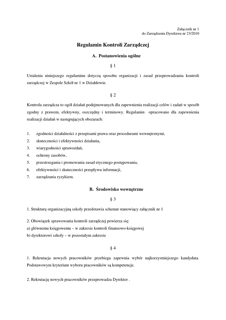 Załącznik nr 1 do Zarządzenia Dyrektora nr 23/2010 Regulamin Kontroli Zarządczej A. Postanowienia ogólne §1 Ustalenia niniejszego regulaminu dotyczą sposobu organizacji i zasad przeprowadzania kontroli zarządczej w Zespole Szkół nr 1 w Działdowie. §2 Kontrola zarządcza to ogół działań podejmowanych dla zapewnienia realizacji celów i zadań w sposób zgodny z prawem, efektywny, oszczędny i terminowy. Regulamin opracowano dla zapewnienia realizacji działań w następujących obszarach: 1. zgodności działalności z przepisami prawa oraz procedurami wewnętrznymi, 2. skuteczności i efektywności działania, 3. wiarygodności sprawozdań, 4. ochrony zasobów, 5. przestrzegania i promowania zasad etycznego postępowania, 6. efektywności i skuteczności przepływu informacji, 7. zarządzania ryzykiem. B. Środowisko wewnętrzne §3 1. Strukturę organizacyjną szkoły przedstawia schemat stanowiący załącznik nr 1 2. Obowiązek sprawowania kontroli zarządczej powierza się: a) głównemu księgowemu – w zakresie kontroli finansowo-księgowej b) dyrektorowi szkoły – w pozostałym zakresie §4 1. Rekrutacja nowych pracowników przebiega zapewnia wybór najkorzystniejszego kandydata. Podstawowym kryterium wyboru pracowników są kompetencje. 2. Rekrutację nowych pracowników przeprowadza Dyrektor . 3. Do komisji rekrutacyjnej Dyrektor może powołać innego pracownika Placówki celem wsparcia komisji rekrutacyjnej w zakresie wiedzy specjalistycznej. Dotyczy to szczególnie wyboru pracowników księgowości, gdzie członkiem komisji rekrutacyjnej może być główny księgowy. 4. Szczegółowe wymagania dotyczące nauczycielskich kwalifikacji zawiera Rozporządzenie Ministra Edukacji Narodowej z 12 marca 2009r. w sprawie szczegółowych kwalifikacji wymaganych od nauczycieli oraz określenia szkół i wypadków, w których można zatrudnić nauczycieli niemających wyższego wykształcenia lub ukończonego zakładu kształcenia nauczycieli (Dz. U. z 2009r. Nr 50, poz. 400 ze zm.). 5.Szczegółowe wymagania dotyczące kwalifikacji zatrudnionych w szkole pracowników samorządowych określa Rozporządzenie Rady Ministrów z dnia 18 marca 2009r. w sprawie wynagradzania pracowników samorządowych (Dz. U. z 2009r. Nr 50, poz. 398 ze zm.). 6. Każdemu pracownikowi szkoły przedstawiono na piśmie opis stanowiska pracy, określający zakres jego obowiązków, uprawnień i odpowiedzialności. Przyjęcie opisu stanowiska jest potwierdzone podpisem pracownika. 7. Od każdego zatrudnionego pracownika oczekuje się umiejętności i kompetencji w powierzonych mu obowiązkach służbowych. W sytuacjach braku wiedzy pracownika i trudnościami z wykonywaniem swoich obowiązków pracownik zobowiązany jest do podjęcia wszystkich możliwych kroków, by we własnym zakresie korzystać ze wszystkich możliwych źródeł udostępnionych przez pracodawcę, aby brakującą wiedzę uzupełnić. Jeżeli takie zachowanie nie jest skuteczne, stan taki należy zgłosić swojemu przełożonemu. §5 1. Praca nauczyciela w szkole podlega ocenie. Szczegółowe regulacje dotyczące przeprowadzenia oceny nauczyciela znajdują się w Rozporządzeniu Ministra Edukacji Narodowej z dnia 2 listopada 2000 r. w sprawie kryteriów i trybu dokonywania oceny pracy nauczyciela, trybu postępowania odwoławczego oraz składu i sposobu powoływania zespołu oceniającego (Dz. U. z 2000r. Nr 98, poz. 1066). 2. Ocenie podlega praca pracownika samorządowego zatrudnionego w Szkole. Szczegółowe zasady przeprowadzania ocen pracowników samorządowych określa załącznik nr 1 do zarządzenia Dyrektora Zespołu Szkół nr 1 w Działdowie Nr 9A/2009 z dnia 15.06.2009 C. Cele i zarządzanie ryzykiem §6 Misja szkoły określona została w Programie Rozwoju Zespołu Szkół nr 1 w Działdowie. §7 1.Cele i zadania szkoły są określane w rocznej perspektywie. Dokumentowane, konstruowane i skoordynowane z projektem planu finansowego sporządzanego na rok następny. 2. Cele szkoły na rok kolejny określa zespół w skład którego wchodzą: - dyrektor szkoły, - główny księgowy. 3.Zespół określa cele szkoły na rok kolejny w terminie do 31 stycznia każdego roku. 4.Wyznaczone przez zespół cele są określane w formie protokołu i wartościowane poprzez nadanie im priorytetów. §8 1. Raz w roku dokonywana jest identyfikacja i analiza ryzyk w odniesieniu do celów ustalonych w trybie określonym w § 7 regulaminu. Dokonuje jej zespół określony w § 7 ust. 2 2. Zarządzanie ryzykiem odbywa się poprzez: - identyfikację ryzyka, - monitorowanie realizacji zadań, - analizę ryzyka i podejmowanie działań zaradczych. 3. W procesie identyfikacji ryzyka wykorzystuje się ustalenia audytu wewnętrznego i zewnętrznego, wyniki ocen i kontroli. 4. O terminie przeprowadzenia identyfikacji ryzyk decyduje dyrektor szkoły. 5. Ponowna identyfikacja ryzyk jest przeprowadzana również przypadku istotnej zmiany warunków w których funkcjonuje szkoła. 6. O przeprowadzeniu ponownej identyfikacji ryzyka decyduje dyrektor szkoły. 7. Zidentyfikowane ryzyka są dokumentowane w formie Rejestru celów i ryzyk z określeniem możliwych skutków wystąpienia danego ryzyka. (np. ryzyko: utrata dochodu; brak dostatecznej kontroli nad obiadami wydawanymi pracownikom szkoły; skutek: brak wpływów na rachunek dochodów szkoły z tytułu opłat za te obiady mniejsze wpływy) §9 1. Dyrektor Szkoły i pozostali członkowie zespołu określonego w § 7 ust. 2 niniejszego regulaminu na postawie wyników analizy ryzyka i przewidywanych skutków wystąpienia danego ryzyka określają rodzaj możliwych reakcji na ryzyko (tolerowanie, przeniesienie, wycofanie się, działanie). 2. Członkowie zespołu określają działania, które należy podjąć w celu zmniejszenia danego ryzyka do akceptowanego poziomu. Opisy działań w reakcji na ryzyko są wpisywane w rejestrze celów i ryzyk. 3. Odpowiedzialność za realizację działań mający